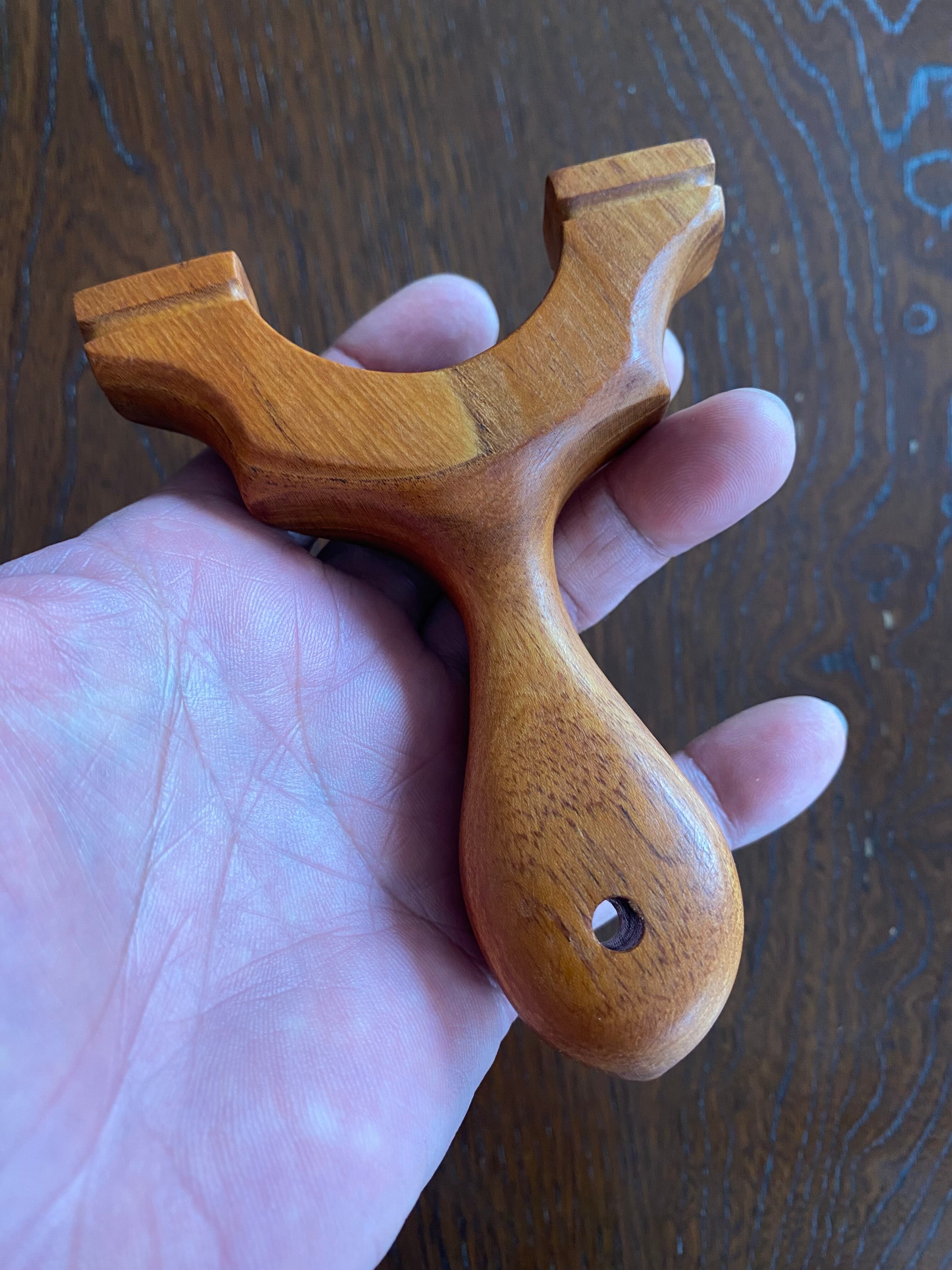 木材としては強度が2番目に硬い欅で作られているため、強度は充分でしっかりとした安定感を提供します。全体的に丸味のある仕上げが施されており、手に馴染む感触が嬉しいポイントです。見た目にも美しいスリングショットは、屋外活動や趣味の時間をより楽しいものにすることでしょう。
