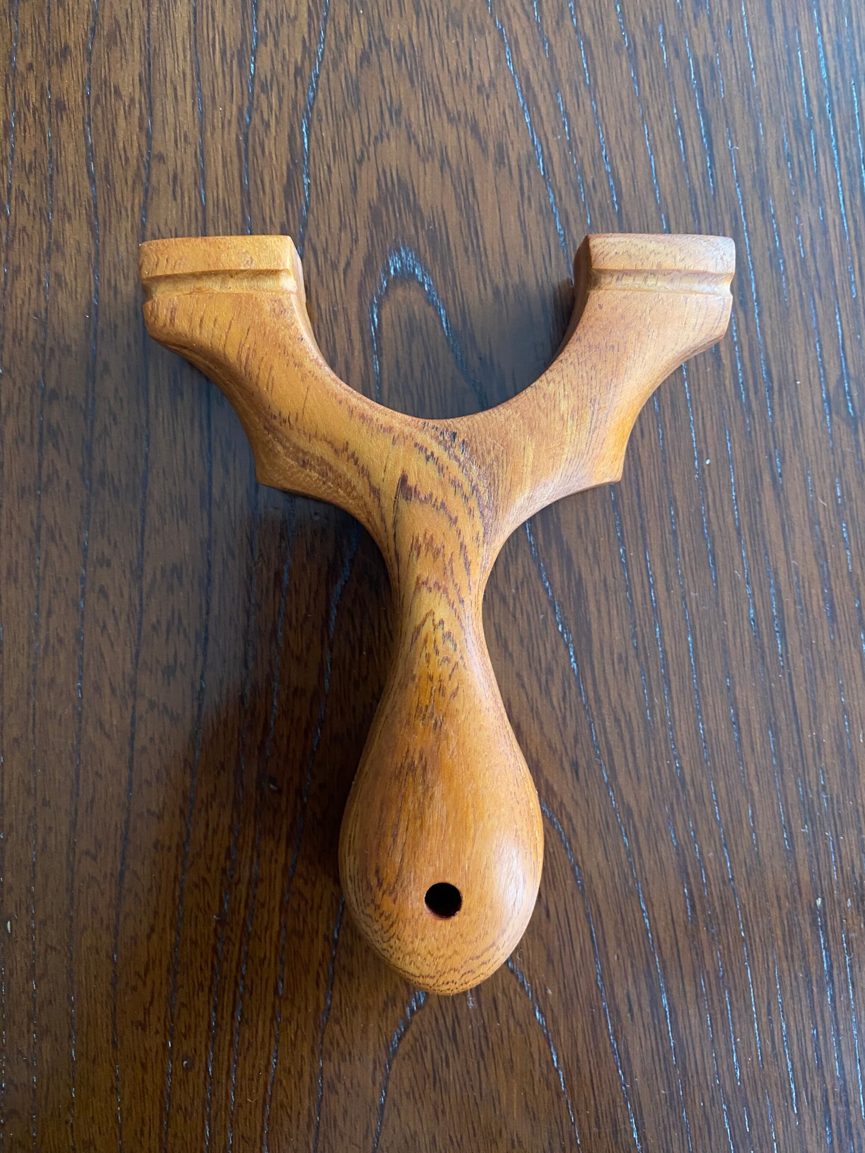 ■中級者にピッタリなNo.685 Open Branch Slingshotは、フォークが開き気味のデザインが特徴のスリングショットです。このユニークな形状が、スムーズな操作を実現し、フォークヒットのリスクを低減しています。全体的に抵抗感を極力排除した優しい手触りで、持ちやすさも抜群。初めての方でも安心してお使いいただけます。贅沢にも欅の無垢材からの切り出しの為、使い込むほどに味が出てきますので育てる楽しみもあります。仕上げは亜麻仁油+蜜蝋ですが、滑り止めや育てていくのは椿油、手の油など特にこだわらなくても大丈夫です。