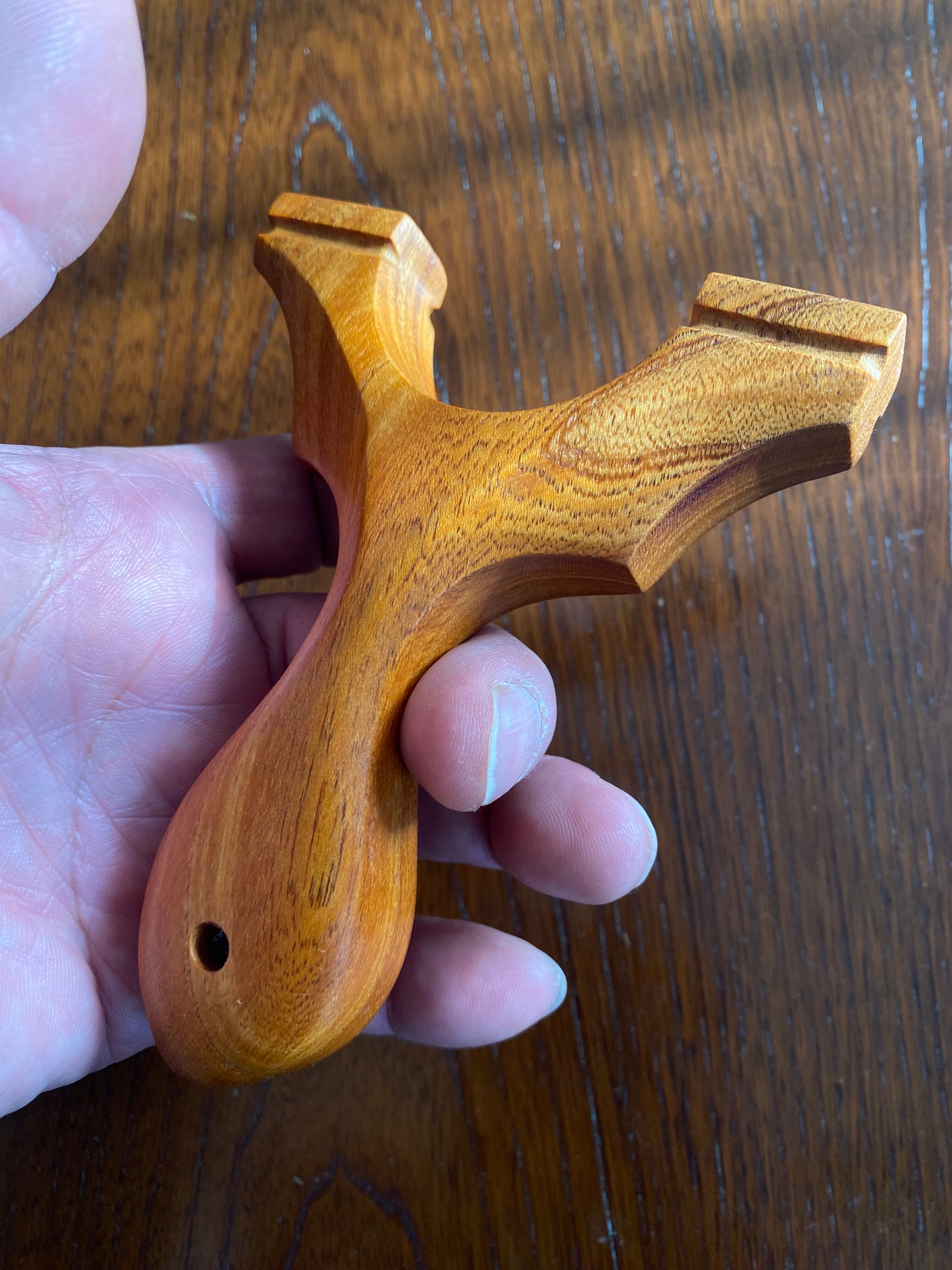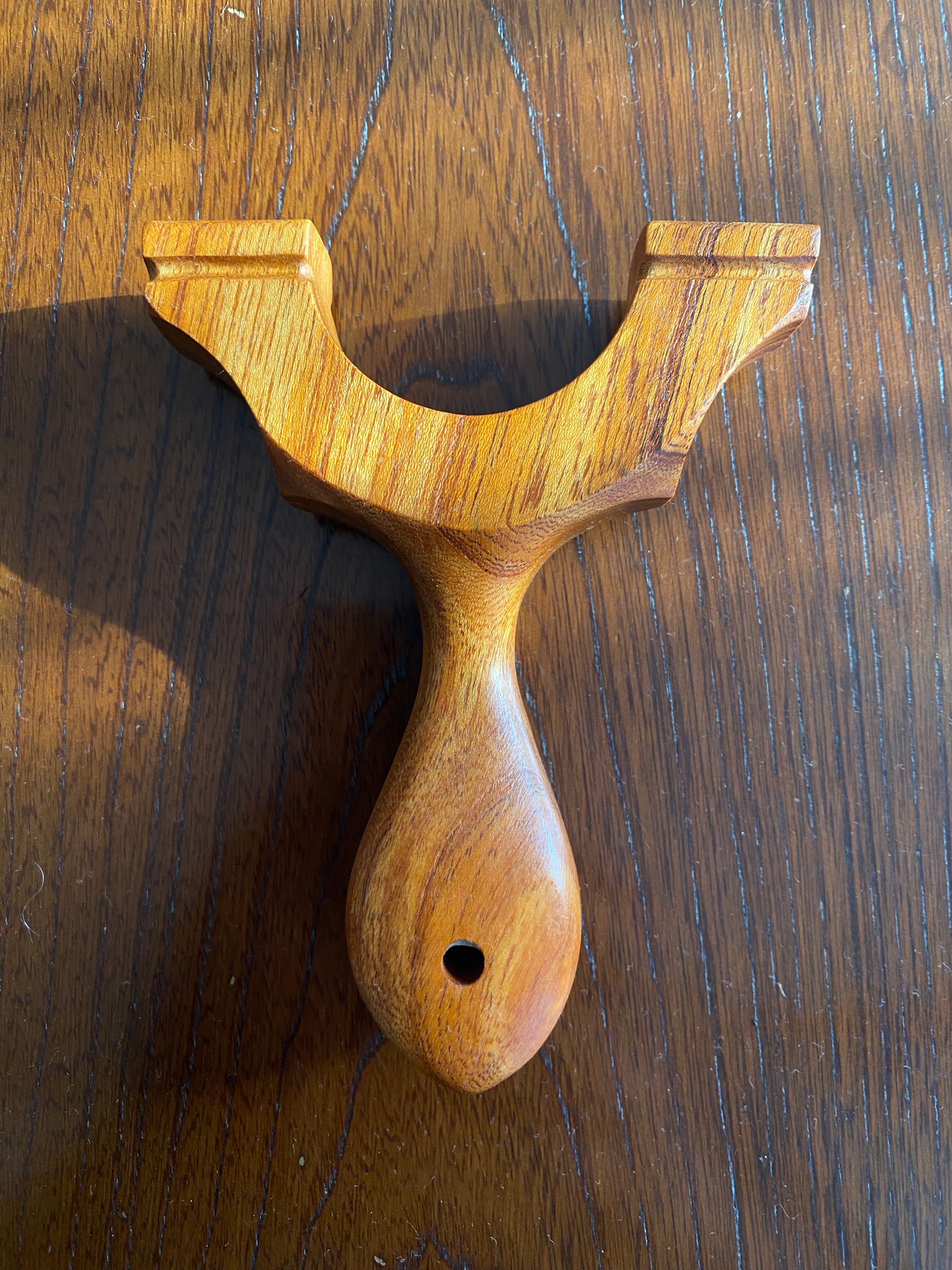 ■中級者にピッタリなNo.686 Open Branch Slingshotは、フォークが開き気味のデザインが特徴のスリングショットです。このユニークな形状が、スムーズな操作を実現し、フォークヒットのリスクを低減しています。全体的にエッジの効いたかっちりした感じで持ちやすさも抜群。初めての方でも安心してお使いいただけます。贅沢にも欅の無垢材からの切り出しの為、使い込むほどに味が出てきますので育てる楽しみもあります。仕上げは亜麻仁油+蜜蝋ですが、滑り止めや育てていくのは椿油、手の油など特にこだわらなくても大丈夫です。久々に作者としてどこにもミスのない納得のいく出来でできれば手元に置いておきたくなる作品です。