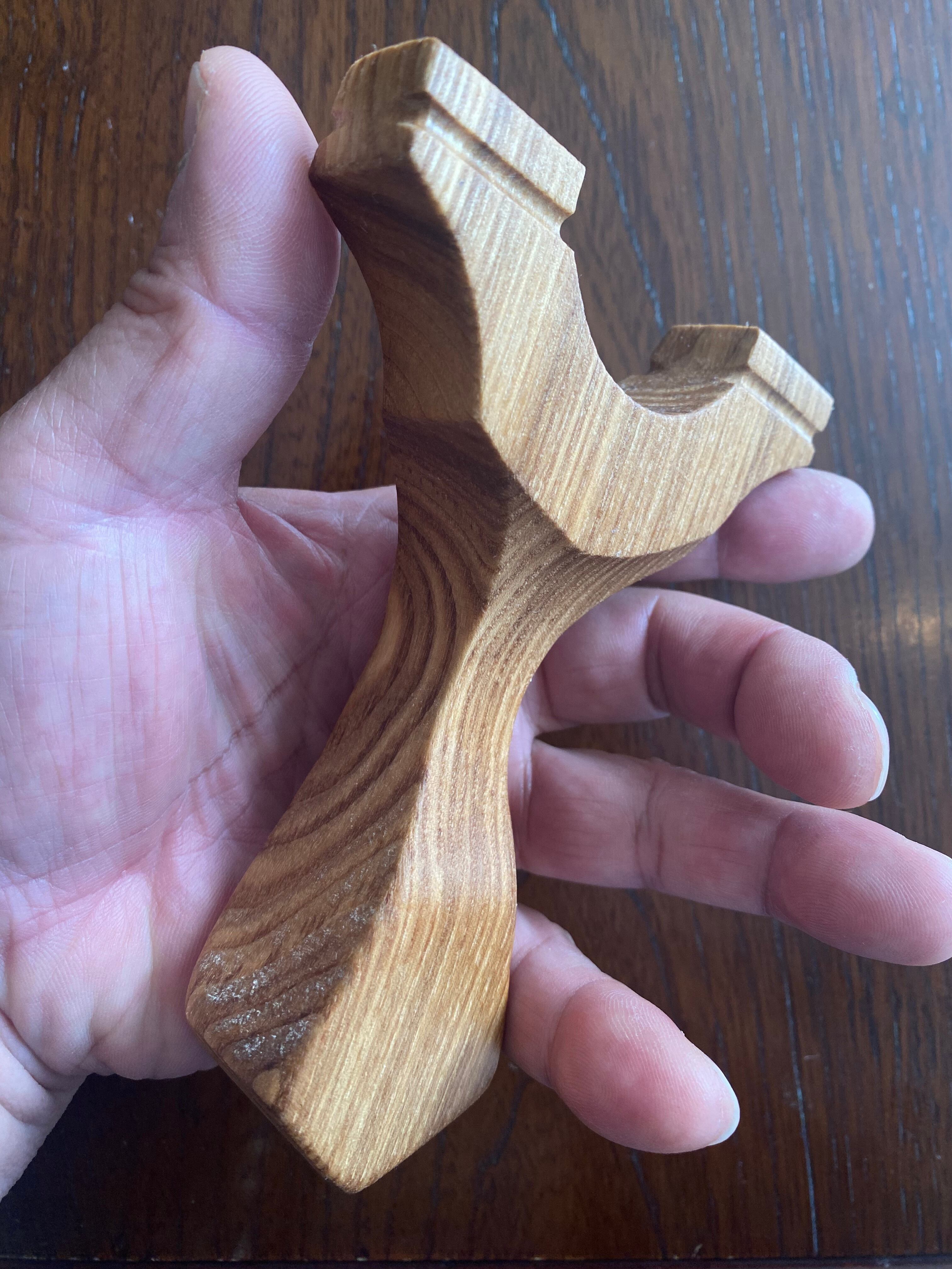 ■No.711 Necktie型スリングショット(タモ)angularは、タモ材を使用した洗練されたデザインのスリングショットです。ネクタイを思わせるユニークな形状が、魅力的かつスタイリッシュな印象を与えます。手のひらでしっかりと固定できる角張ったハンドルと膨らんだハンドルエンドの扇状の開きが特長で、握った時に中指・薬指・小指が固定を助けます。親指と人差し指にはそれほど負担がかからず角度調整に集中できます。その為 手の大きな方、小さな方、どちらでも安定した射撃を楽しめます。またangular仕様によりサムサポートグリップでも上手く構えられるように改良を加えました。