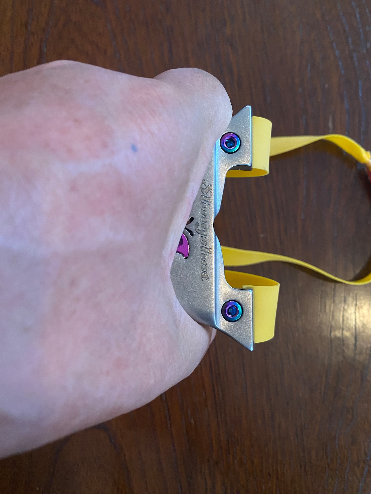 このスリングショットは、全くの未使用の新品状態です。六角レンチ式のゴム装着機構は、簡単に取り付けられ、瞬時に使用準備が整います。ゴム装着が苦手な初心者の方から競技会に出場するような経験者まで、幅広い層のユーザーにとって便利なアイテムです。もし1ヶ月間需要(注文)が無ければ自分で使うことにします。