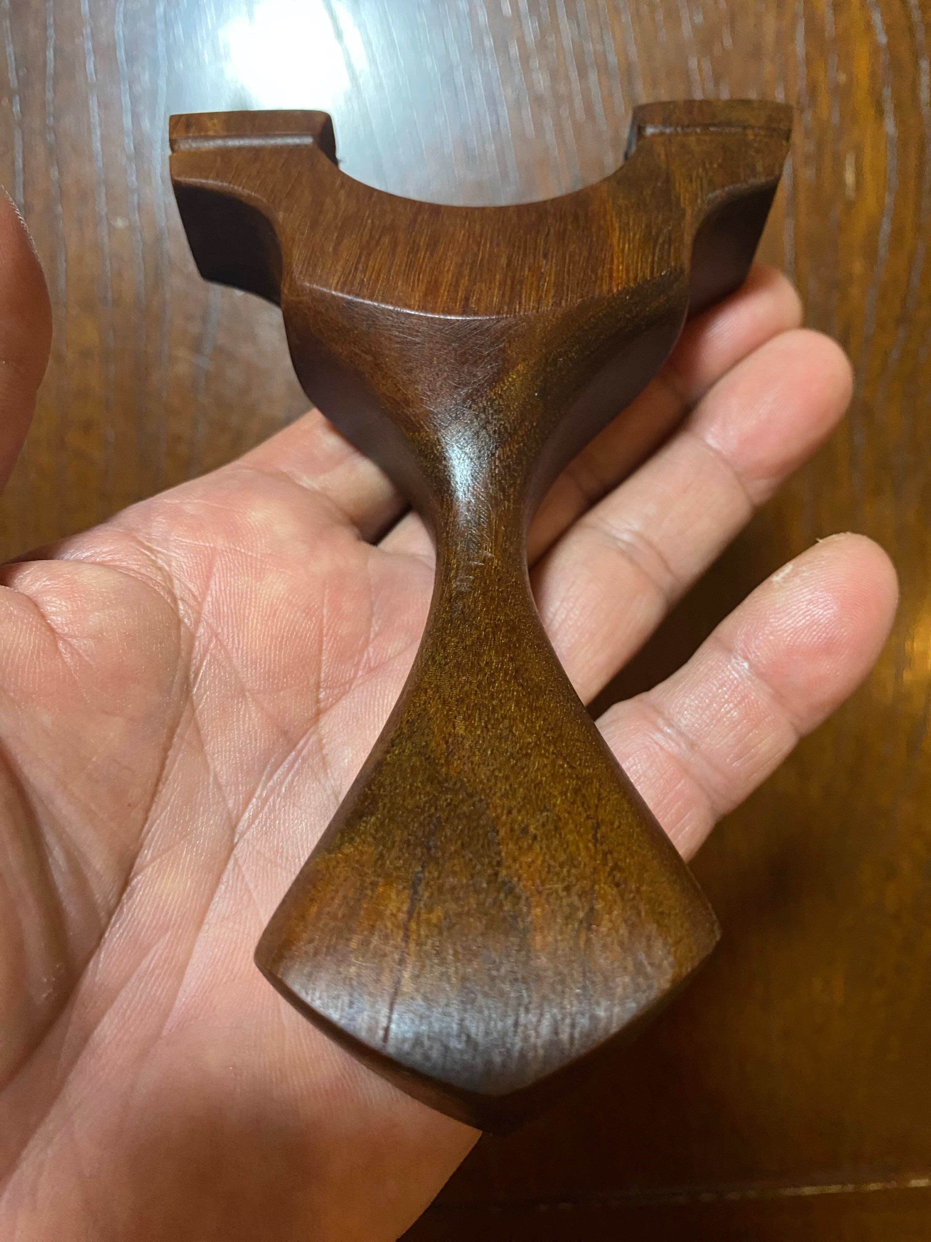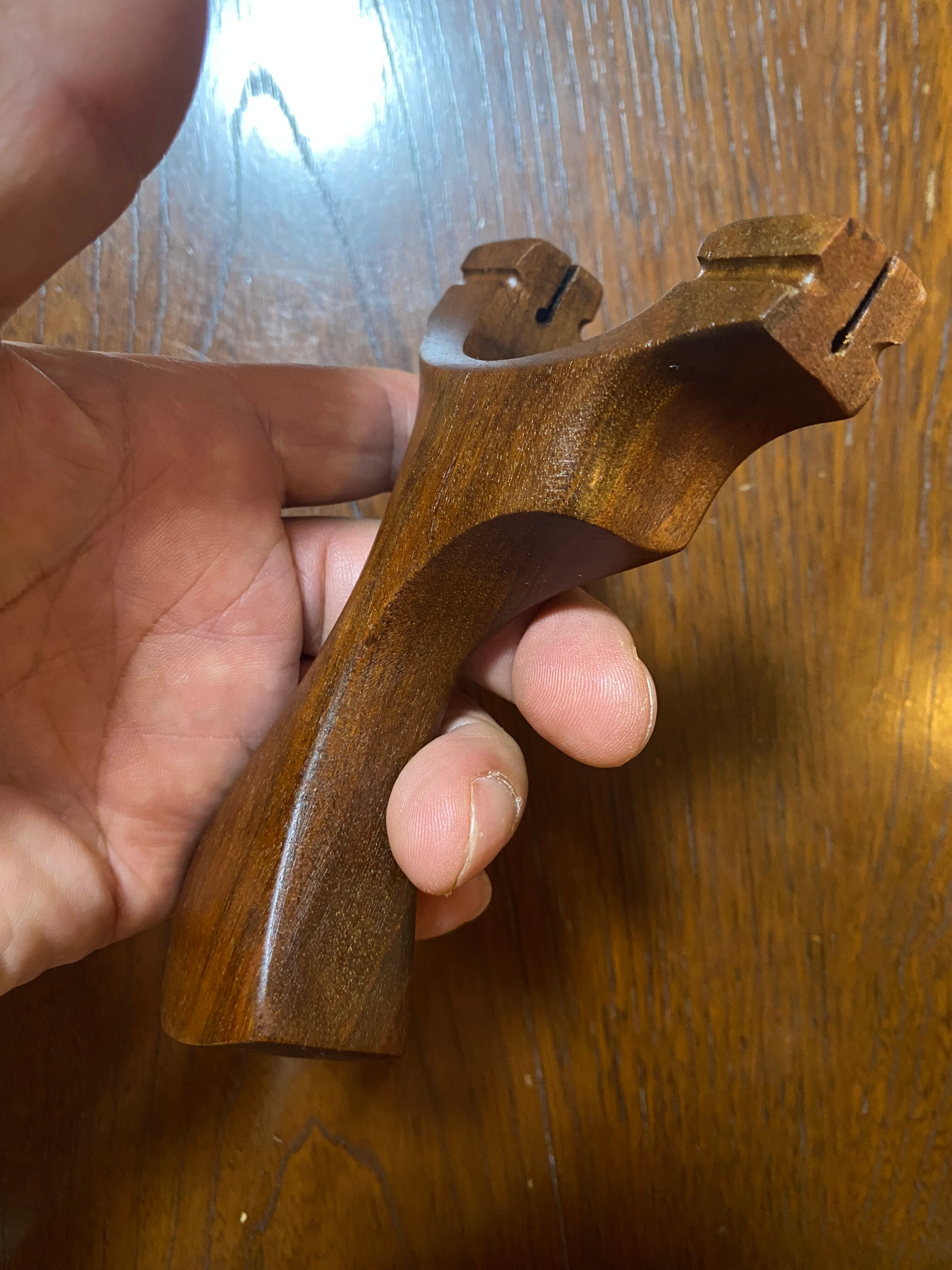 ■ No.775 鉄刀木スリングショット(イチョウハンドル)は、イチョウの葉の形を持つハンドルが特徴の鉄刀木製スリングショットです。独特のデザインは視覚的な魅力を持ちながら、握った時の滑り止め効果を発揮し、ピンチグリップやハンマーグリップの際に優れた安定性を提供します。またサムグリップでは親指が押さえやすくなるようにヘッド部分が凹んだ設計となっており、ストレスのない射撃体験を実現しています。