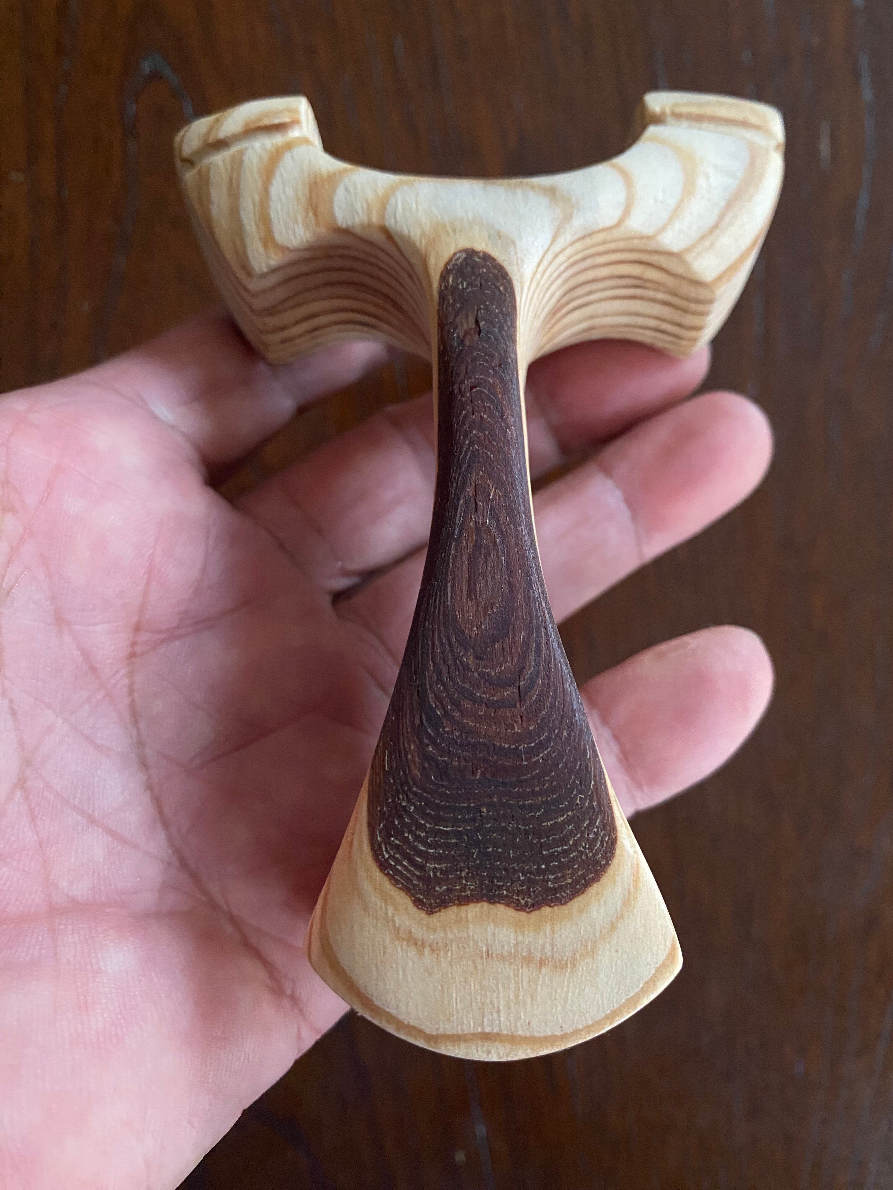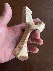 ■ No.779 Hawk eye 改35(イチョウの葉型ハンドル)は、Hawk eyeの改良型として登場した新しいスリングショットです。ハンドルエンドを丸型からイチョウの葉型に変更し、手にスッポリと収まる設計が特徴です。この形状により安定感抜群で、微妙なコントロールも可能になりました。また、皮付きの杉を使用し、木固めエースでしっかりと固めてあるため、これまでにない美しい模様を表現できました。