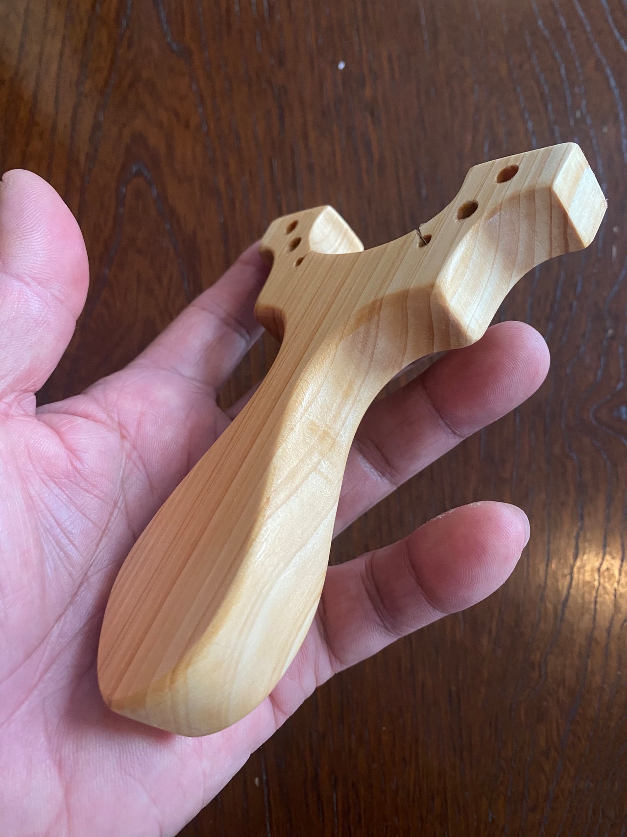 このモデルは、その軽量設計と握りやすさから、初心者から上級者まで幅広くご利用いただけます。また、スリングショットとしてのパフォーマンスを重視し、ゴムはヘッドの天板から出し安定した射撃を可能とし、アウトドアシーンやレクリエーションにも最適なアイテムとなっています。平型ですが手の中で自分好みの角度調整ができるため、射撃時の安定性が向上し、より正確な射撃が可能でプロ好みの仕様です。