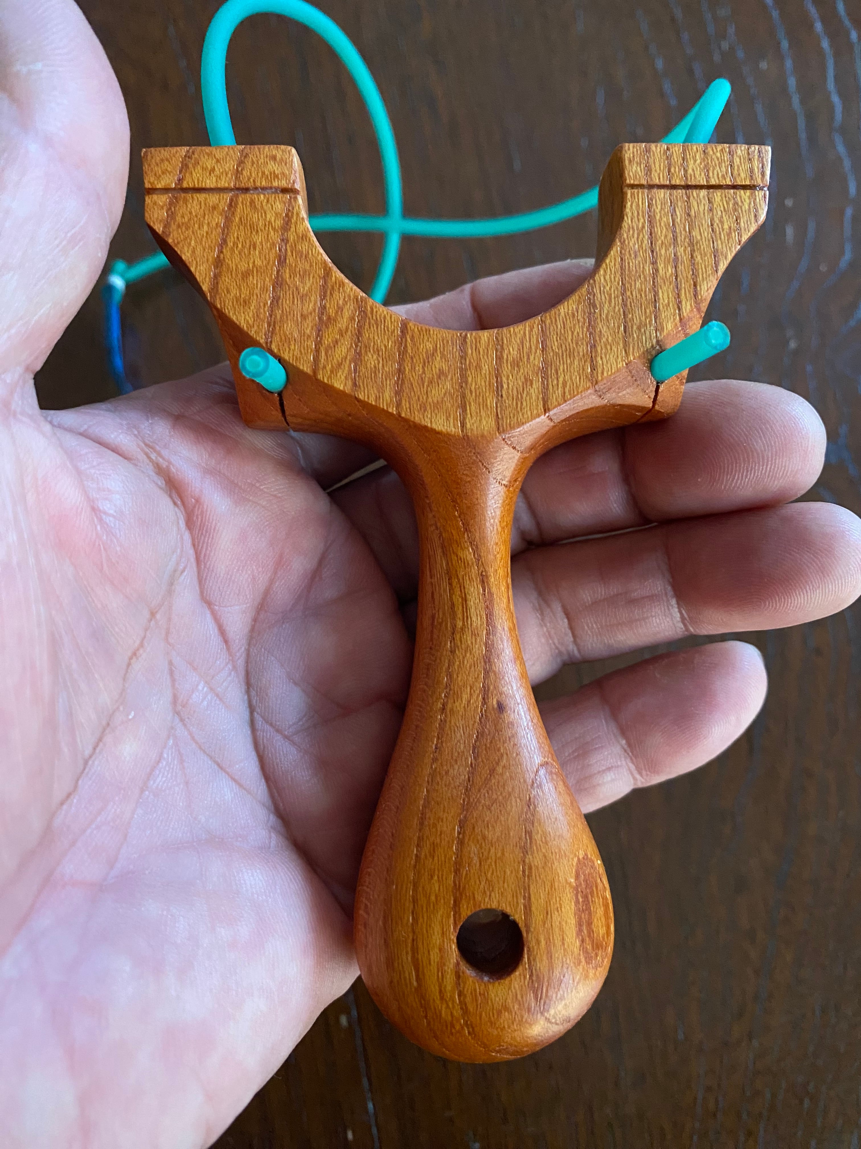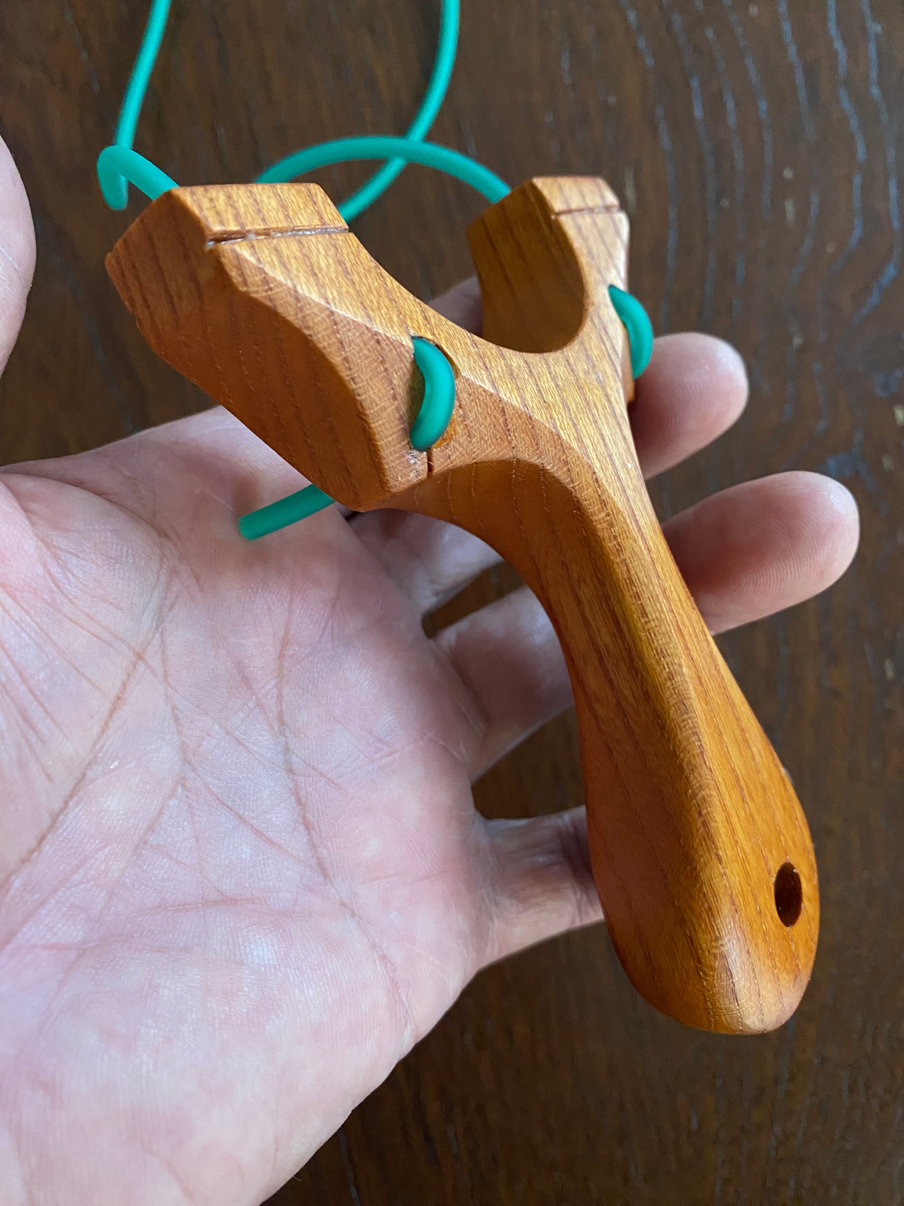 ■ No.802 Pinch grip スリングショット(欅製)ミドルドロー対応は、魅力的な欅の無垢材から切り出したスタイリッシュで機能的なスリングショットです。このモデルは、ピンチグリップ派にもサムグリップ派にも最適なデザインを採用しており、幅広いユーザーにご満足いただける一品となっています。また的当て競技に最適な1632丸ゴムを採用し、120cm引きのミドルドローにも対応しています。天板からフォークへの穴はくの字に開けてあり、ゴムを回転させながら押し込むと道具なしで通すことができます。
