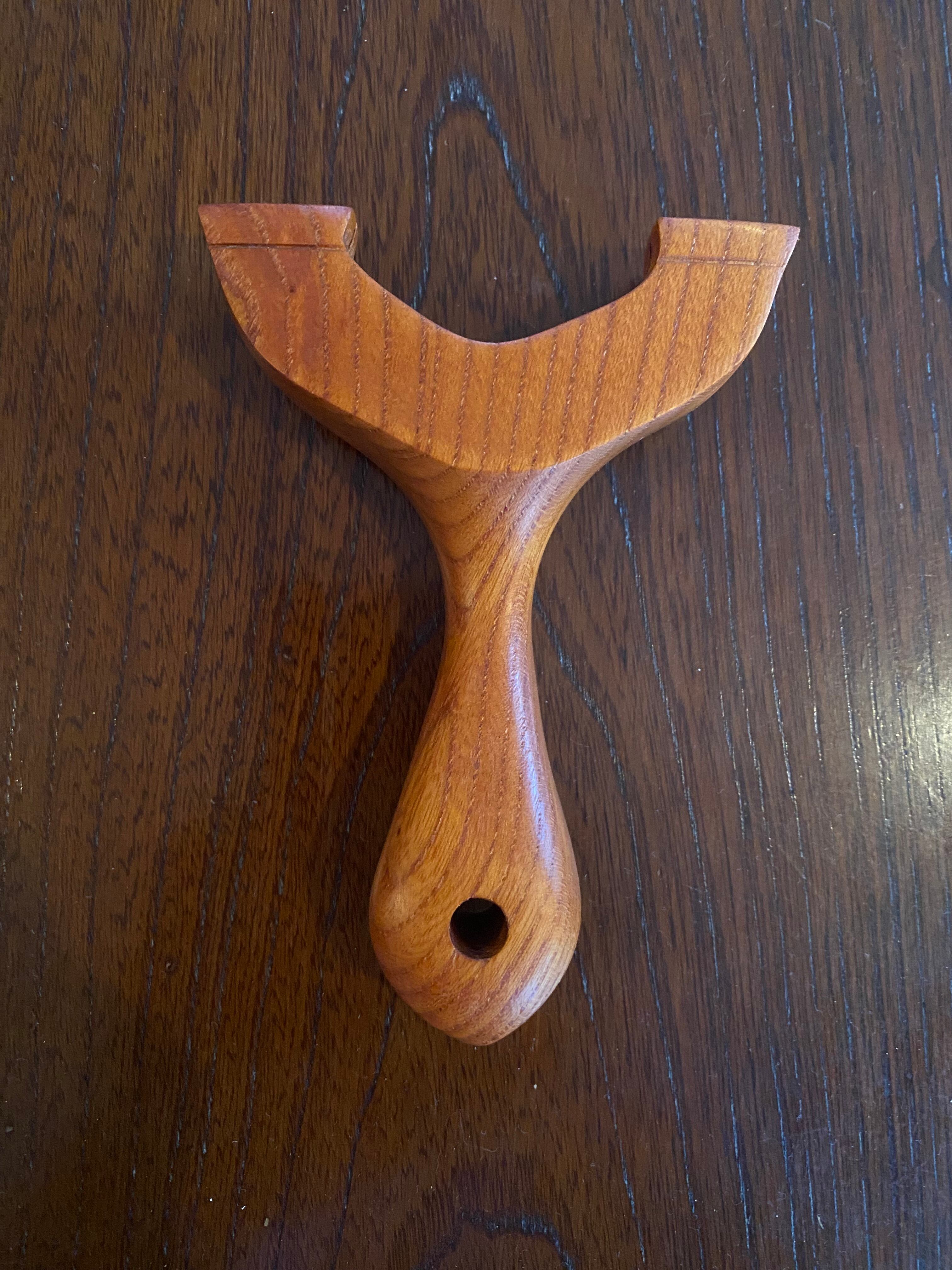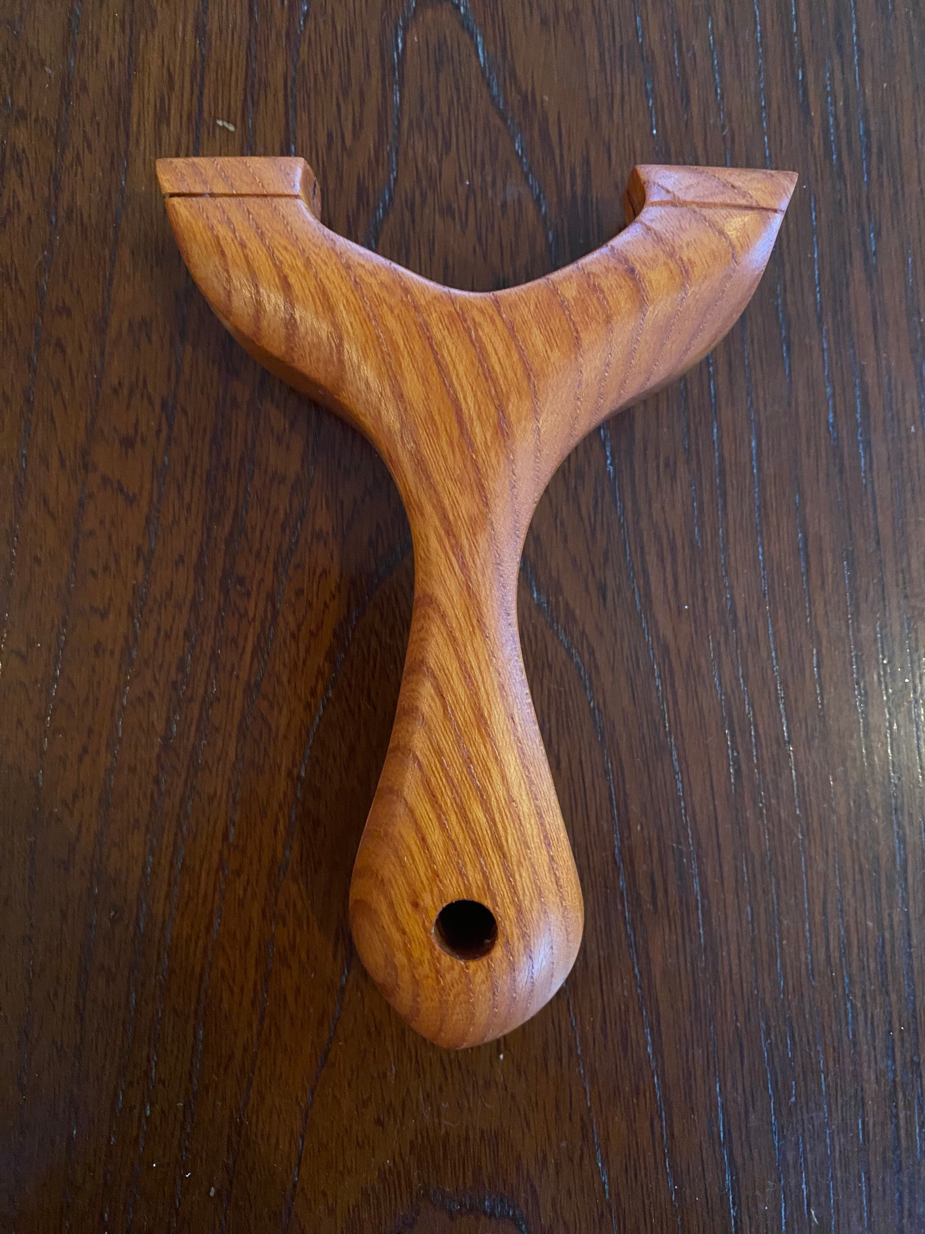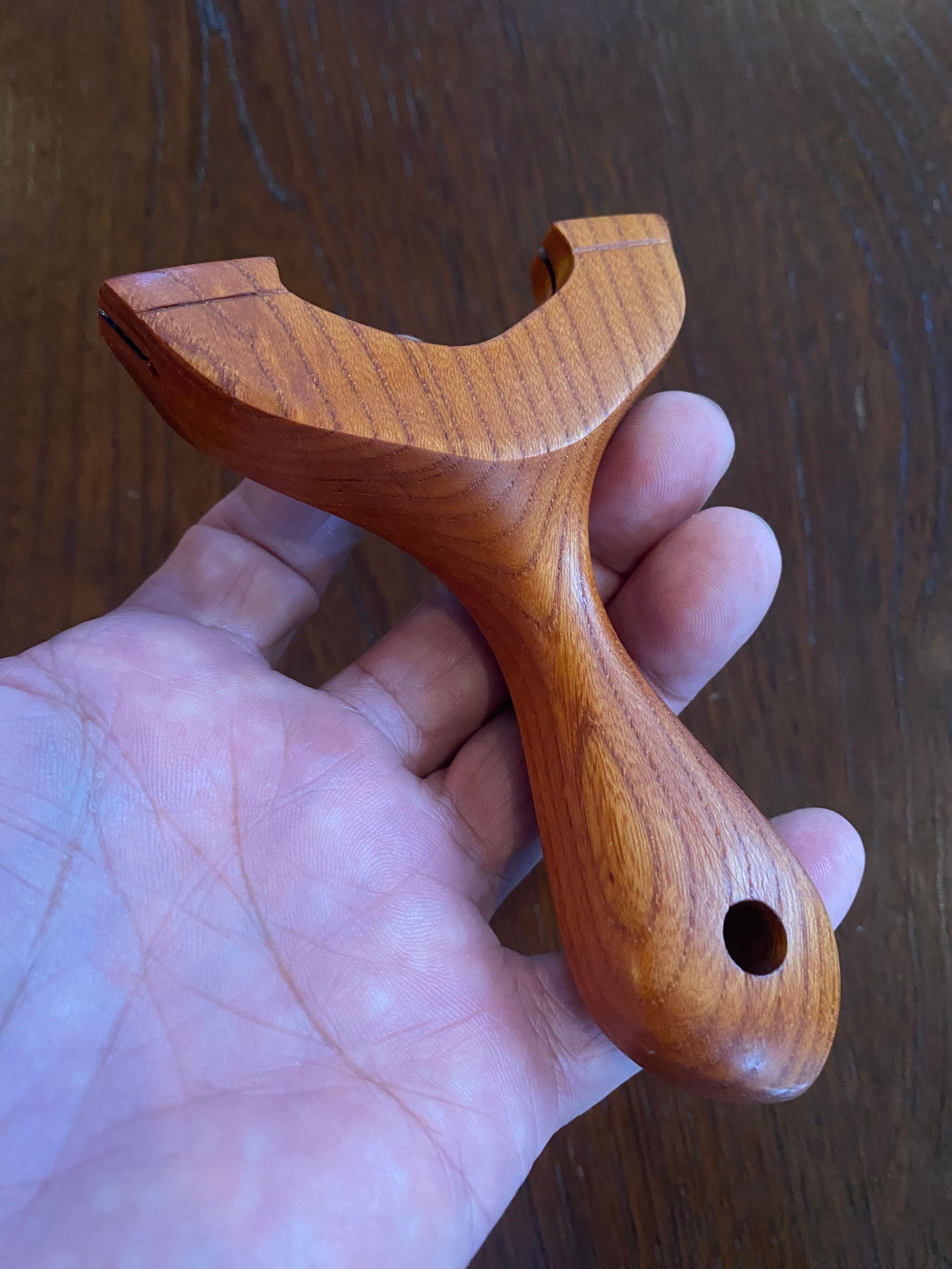 ■ No.806 Slender biceps(欅 )Top slotは、優雅なデザインと軽快さを兼ね備えたスリングショットの試作品です。力瘤をなだらかな平面に変えたデザインは、手に心地よくフィットします。ゴムの取り付け方法はヘッドの天板の溝に平ゴムを差し込んで固定するTop slot方式で、慣れると簡単に装着が可能です。天然の欅材を贅沢に使用し、二つの端材を接合することによって魅力的な木目が引き立ち、自然の美しさを感じさせてくれる一品です。