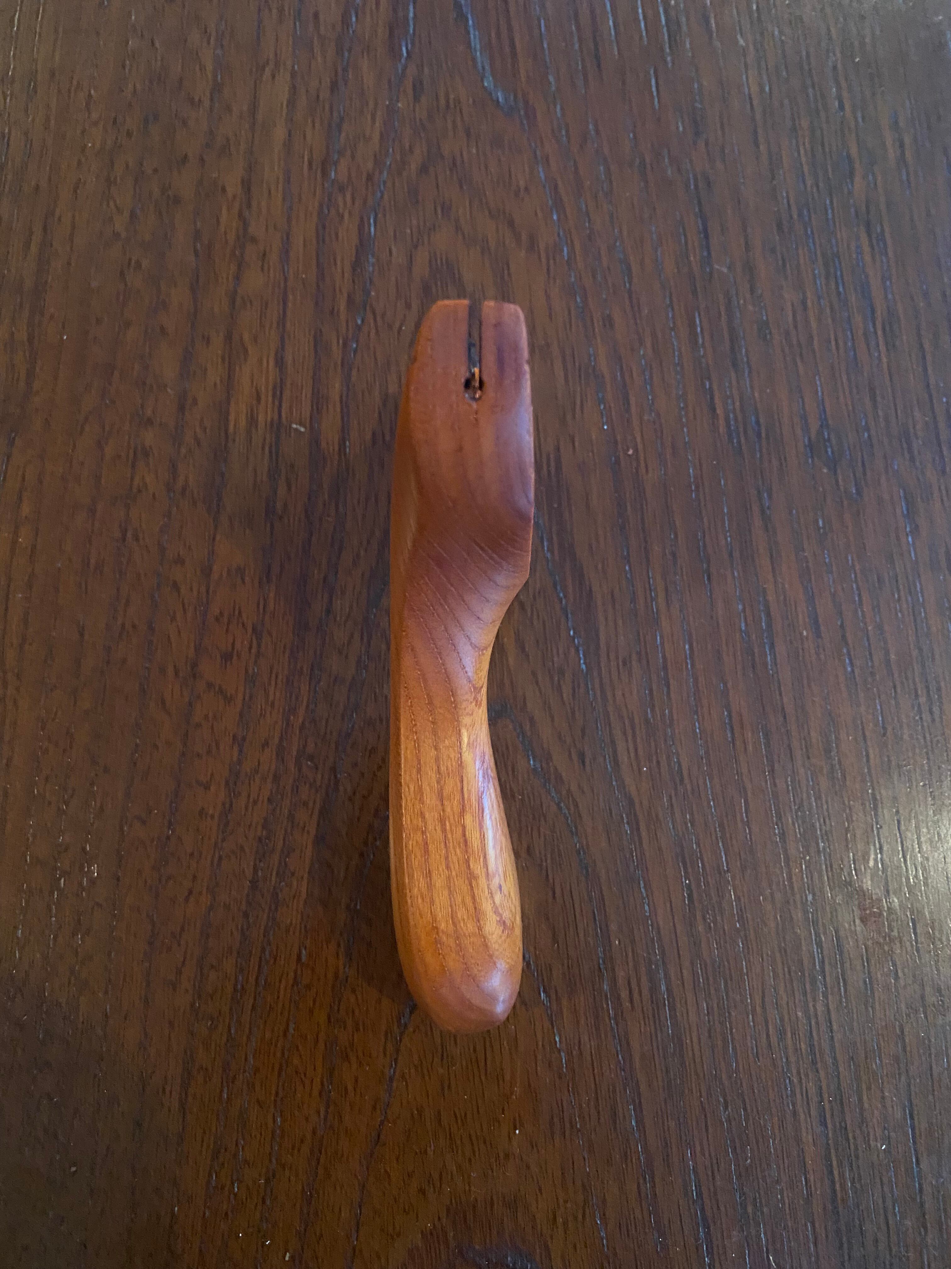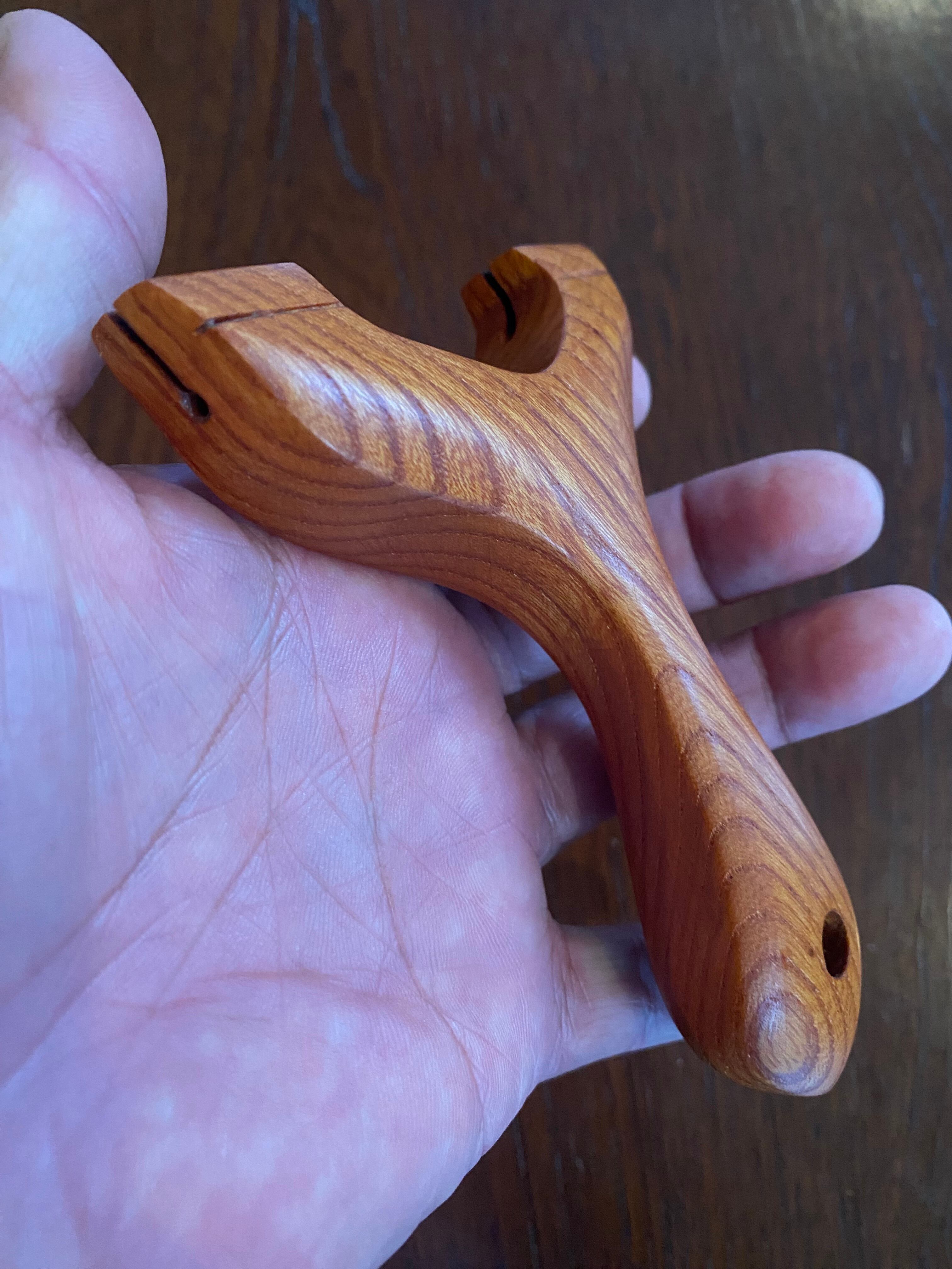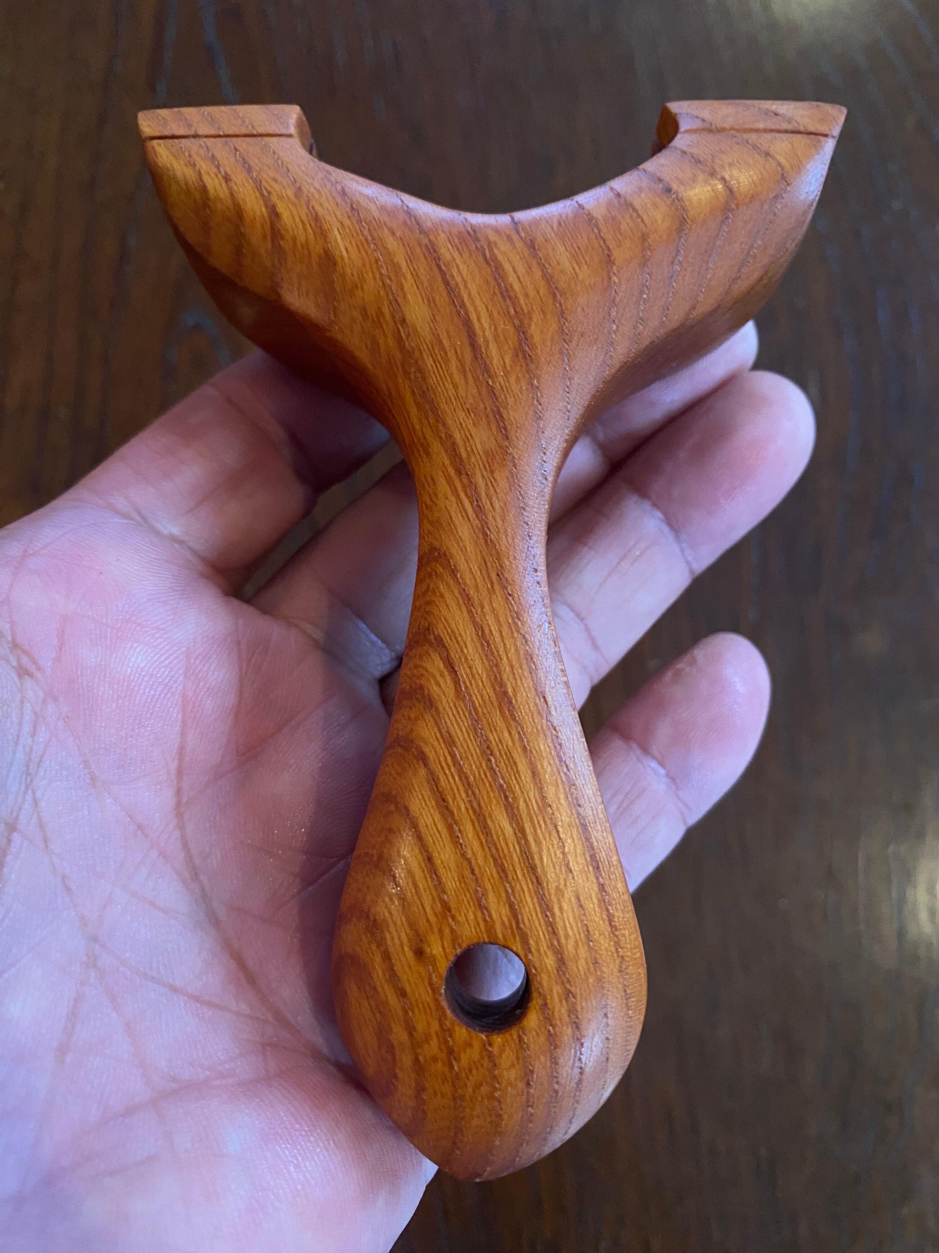 ■ No.806 Slender biceps(欅 )Top slotは、優雅なデザインと軽快さを兼ね備えたスリングショットの試作品です。力瘤をなだらかな平面に変えたデザインは、手に心地よくフィットします。ゴムの取り付け方法はヘッドの天板の溝に平ゴムを差し込んで固定するTop slot方式で、慣れると簡単に装着が可能です。天然の欅材を贅沢に使用し、二つの端材を接合することによって魅力的な木目が引き立ち、自然の美しさを感じさせてくれる一品です。