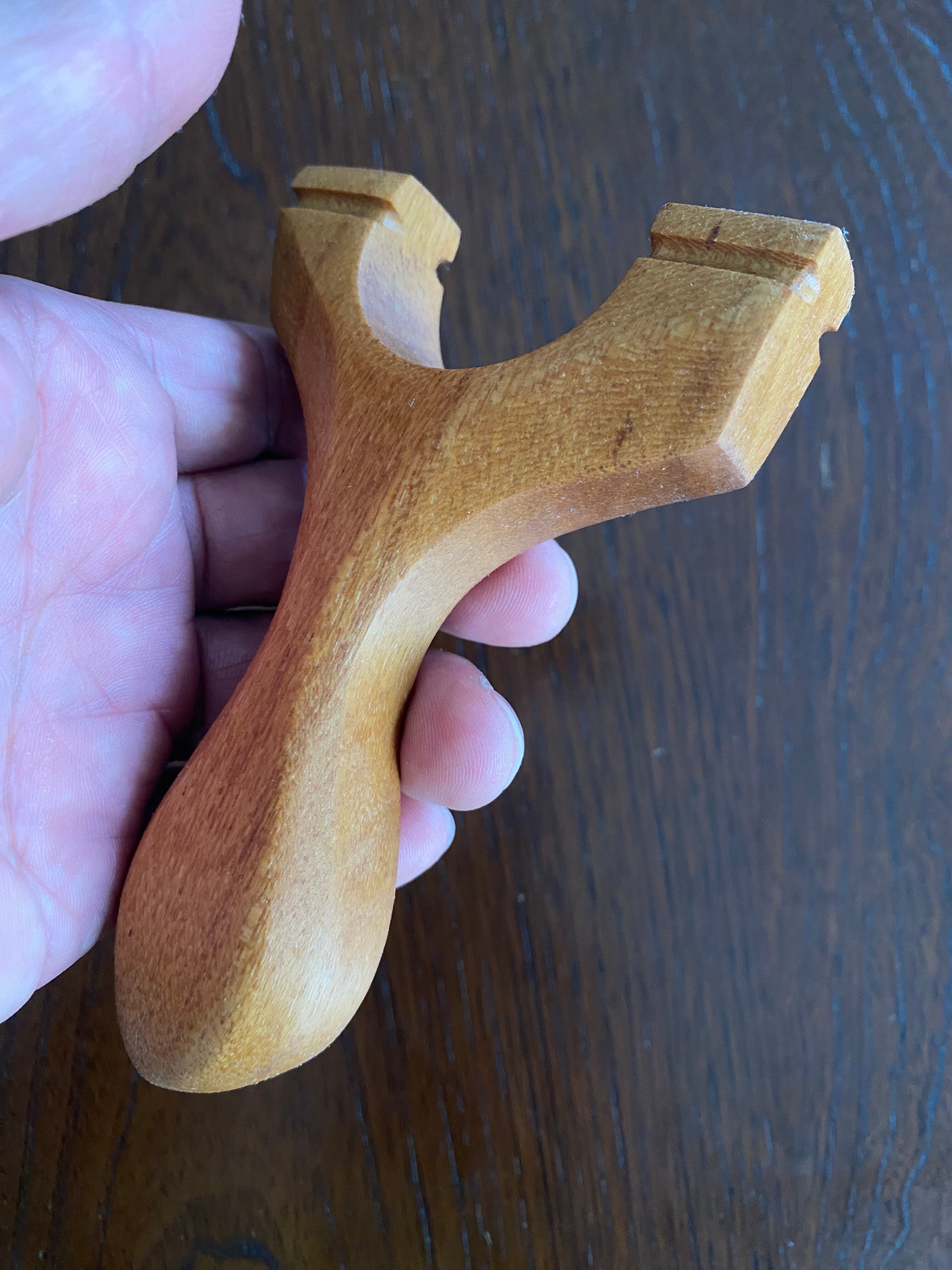 ■ No.818 練習用 簡易スリングショットRough finishは、小さめの手の方でも扱いやすい設計が特徴の練習用スリングショットです。樹種は不明ですが、適度な硬度を持ち、表面はざらつき感が残っているため滑り止め効果も兼ね備えています。標準的なスタイルと、使い方もシンプルな標準的なゴムの装着方法で、まずはスリングショットの楽しさを体感するのに最適な一品です。