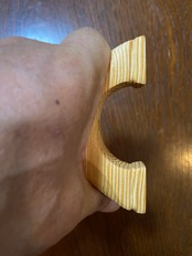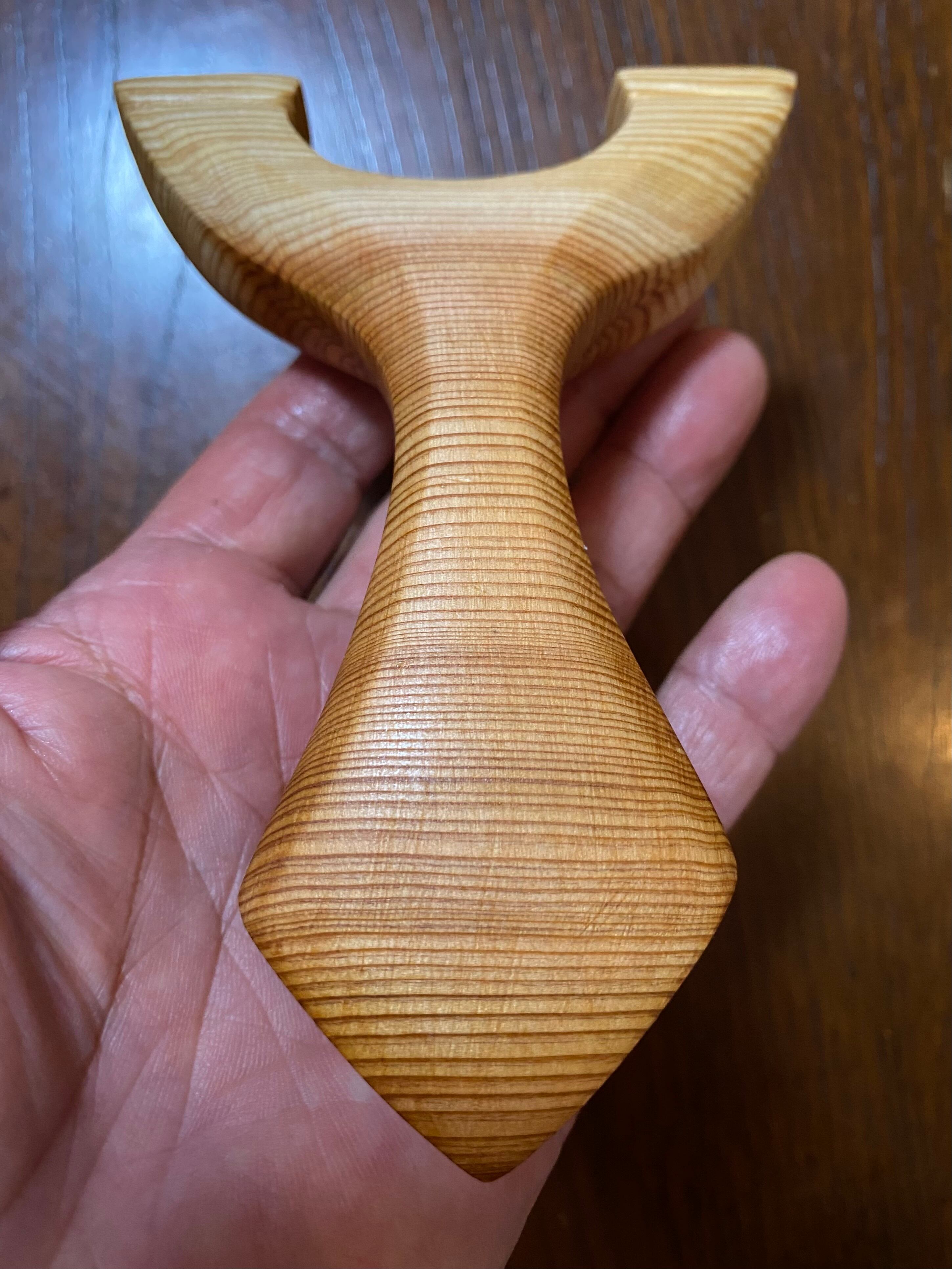 横の木目を活かしたデザインは、自然の美しさと温かみを伝え、持つ喜びをさらに引き立てます。その軽治性は、決して持ちにくさを感じさせることなく、アウトドアや趣味のシーンで大活躍することでしょう。この作品は木固めエース処理の後、試しに亜麻仁油+蜜蝋で表面処理を行ってありますので、しっとり感がプラスされています。以上のように初心者から上級者まで、多様なニーズに応える工夫が凝縮されています。