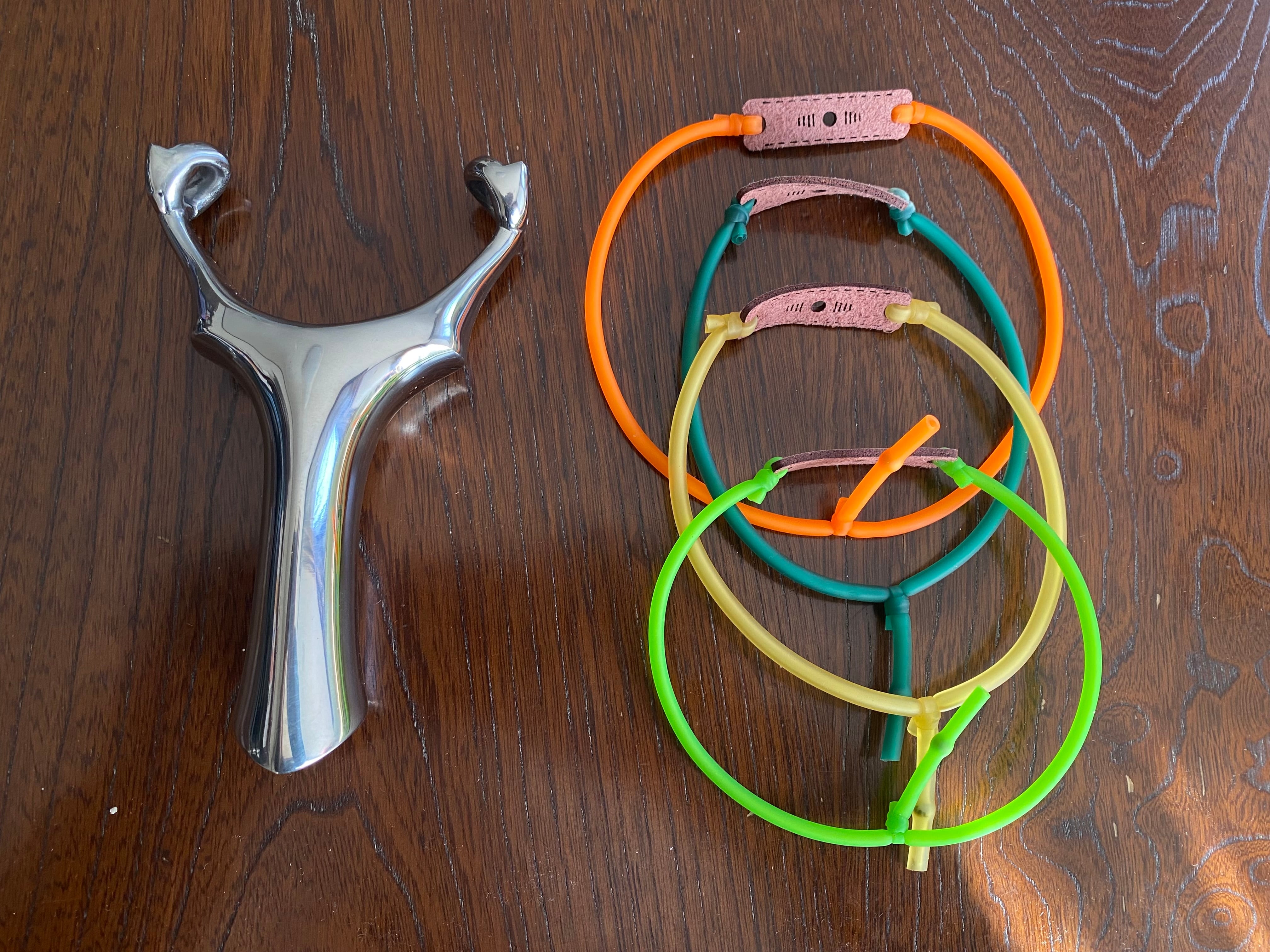 このスリングショットの最大の特徴は、装填の速さです。ベッドから先に出るゴムを短くし、丸ゴムを本体内に通してハンドルエンドで固定することで、短時間での準備が可能になっています。これにより、素早い発射を促進し、競技や趣味の射撃において大いに力を発揮します。