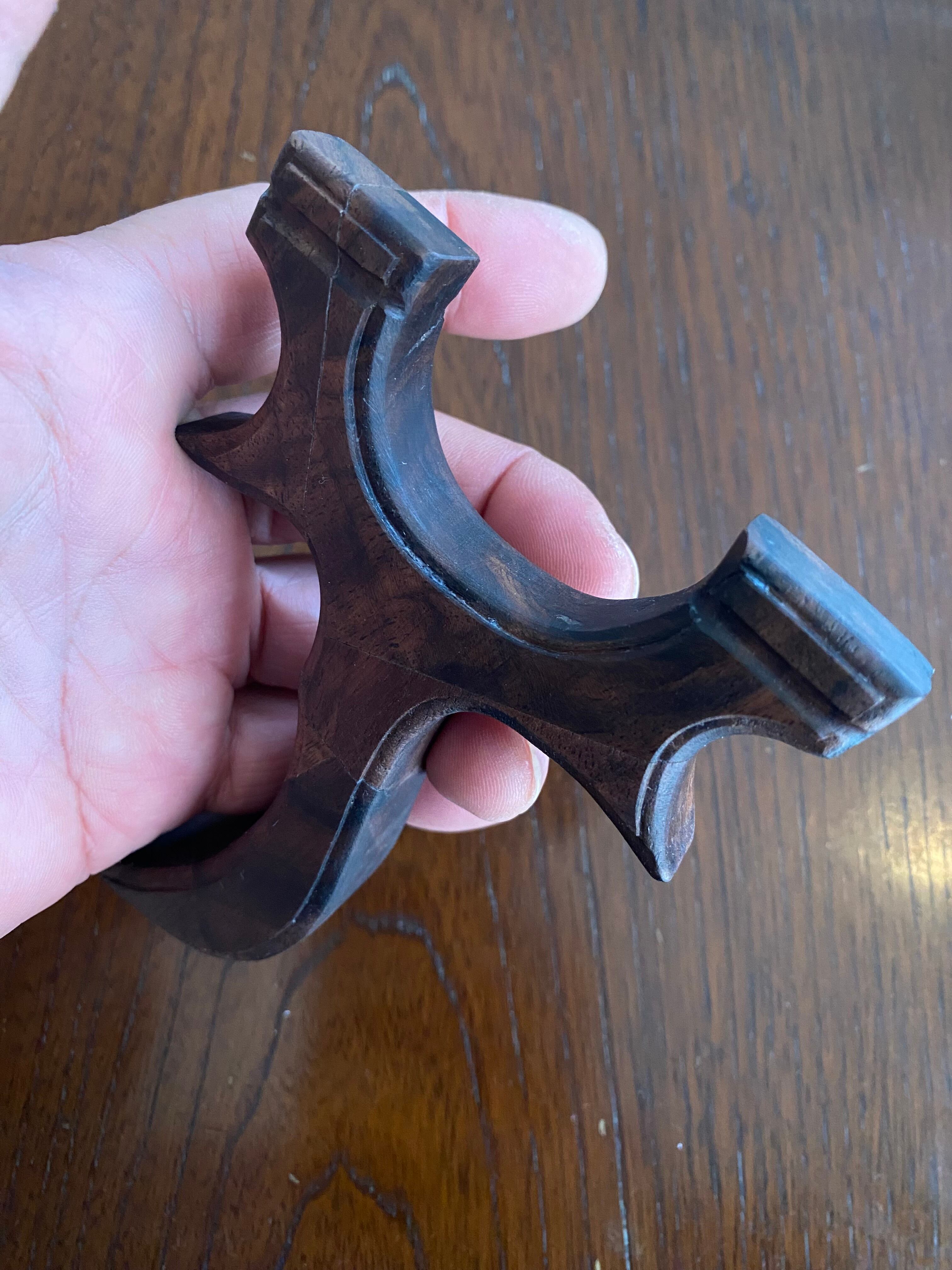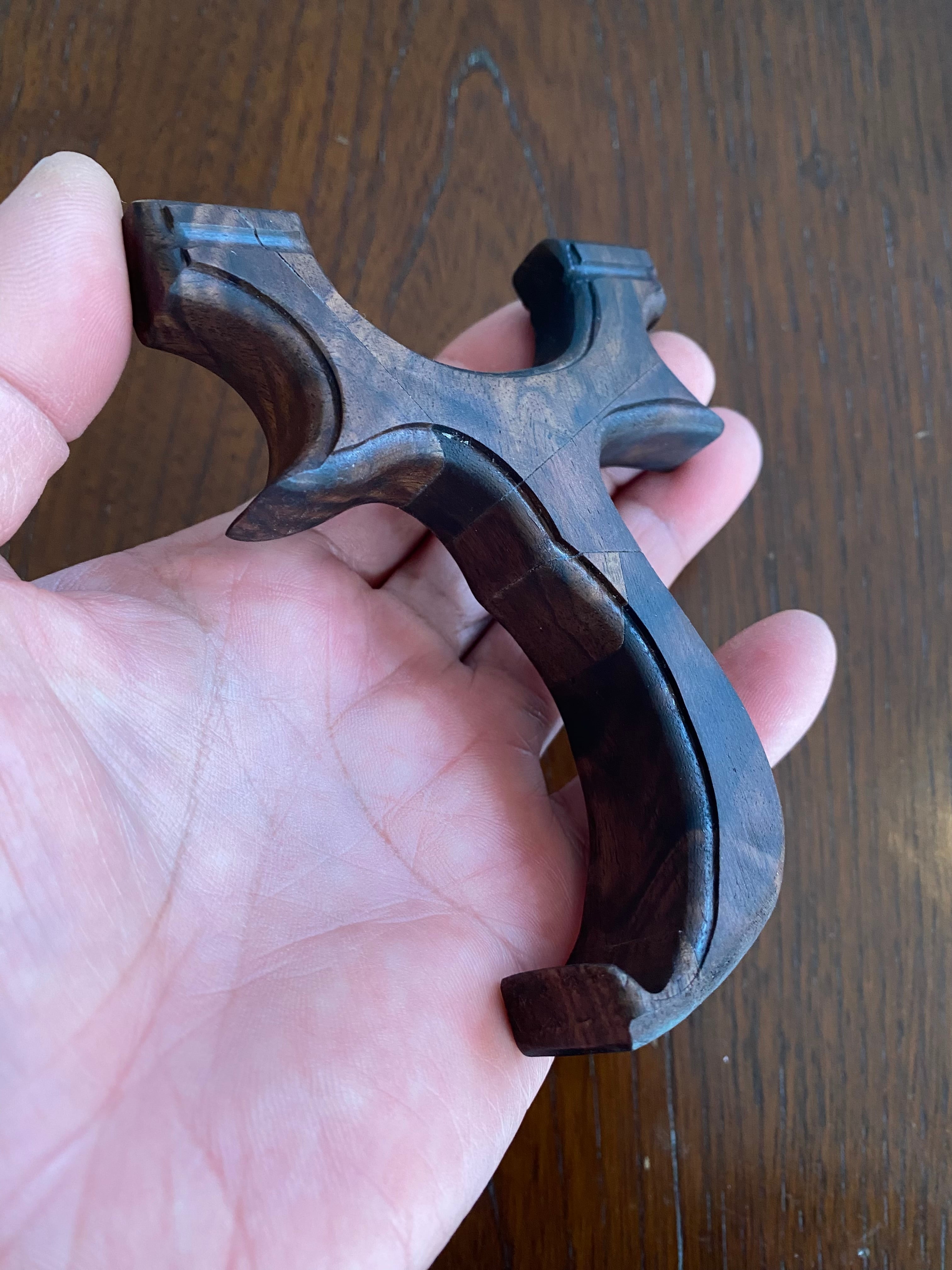 ◾️ No.865 ウェラブルスリングショットAnteater(ウォールナットのmosaic)は、親指、人差し指に加えて小指の3点でしっかりと保持できる立体型のスリングショットです。手をパーにしていても落下しない設計は、ウェラブル感覚で使いやすさと安心感を両立させています。ピンチグリップやサムグリップに対応しており、さまざまなスタイルでの使用が可能です。左利き用として設計しましたが、上下逆に持つ事も可能で、右利き、左利きどちらでも撃てます。⚠️