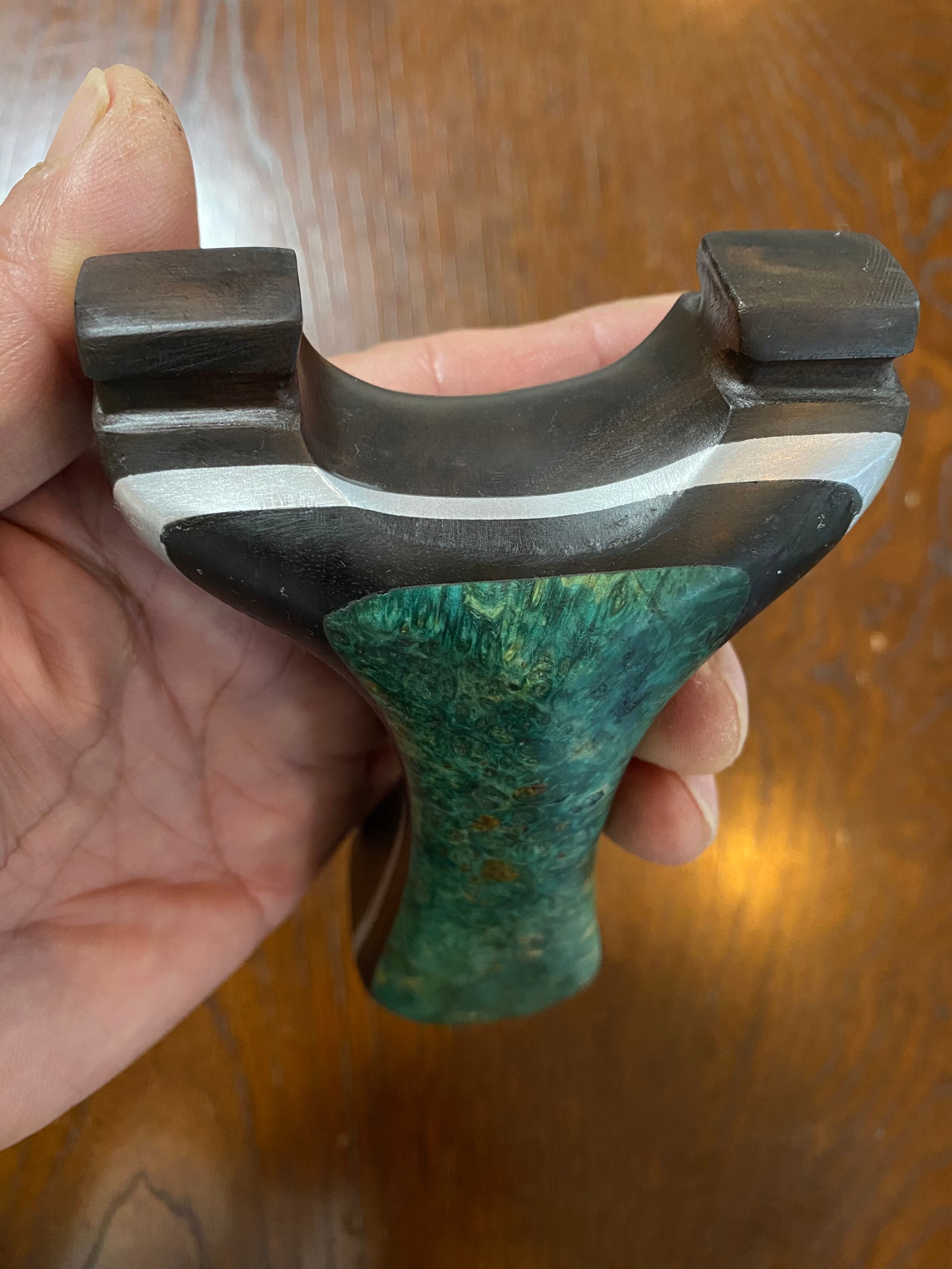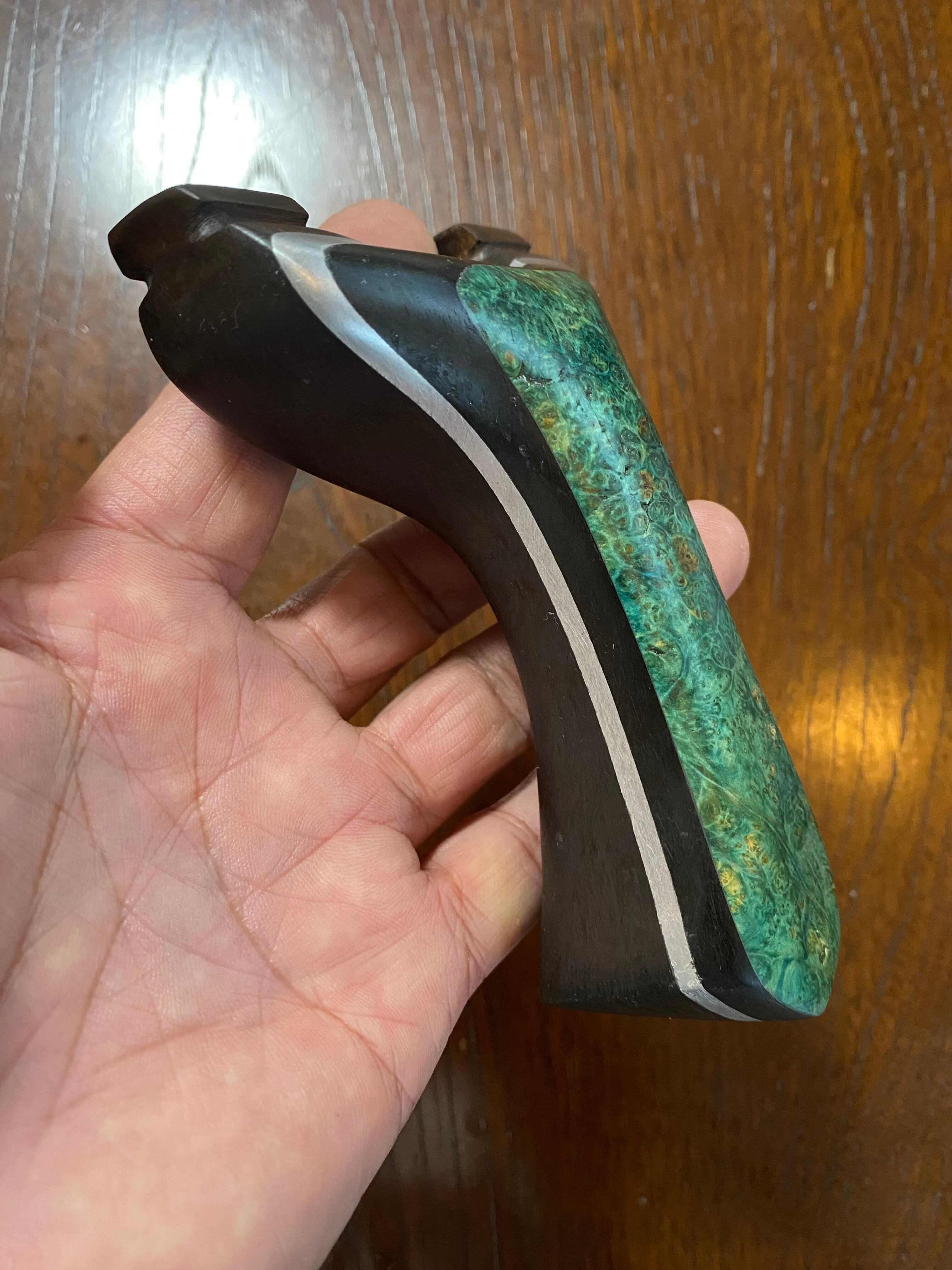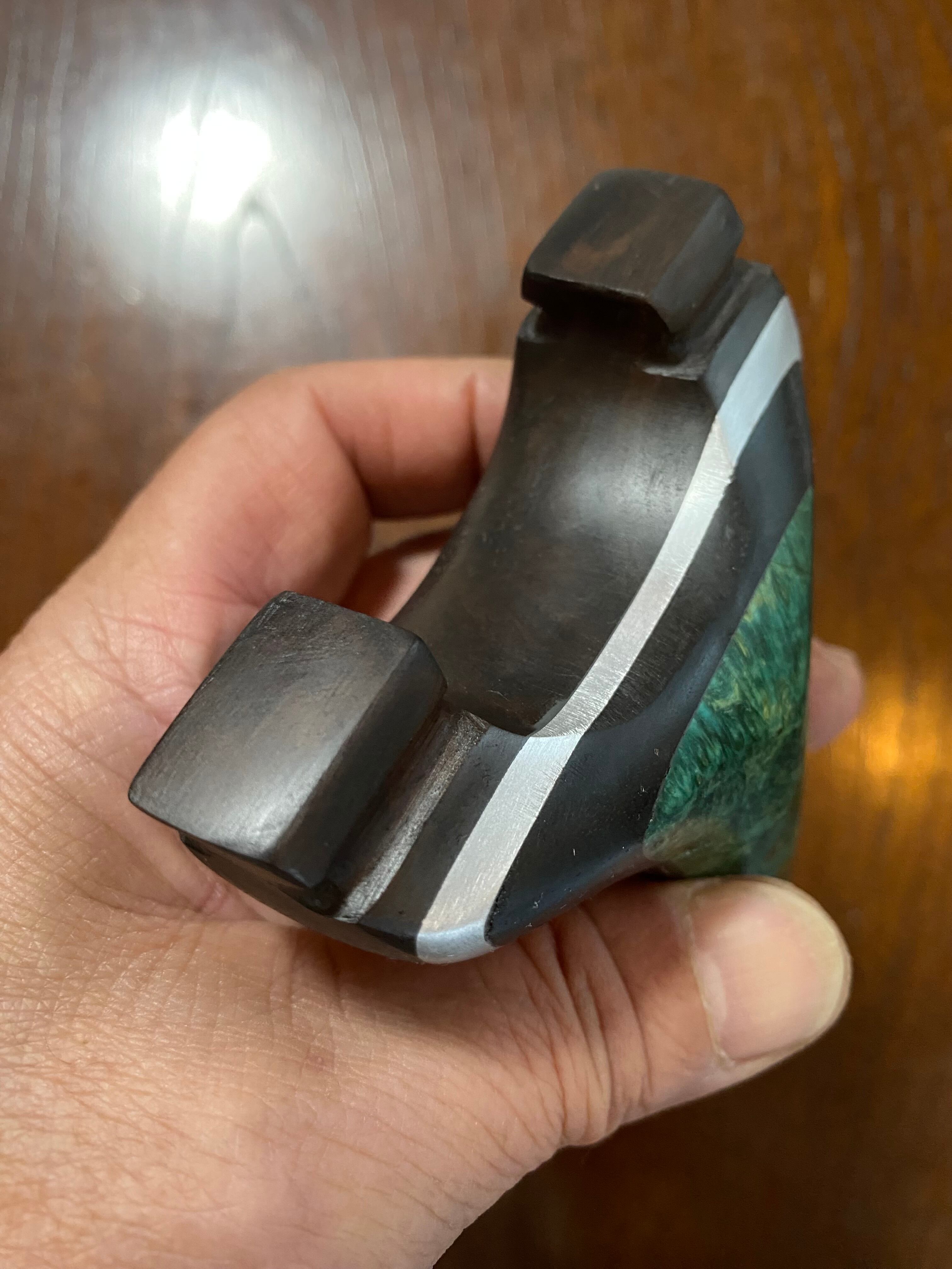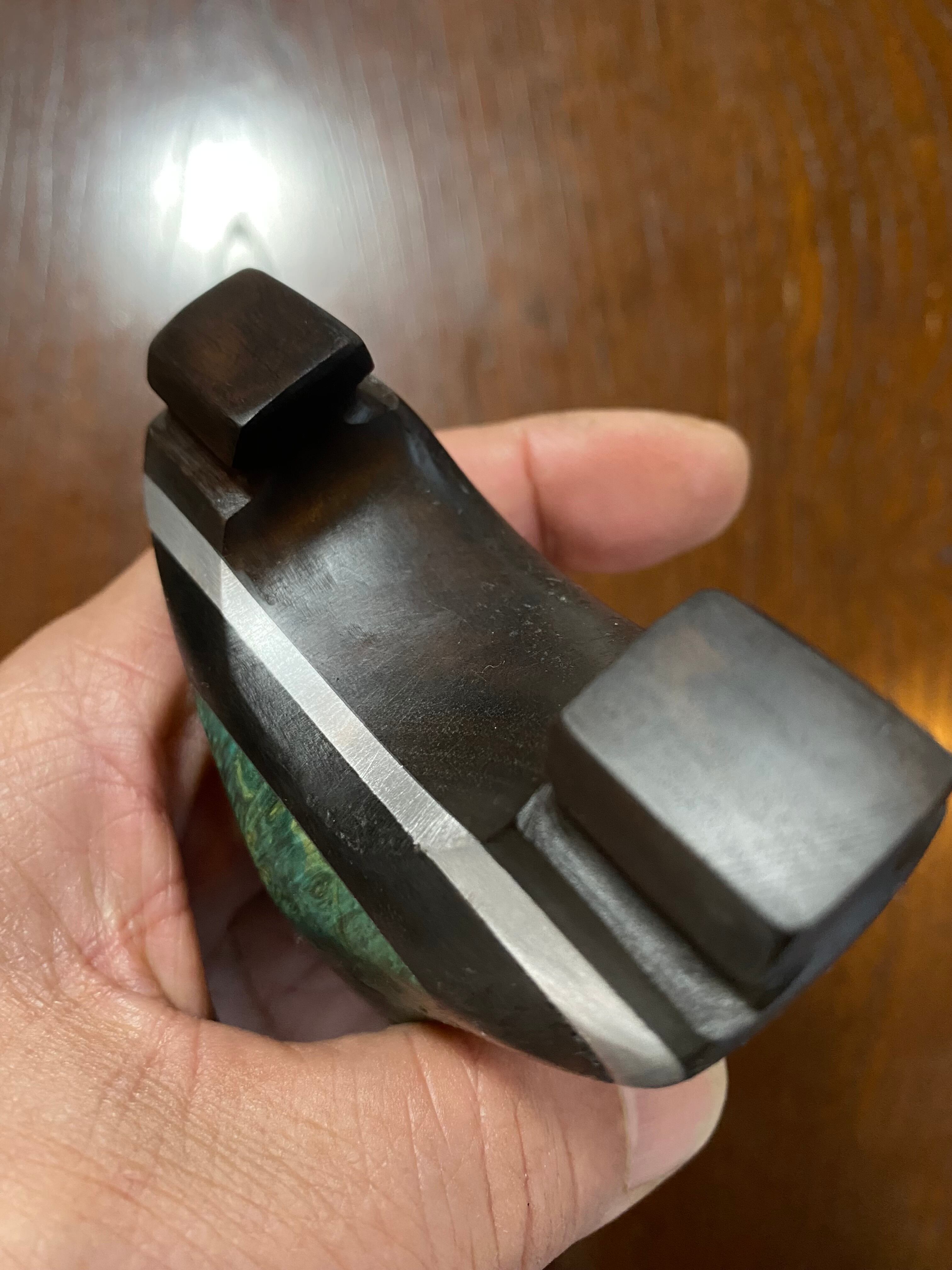 ■ No.873 スタビライズドウッド緑スリングショット(黒檀・ウォールナット・アルミサンド)は、これだけで数千円する高価な緑系のスタビライズドウッドを前面に配した洗練されたデザインが特徴のスリングショットです。ウォールナット、アルミ板、黒檀、スタビライズドウッドの4層構造が、他に無い特別な存在感を醸し出し、所有する喜びを一層引き立てます。現時点で庵野吽製スリングショットの最高峰とも言える作品です。