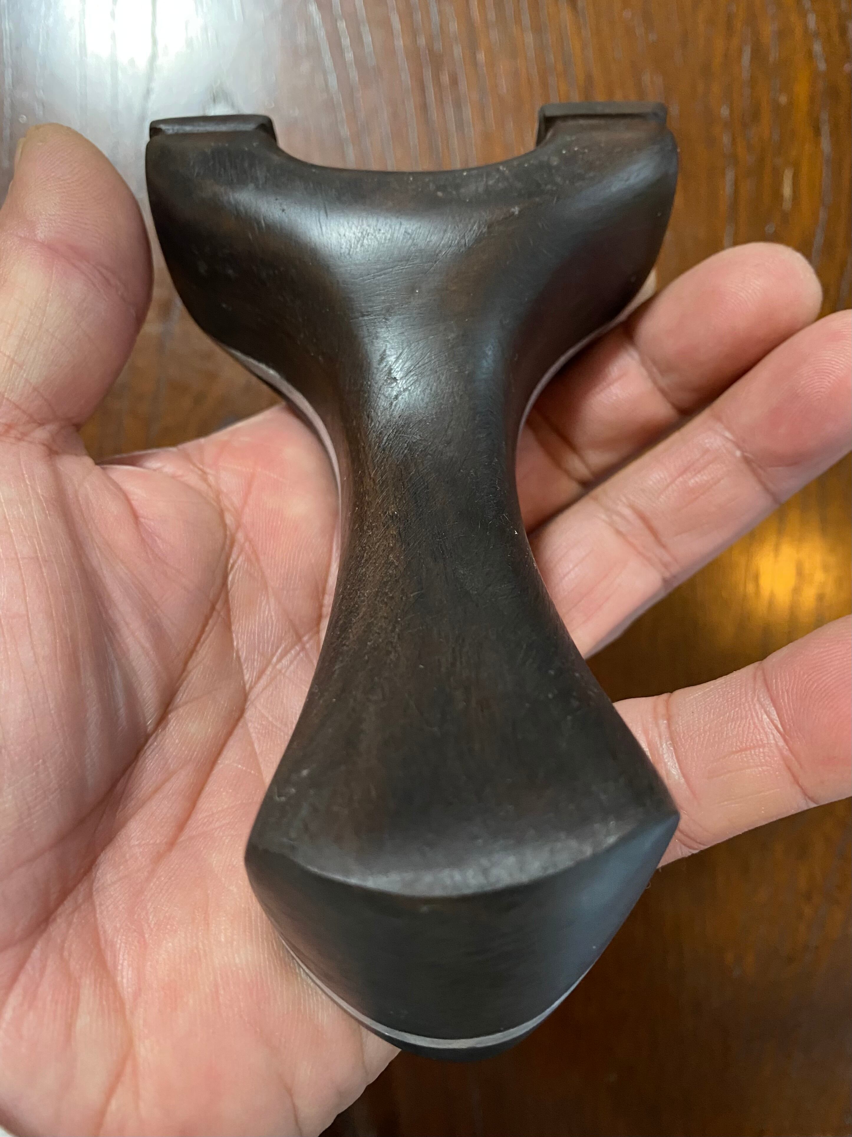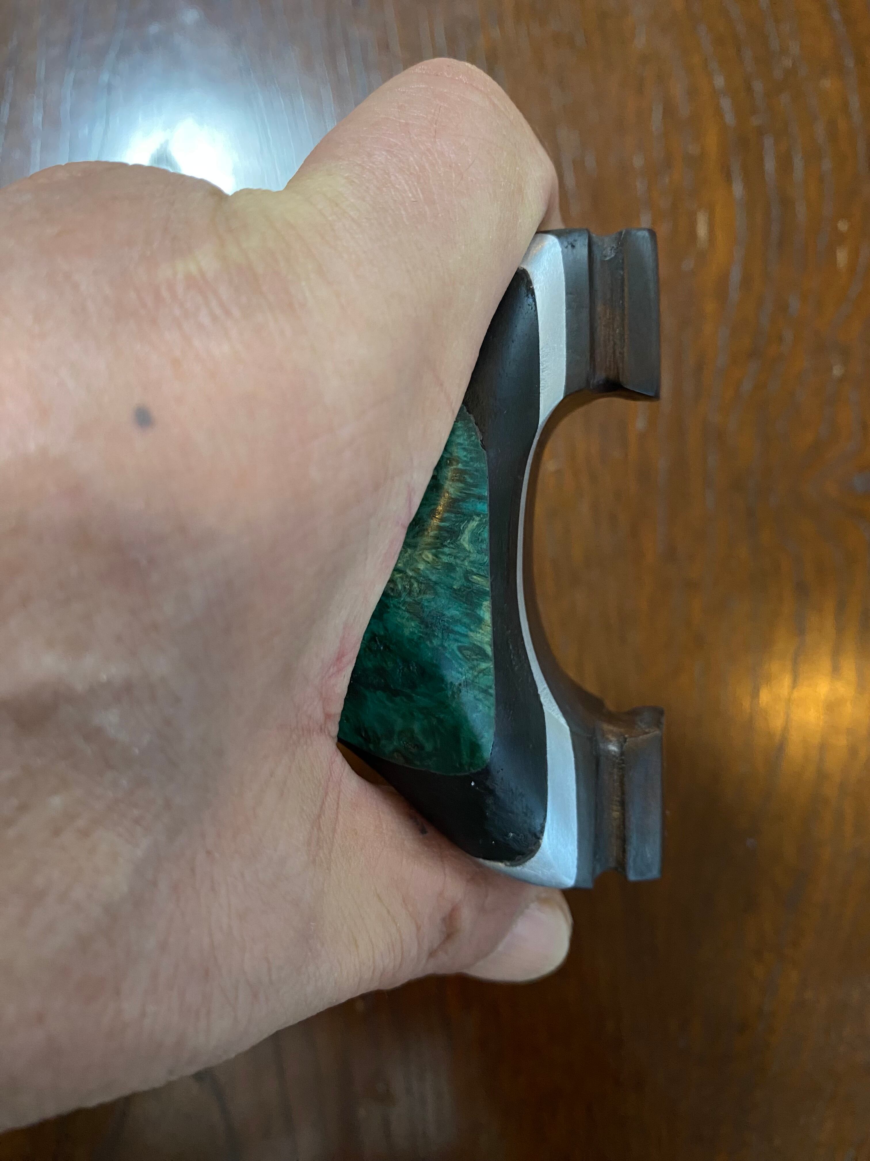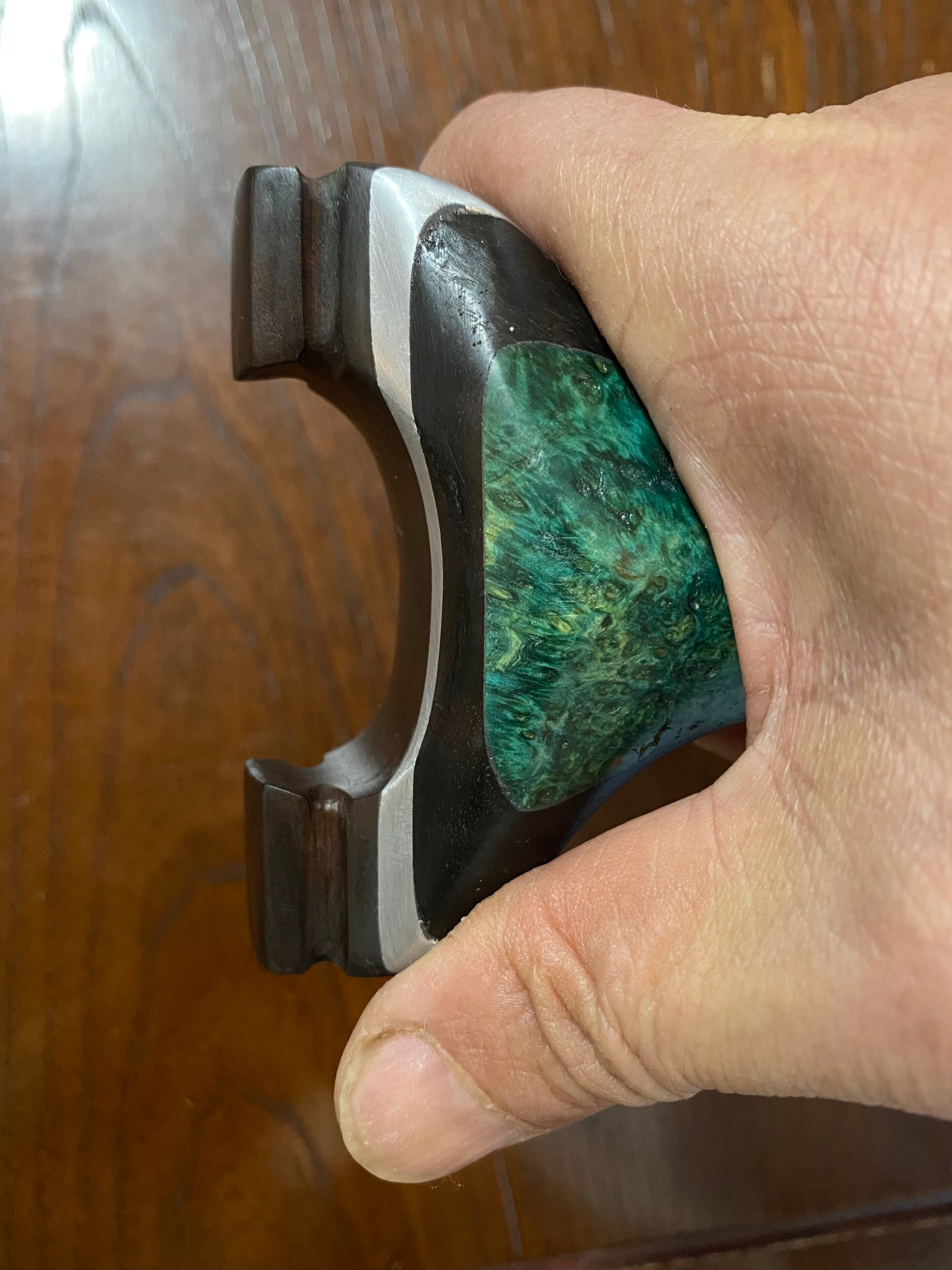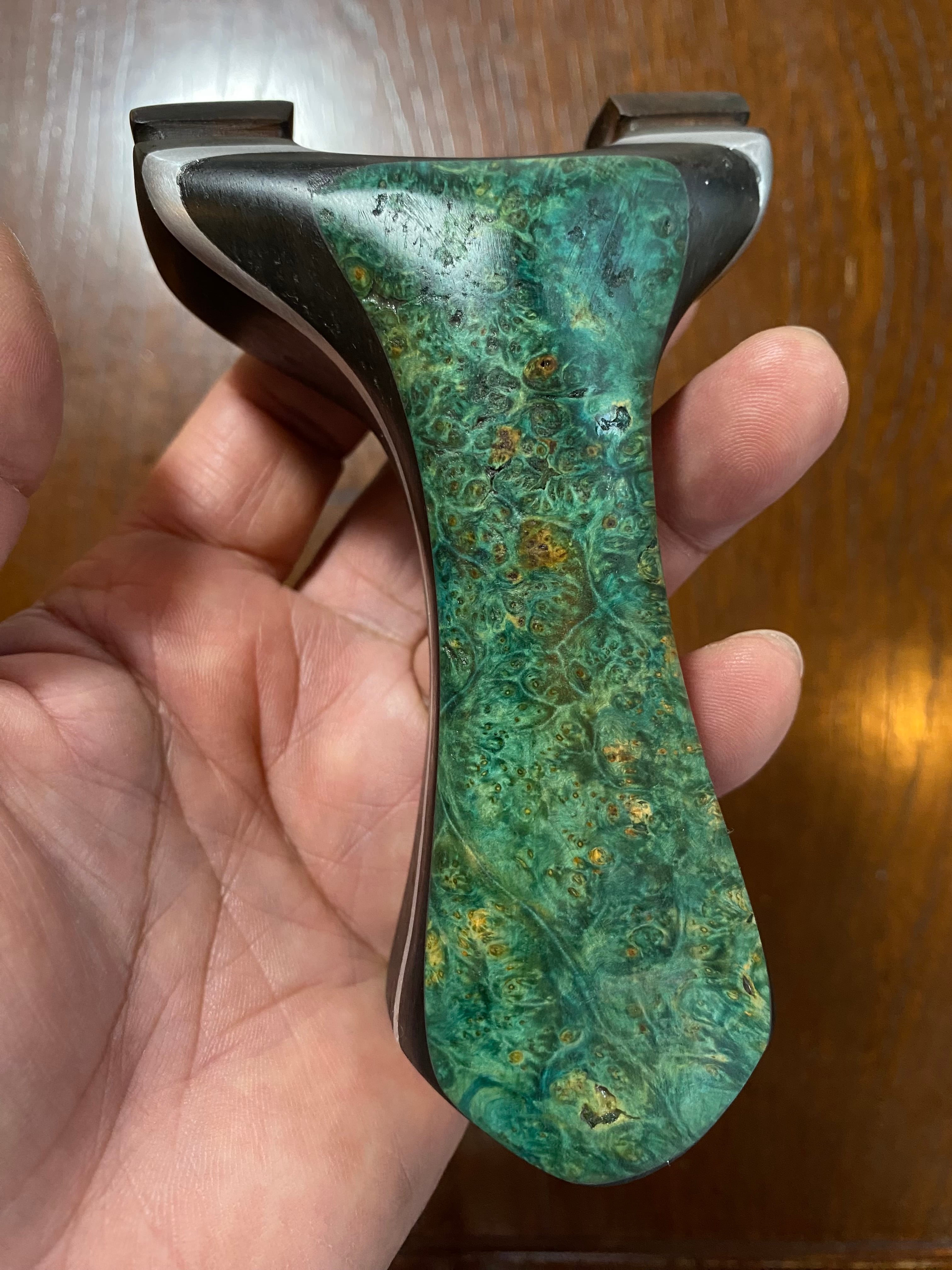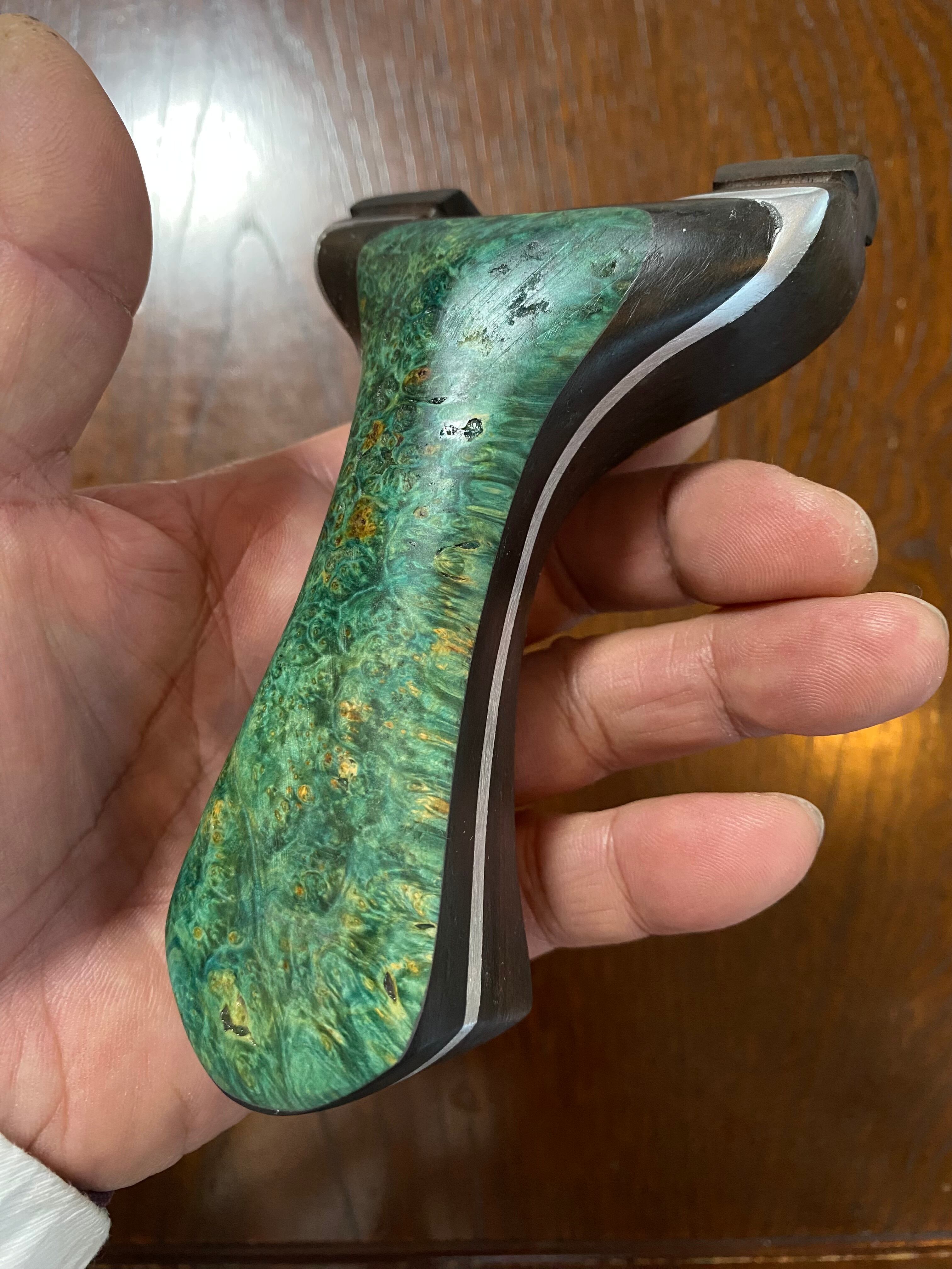 ■ No.873 スタビライズドウッド緑スリングショット(黒檀・ウォールナット・アルミサンド)は、これだけで数千円する高価な緑系のスタビライズドウッドを前面に配した洗練されたデザインが特徴のスリングショットです。ウォールナット、アルミ板、黒檀、スタビライズドウッドの4層構造が、他に無い特別な存在感を醸し出し、所有する喜びを一層引き立てます。現時点で庵野吽製スリングショットの最高峰とも言える作品です。