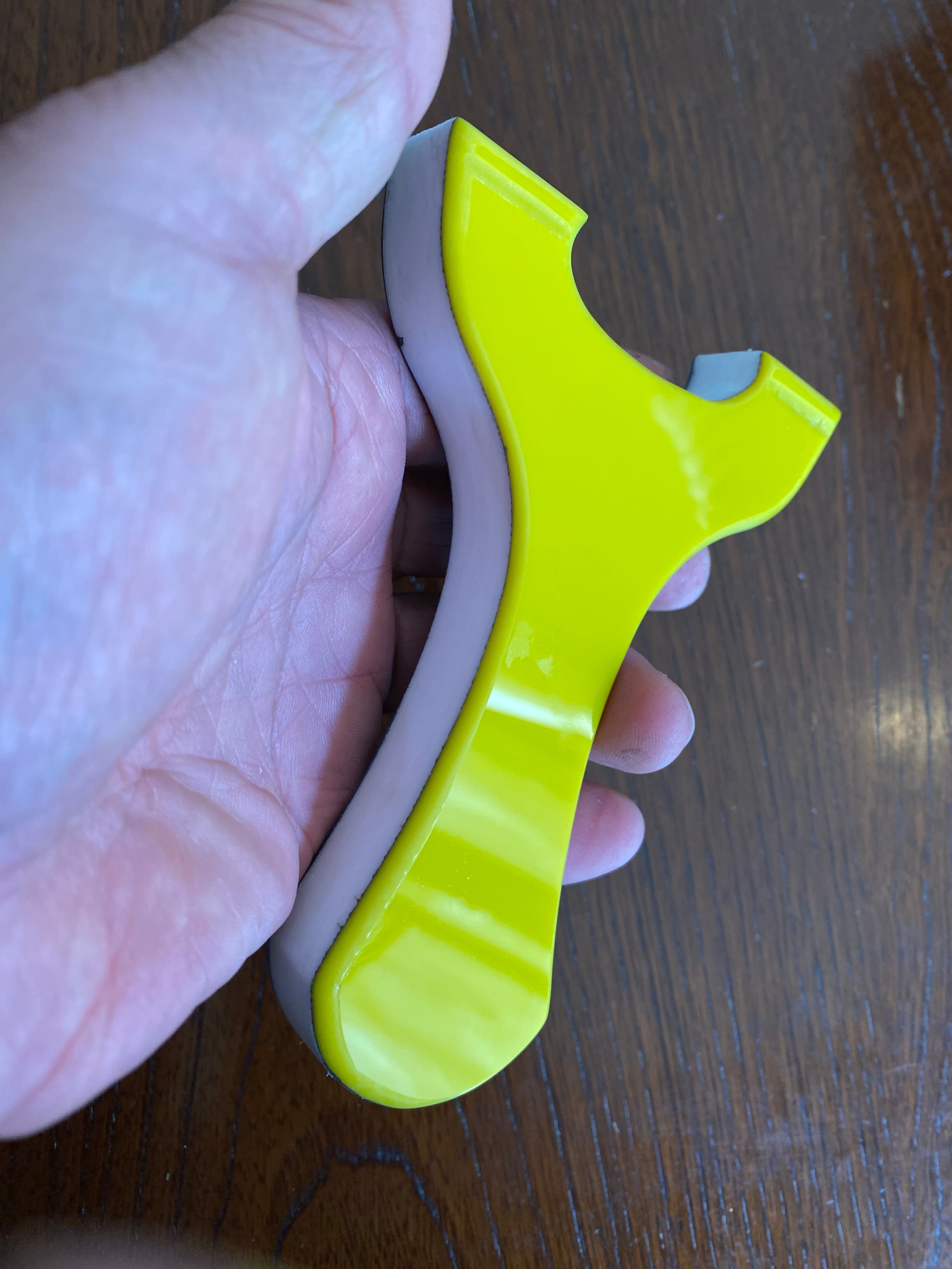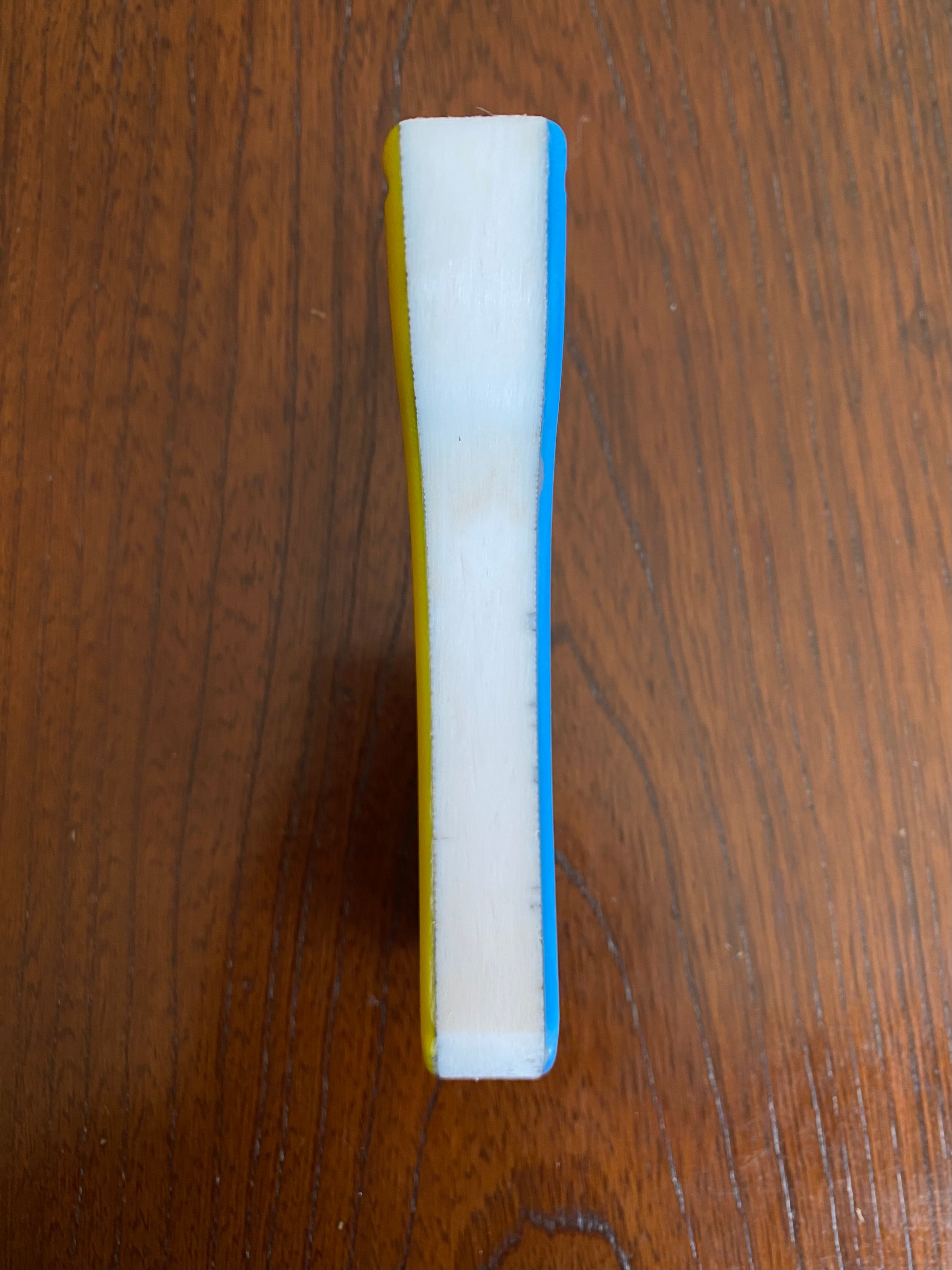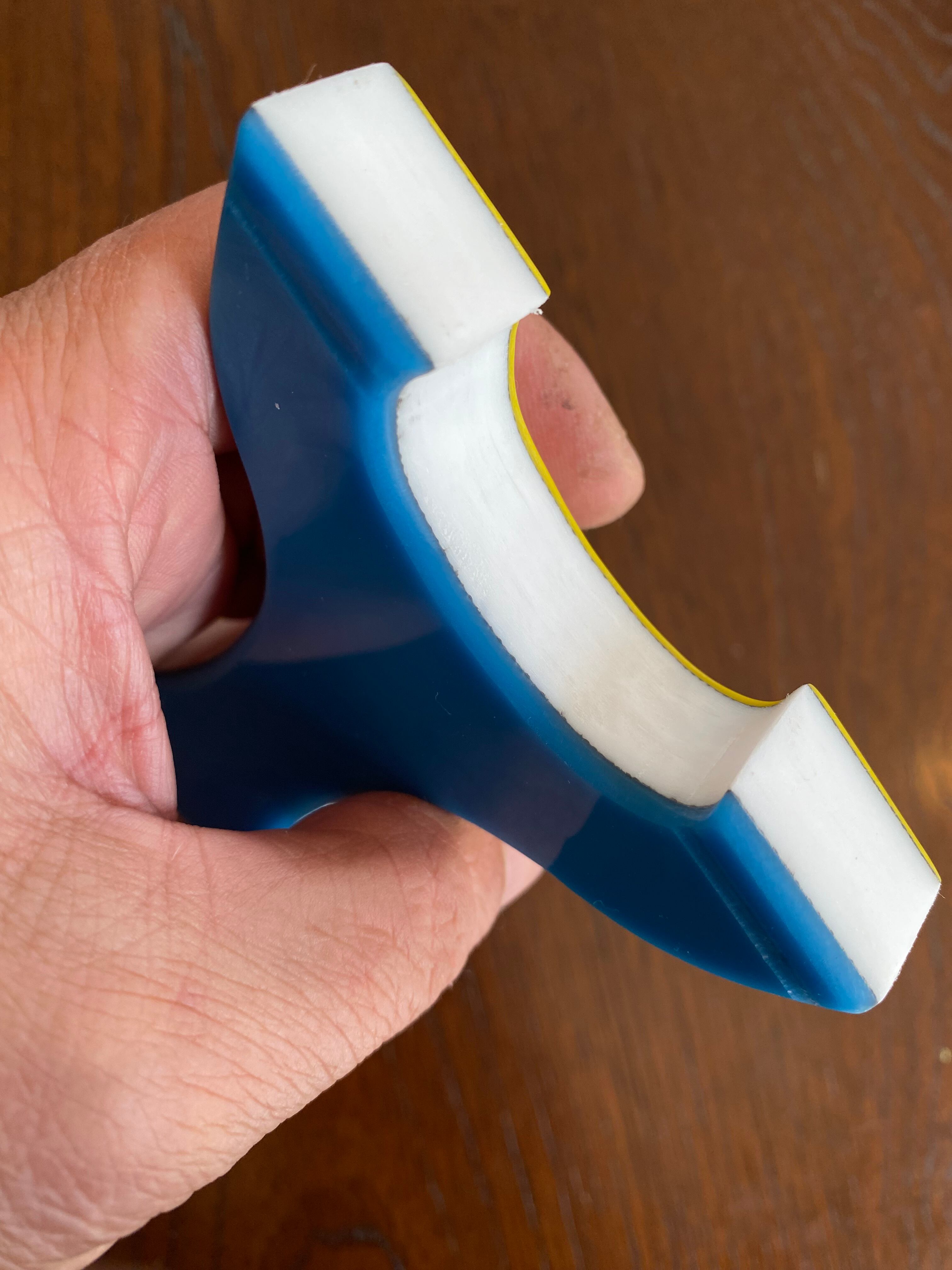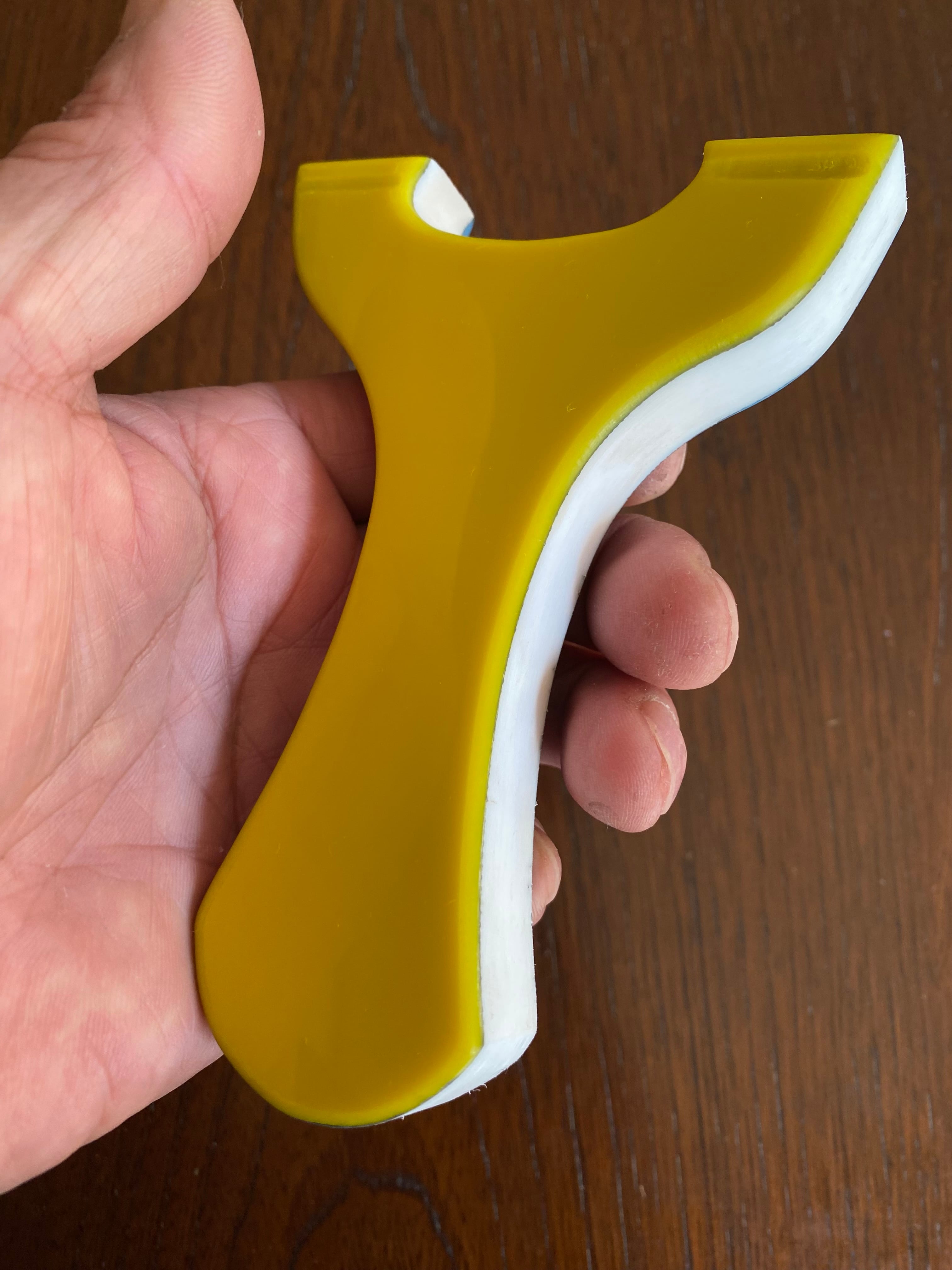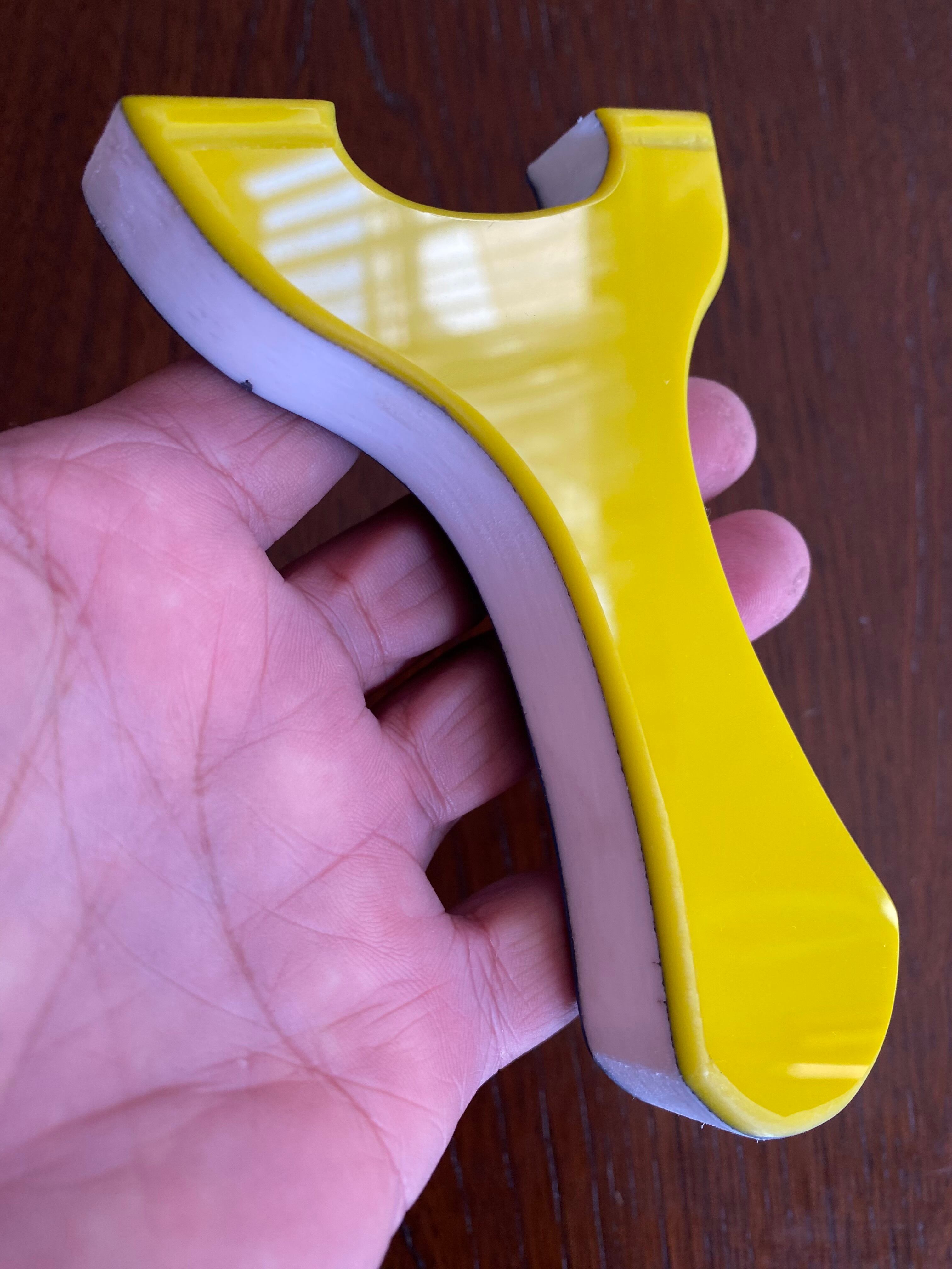 ■ No.877 Blue&Yellow スリングショットは、厚さ15mmの白い樹脂に水色と黄色のアクリル板を貼り付けた、目を引くカラフルなデザインのスリングショットです。この平型タイプのスリングショットは、裏表同じなので、お好みに合わせて色を選択できる自由さが魅力です。デザインだけでなく、快適さでも評価の高いNEW WAVE技術を駆使しており、確かな命中率を実現しています。