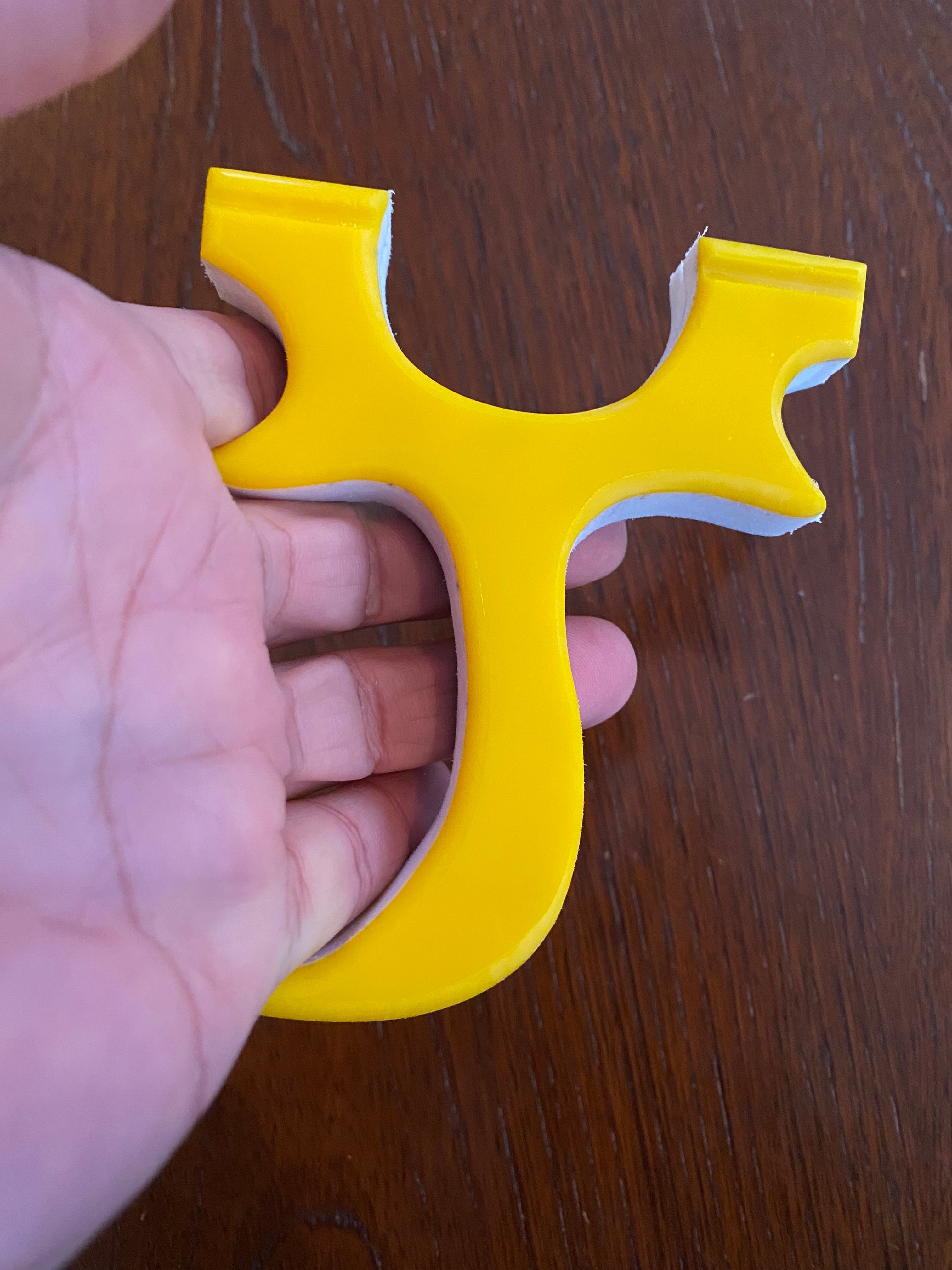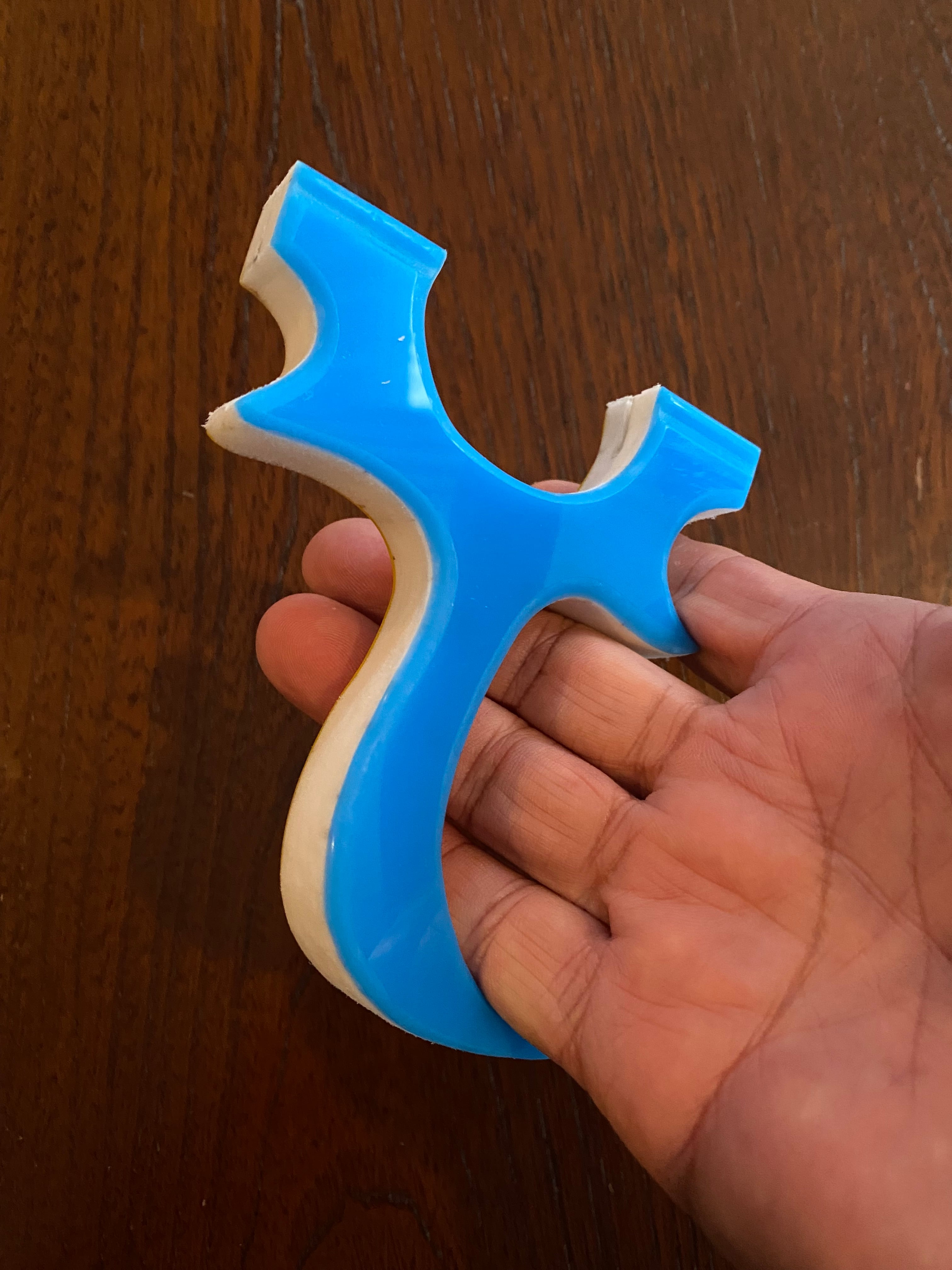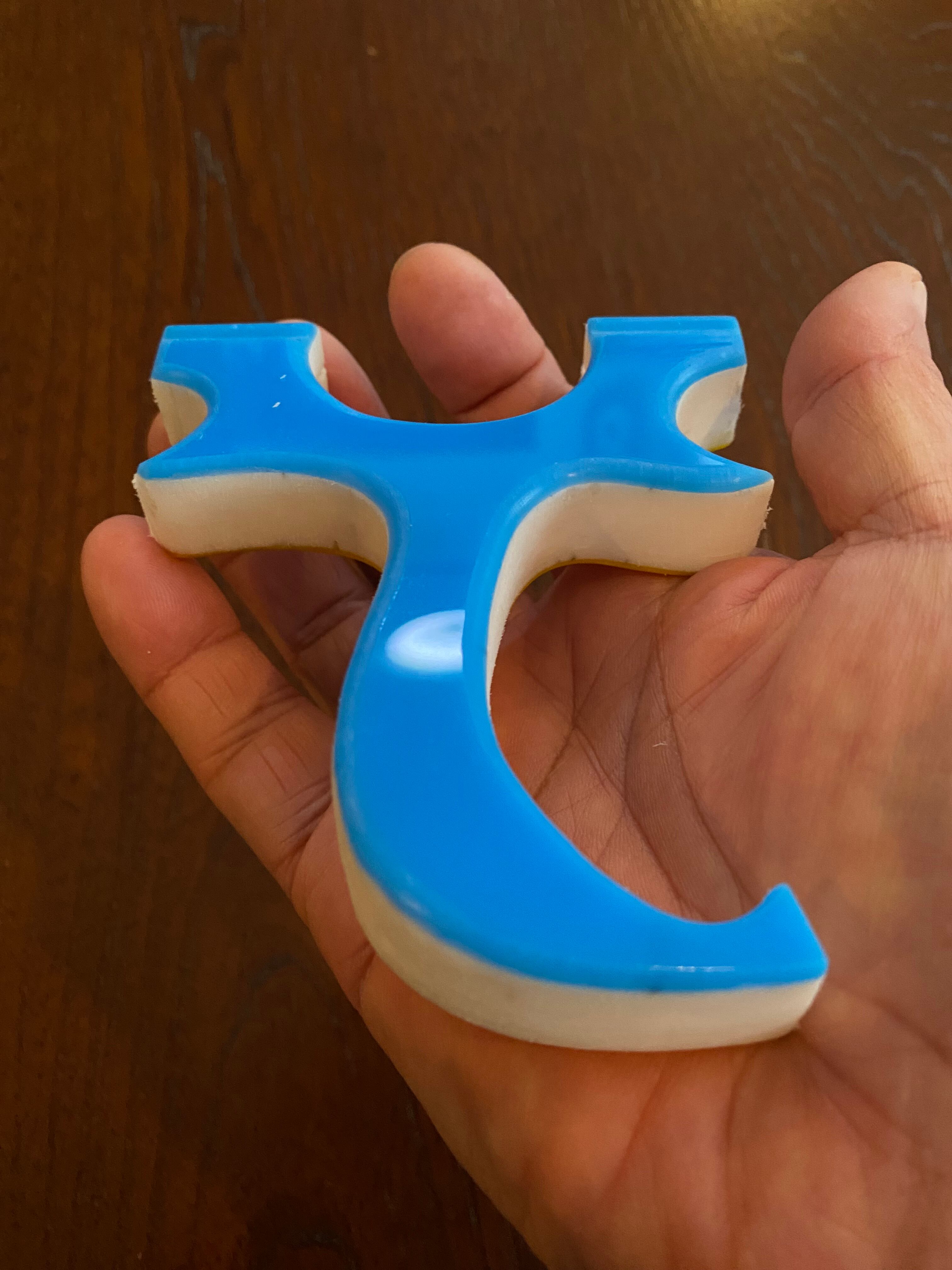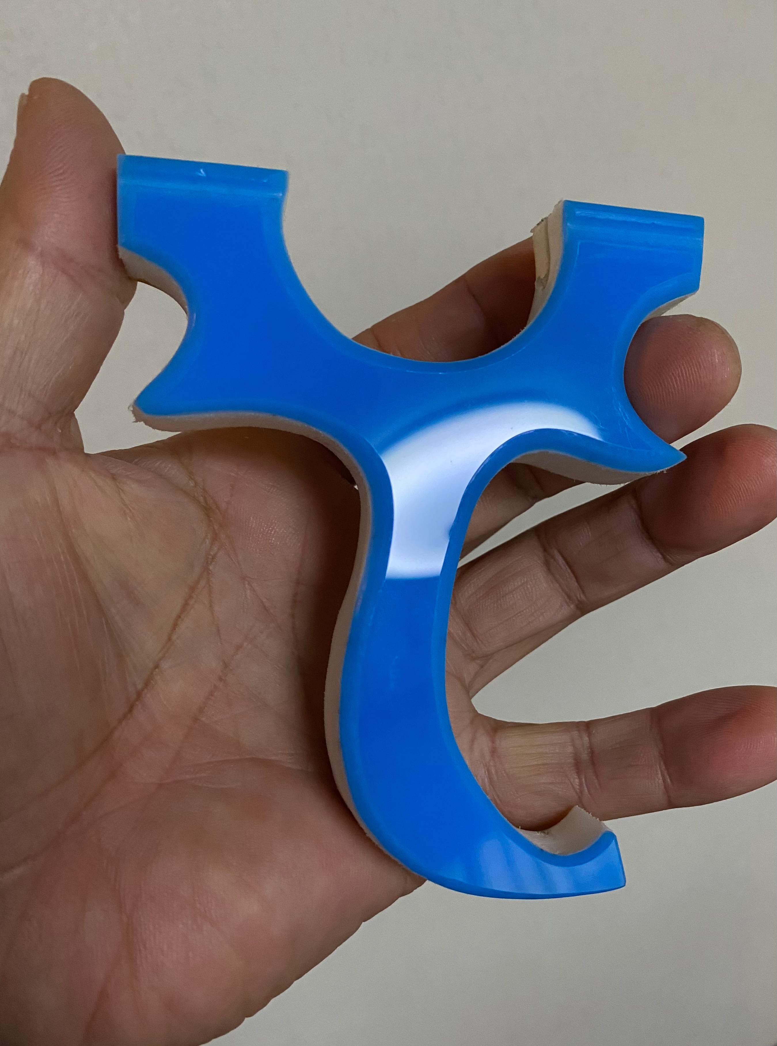 ■ No.882 Blue &Yellow Cハンドル スリングショット(TOP SLOT)は、厚さ15mmの白い樹脂に水色と黄色のアクリル板を貼り付けた、目を引くカラフルなデザインのスリングショットです。この平型タイプのスリングショットは、裏表同じなので、お好みに合わせて色を選択できる自由さが魅力です。デザインだけでなく、快適さでも評価の高いTOP SLOT技術を採用しており、(ゴム巻き式も可能)素早いゴム装着と確かな命中率を実現しています。またヘッド幅は25mmあり、広めの平ゴムでも装着が可能です。