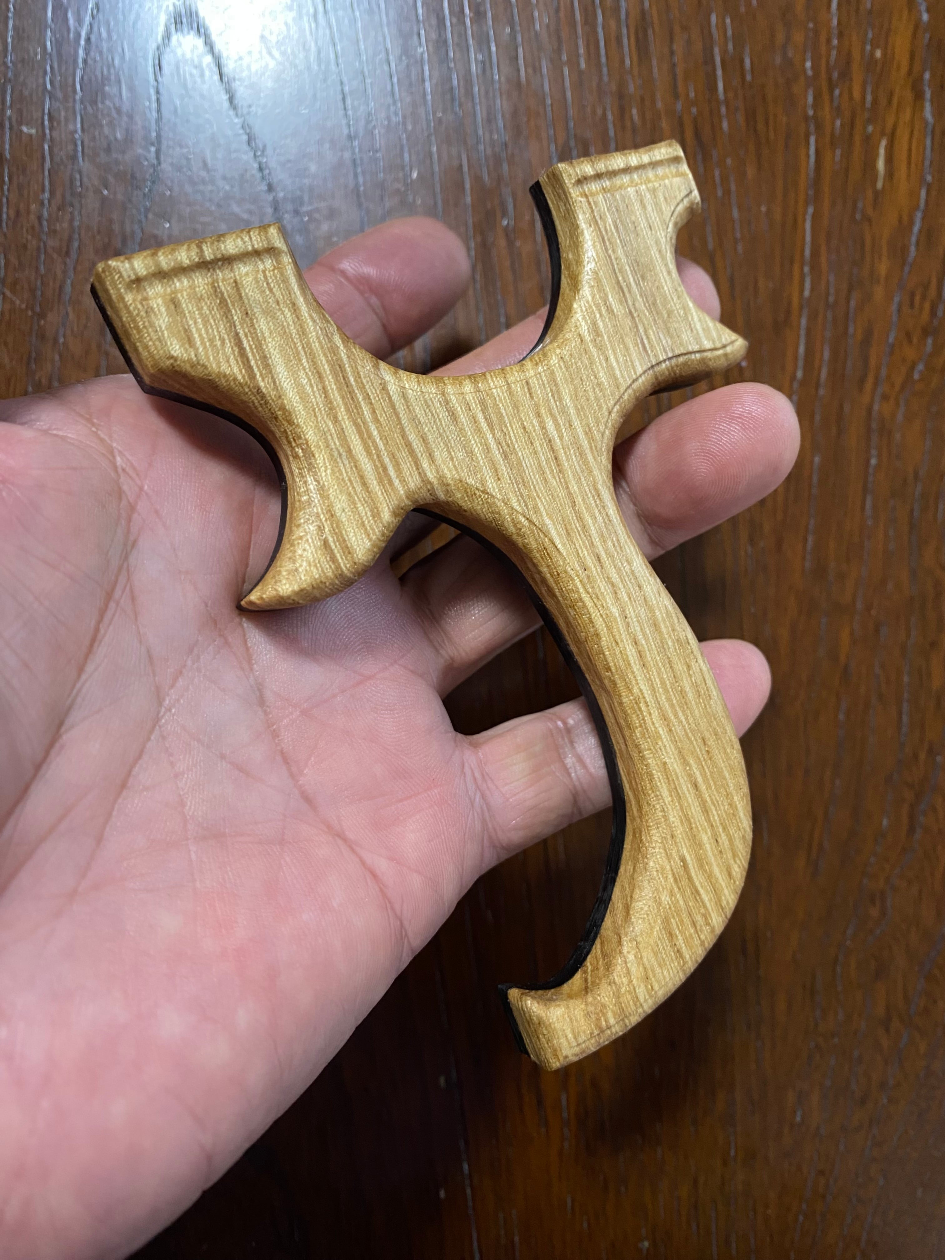 ■ No.885 Cハンドルスリングショット 表面黒檀・薄型は、ひらがなの「そ」の形をモチーフにした美しいデザインの薄型スリングショットです。表面には高級感漂う黒檀を使用し、持った時のフィット感は3点支持のため抜群です。携帯性に優れており、サブ機としても最適な一品です。