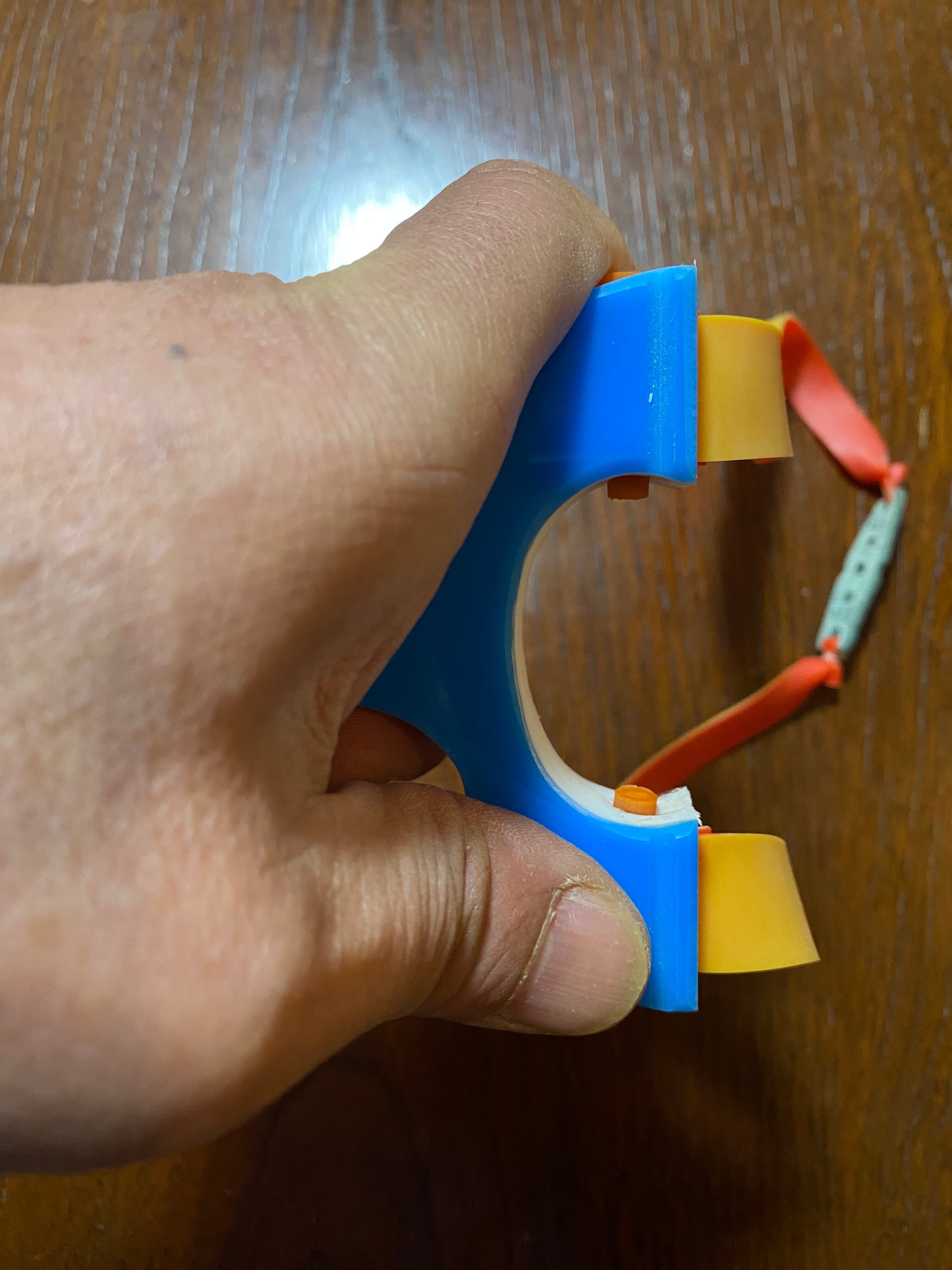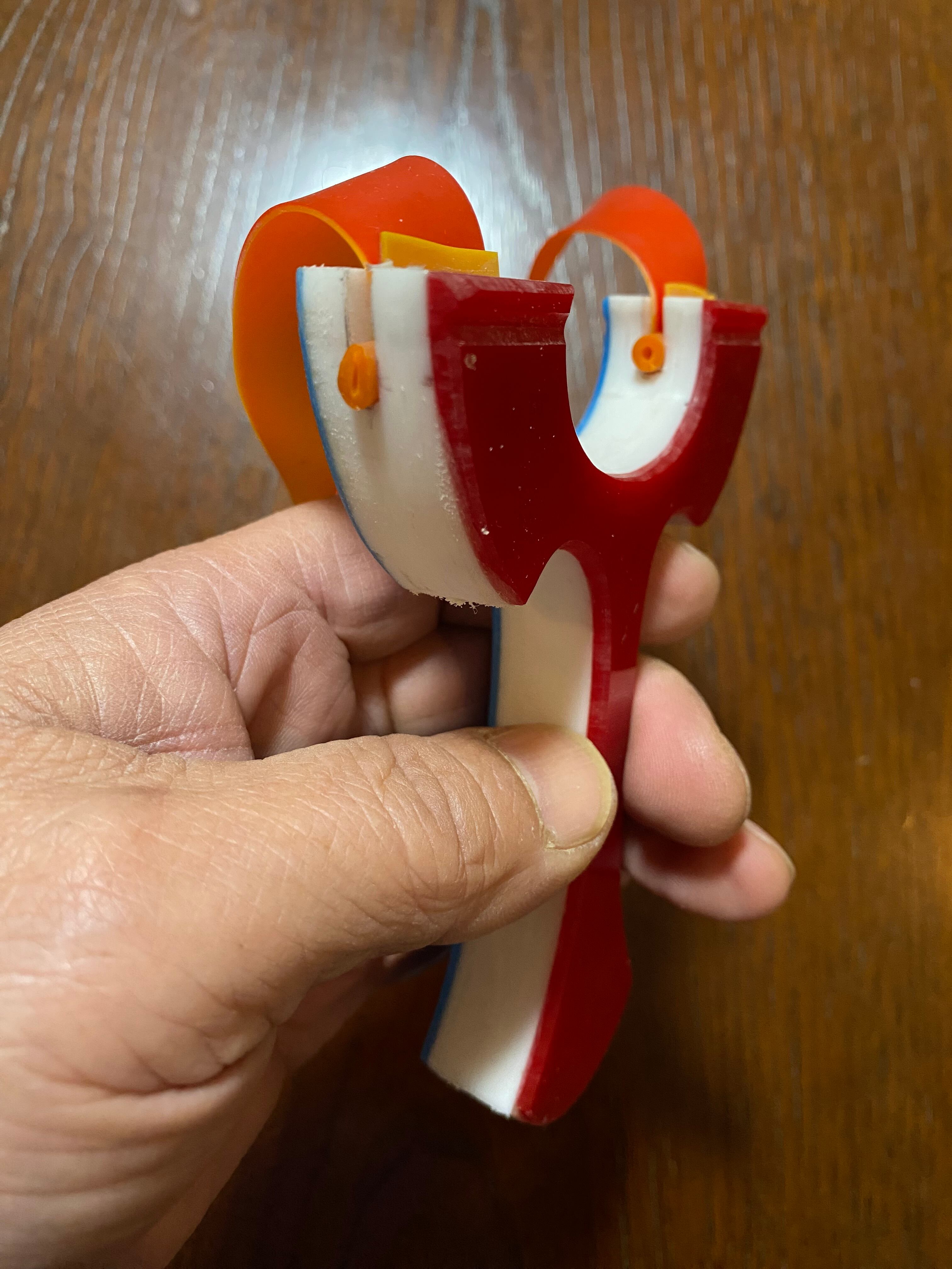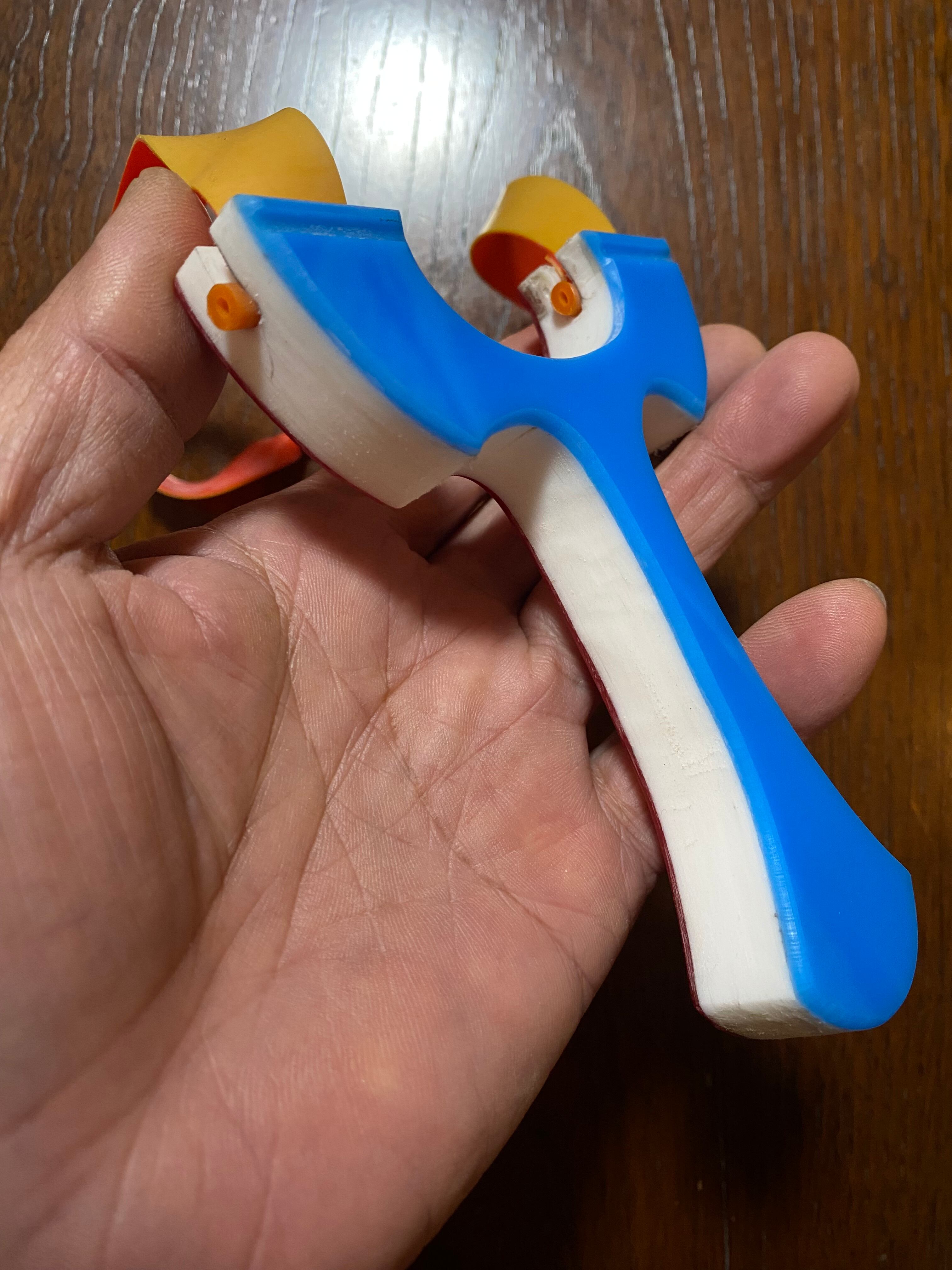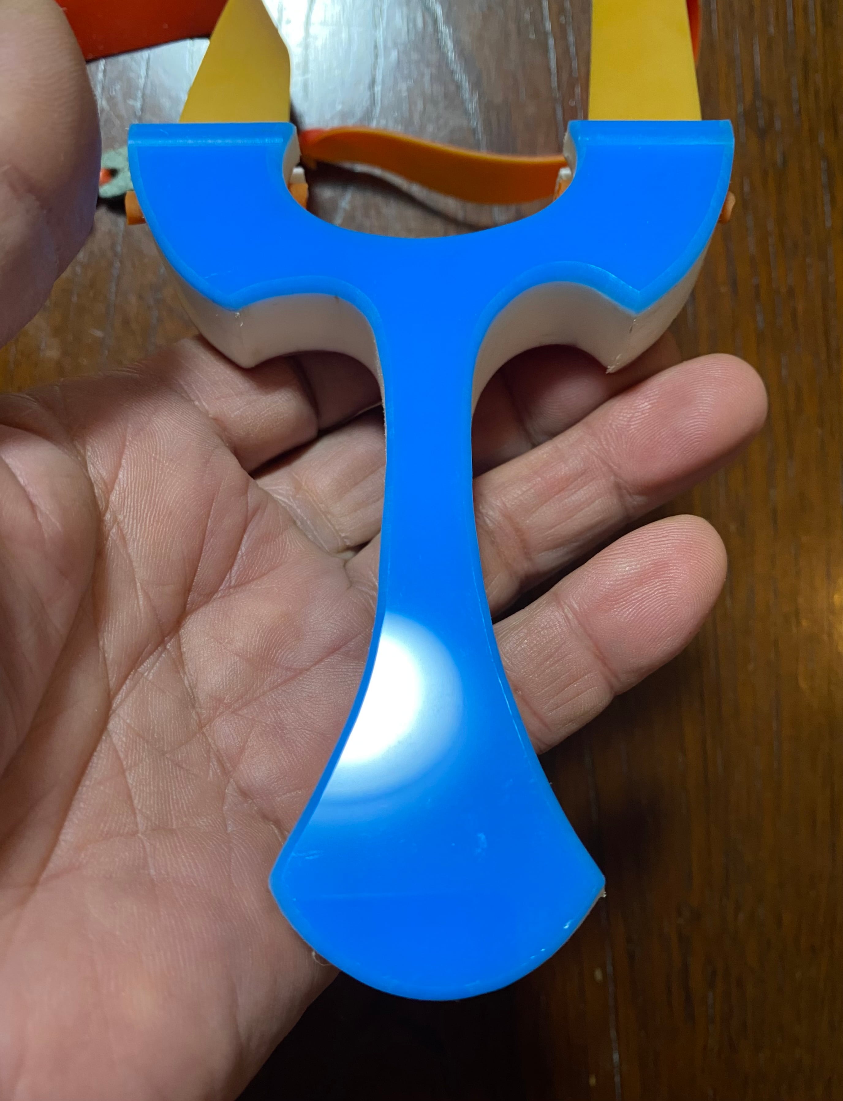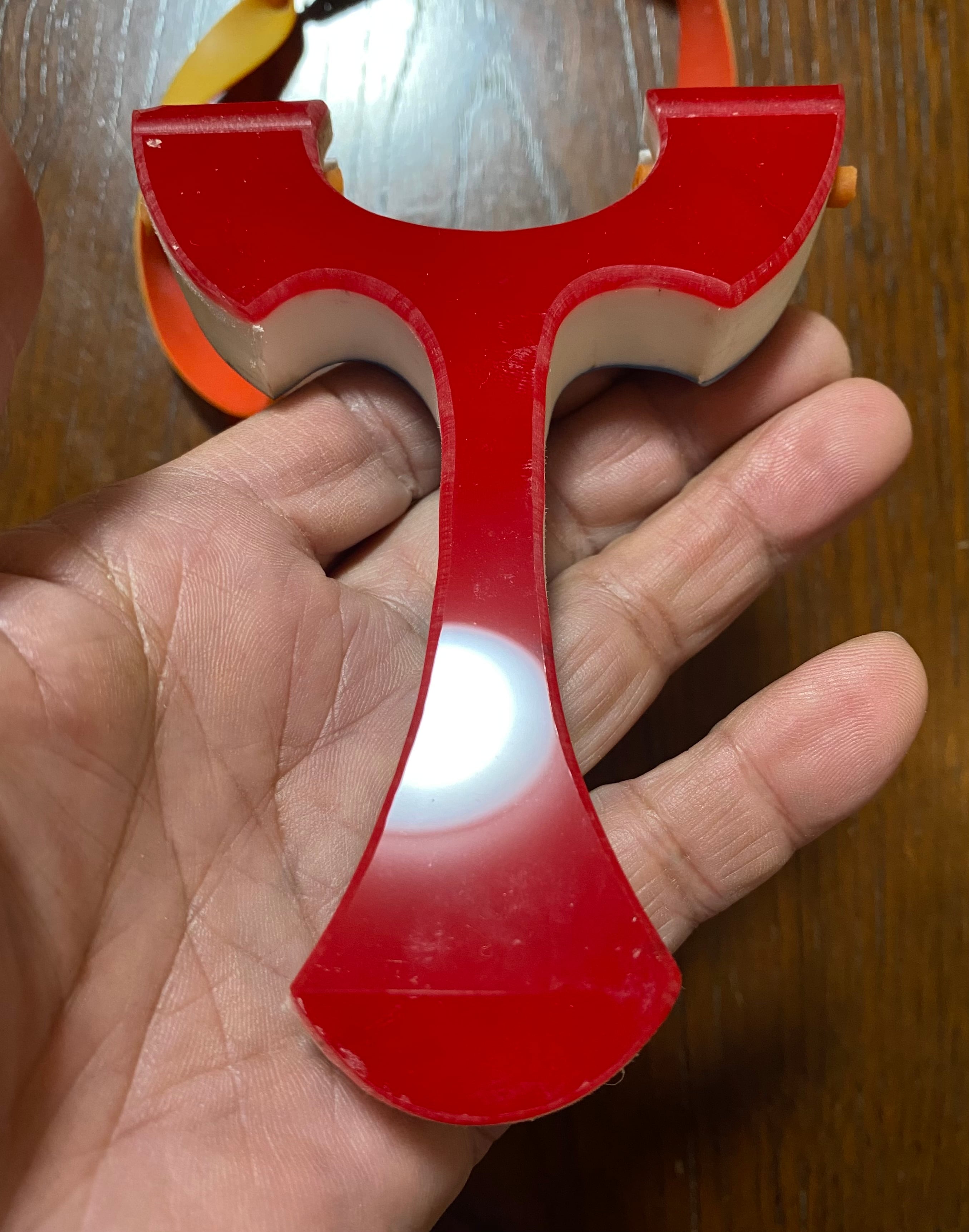 このスリングショットは、エルゴノミクスに基づいたデザインにより、持ちやすさと安定感を両立しています。軽快なデザインながら、しっかりとした剛性を保っているため、初心者でも安心して扱える仕様になっています。美しいブルーと赤のアクリルと白樹脂のコアは、見た目のインパクトだけでなく、射撃時の快適さにも寄与します。