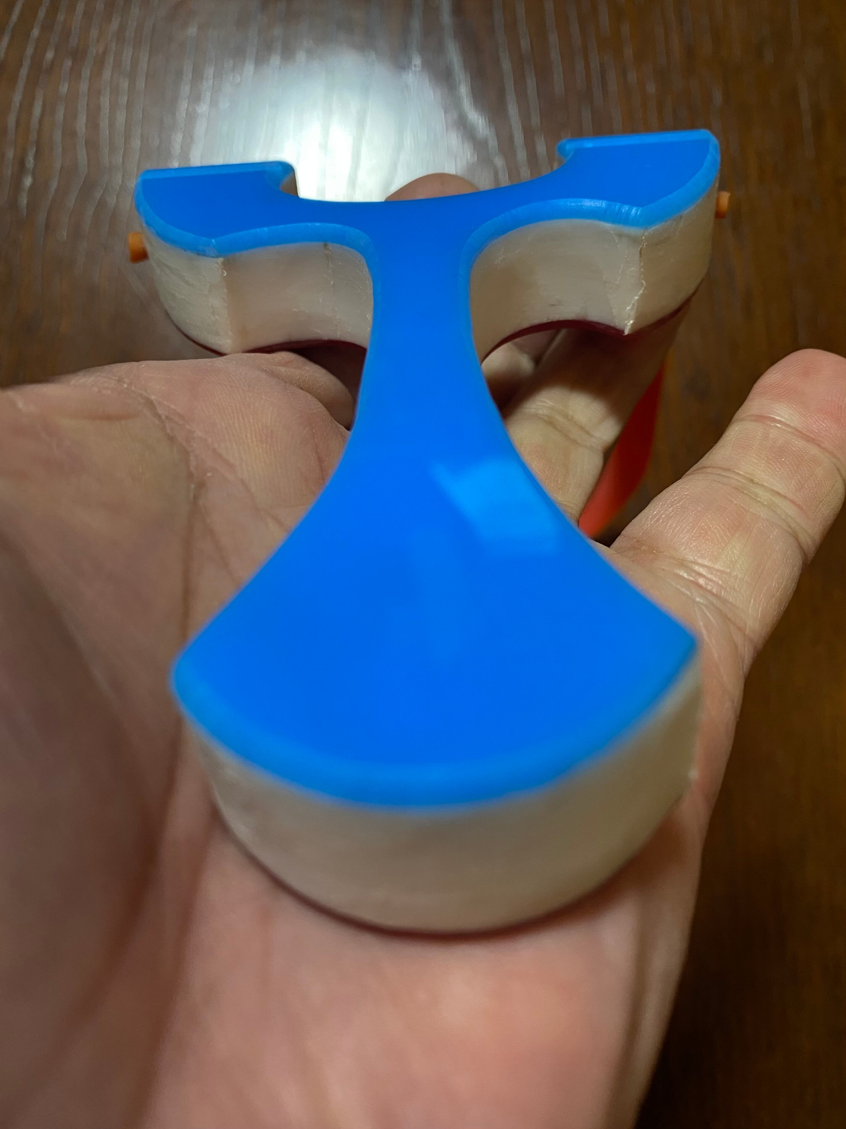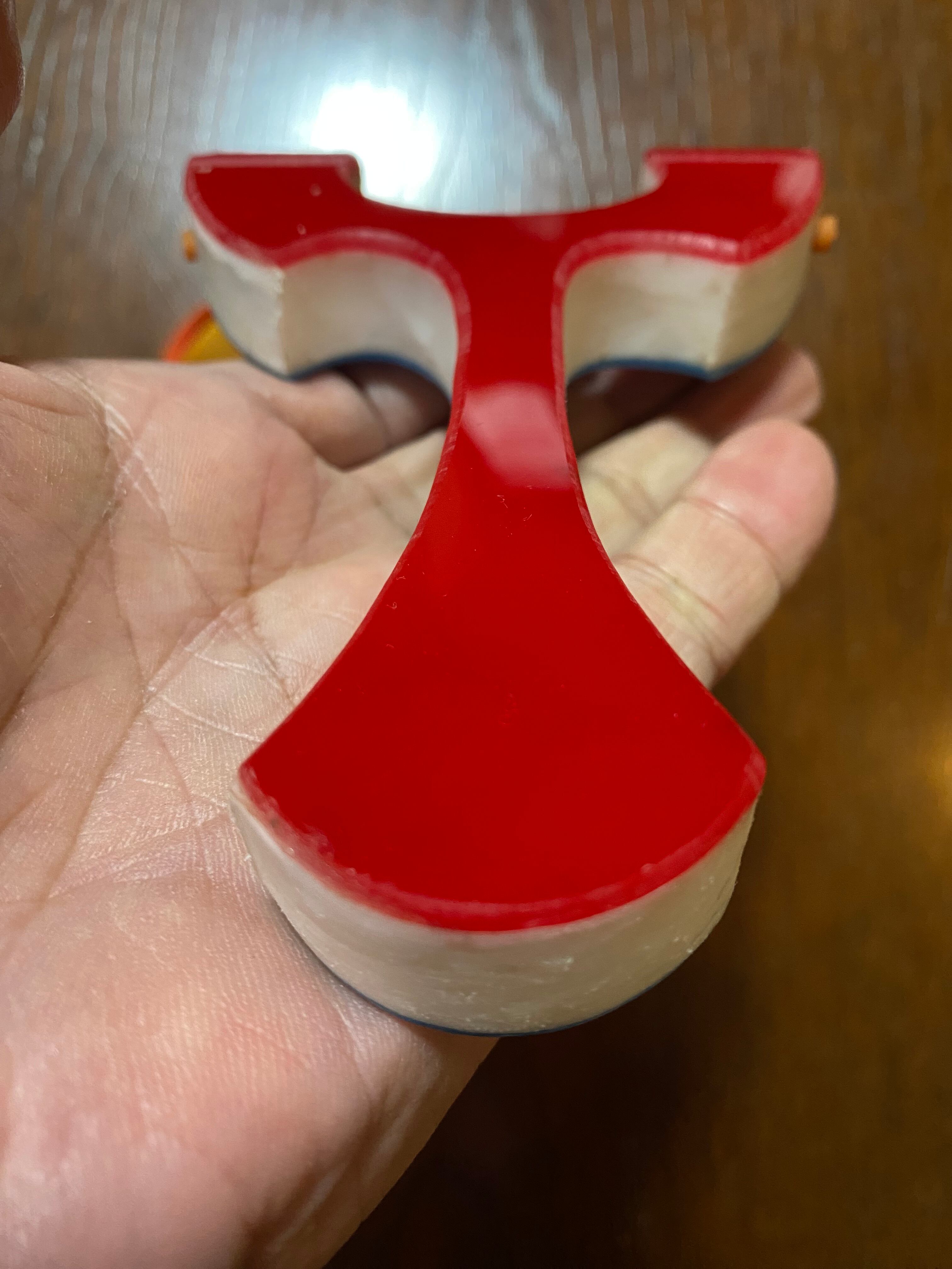 ■ No.888 Hawk Eye Refine Blue & Red(樹脂コア)TOP SLOT 厚手ゴム専用は、ブルーと赤のアクリルと白い樹脂のコアを使用した美しいデザインのスリングショットです。このモデルは、通常よりもTOPのスリット幅が広く(2.2mm)厚手のゴム(1.0mm〜1.5mm)を取り付けられるように調整したTOP SLOT式の取り付け方式を採用しています。固定には5mmの太さのゴム管を使用します。ハンドルは手に馴染む感触を重視した設計が特徴となっています。脇の奥まで指が届くため、フレームレス感覚で射撃に集中できるのが魅力です。