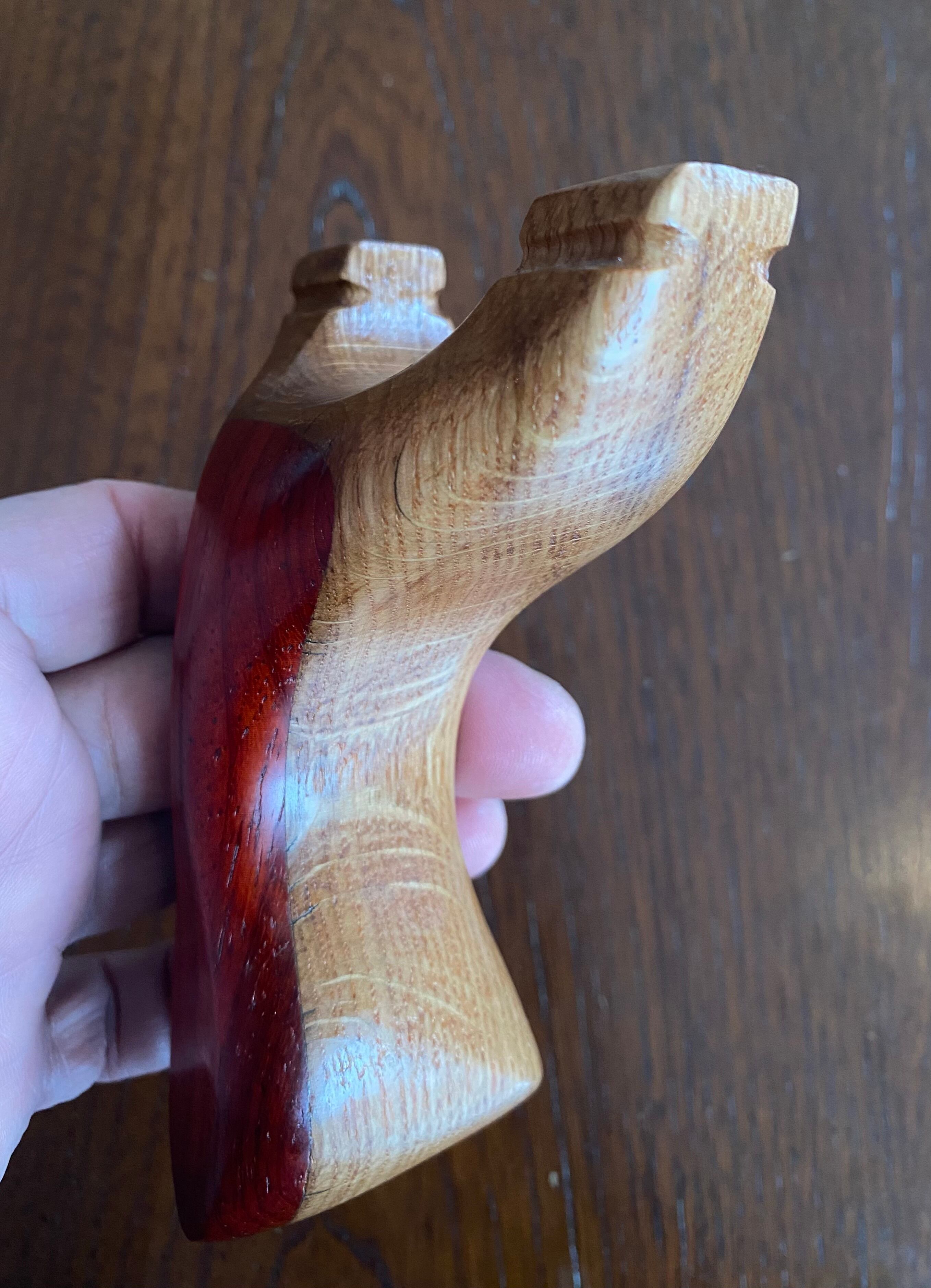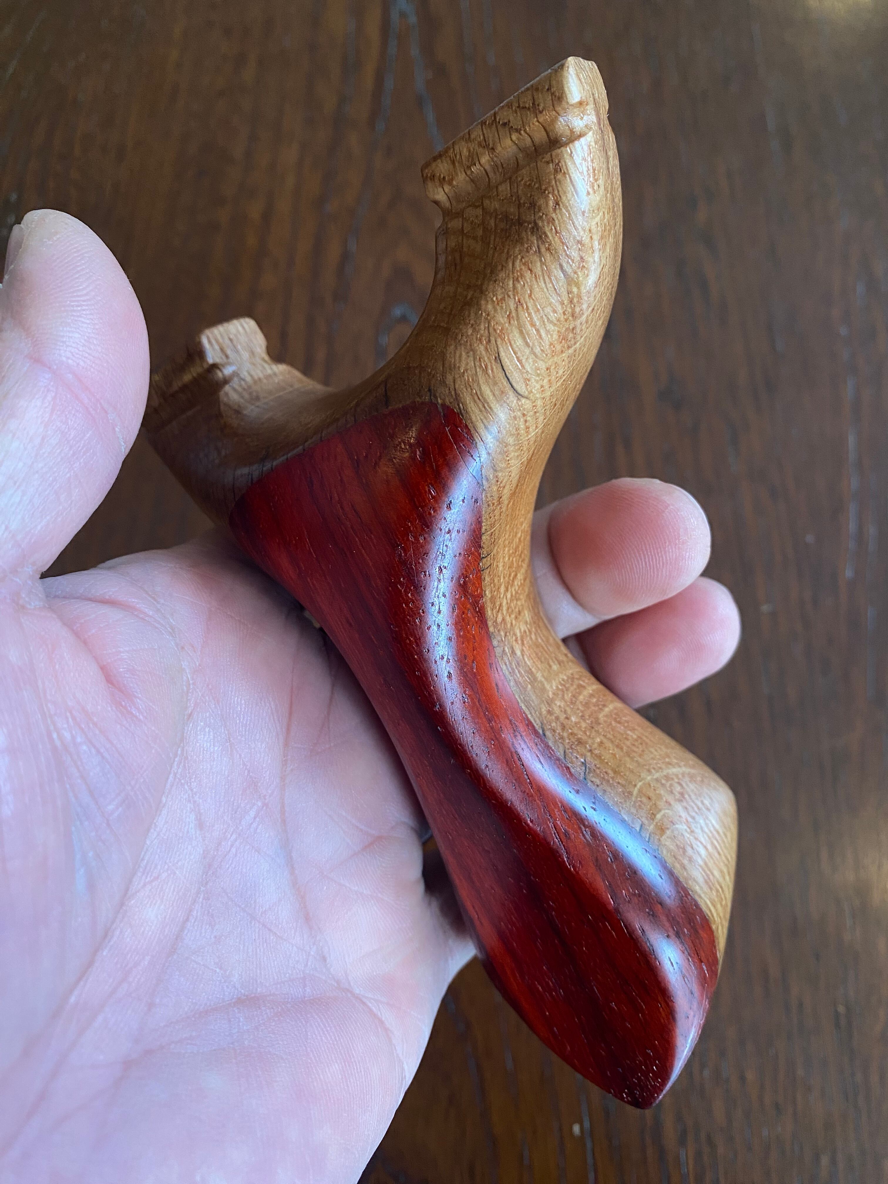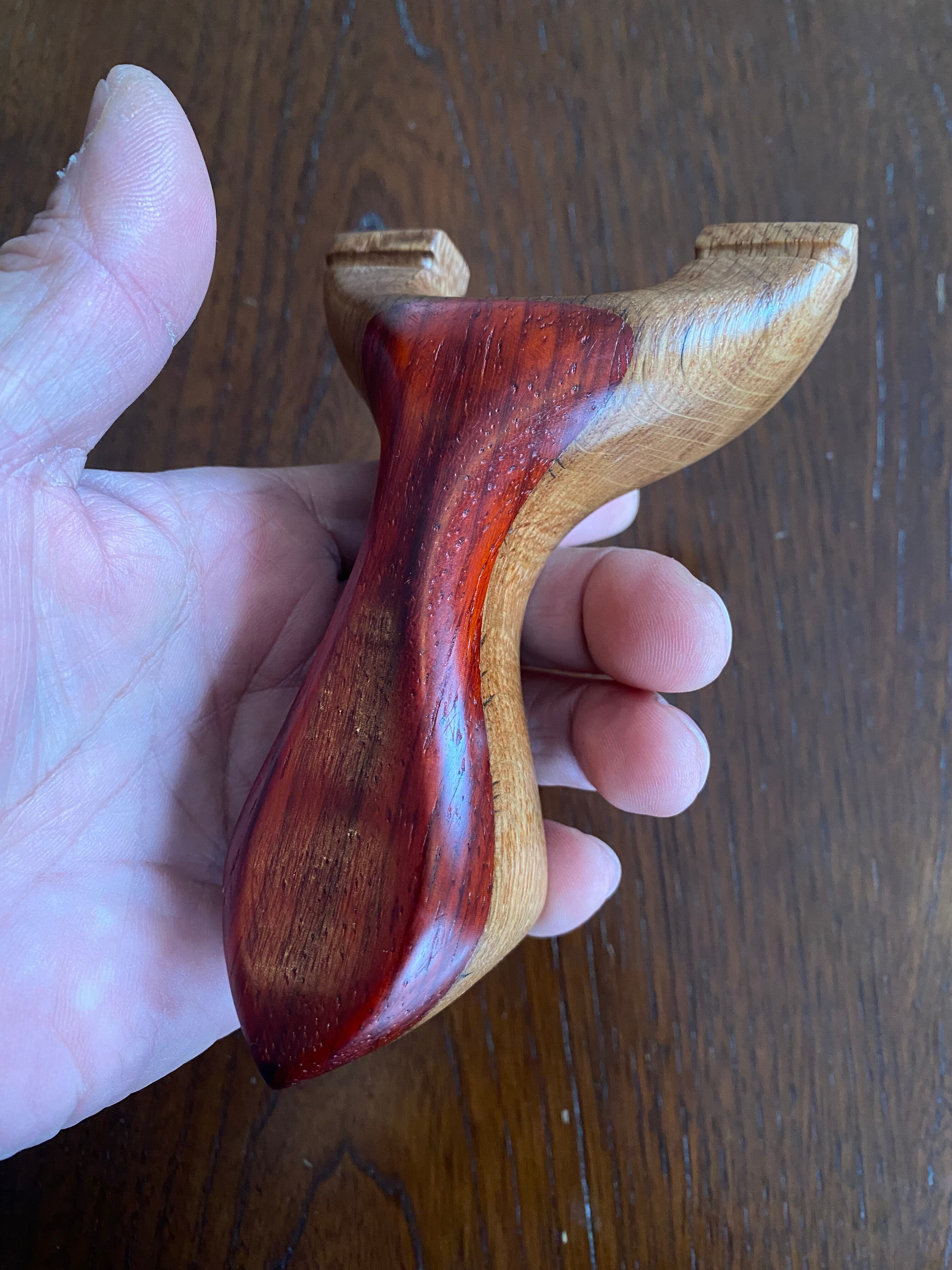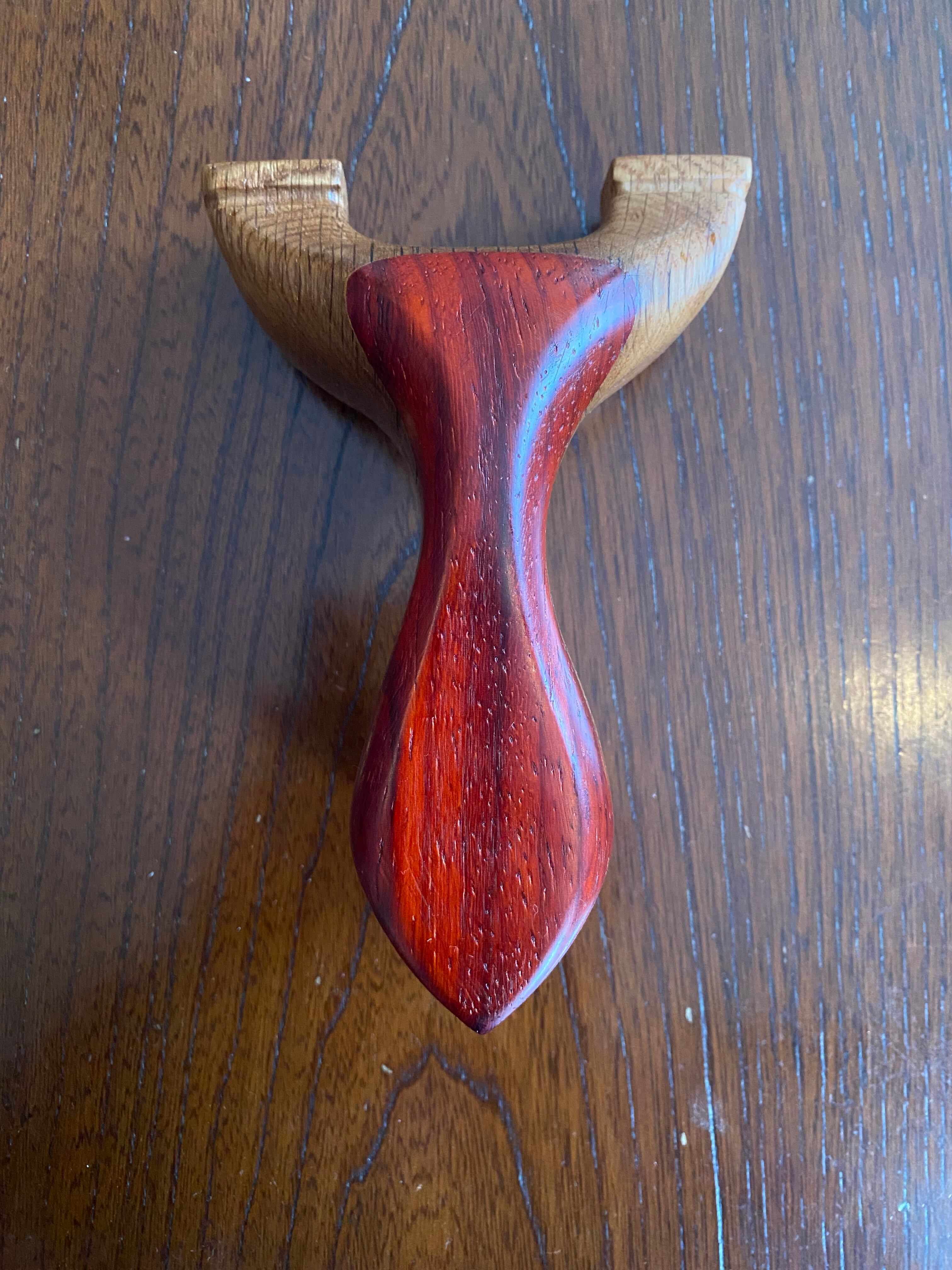■ No.893 New Wave Unknown Style(レッドウッド+白樫?)は、New Waveシリーズの中で特に庵野吽流を取り入れたスッキリとしたデザインが特徴のスリングショットです。白樫と推測される硬い木材の上にレッドウッドを贅沢に使用し、細めの首部分は前後に厚くしてしっかりと補強されています。その結果、軽やかでありながらも安定感を持つ最新型のスリングショットが完成しました。