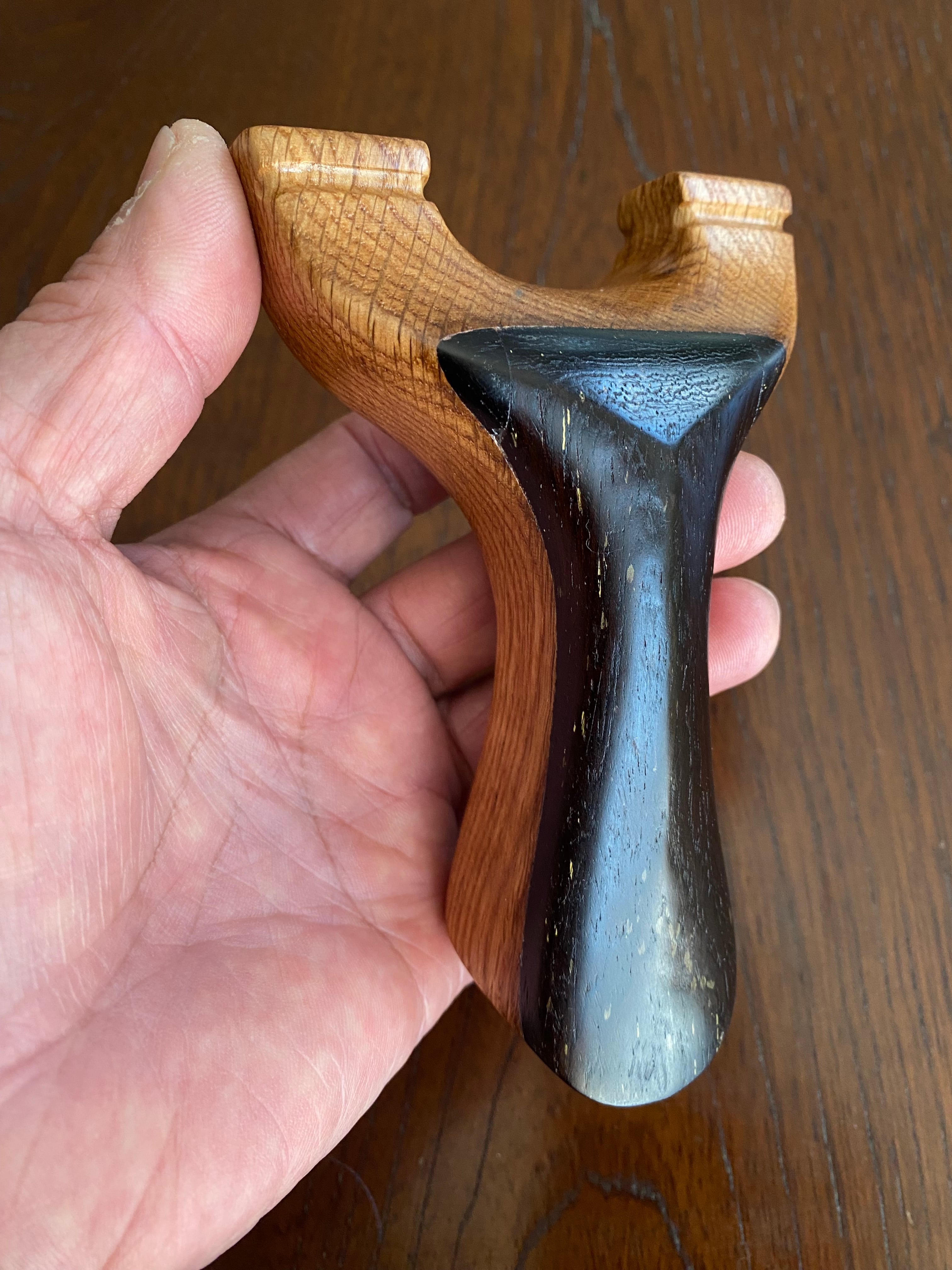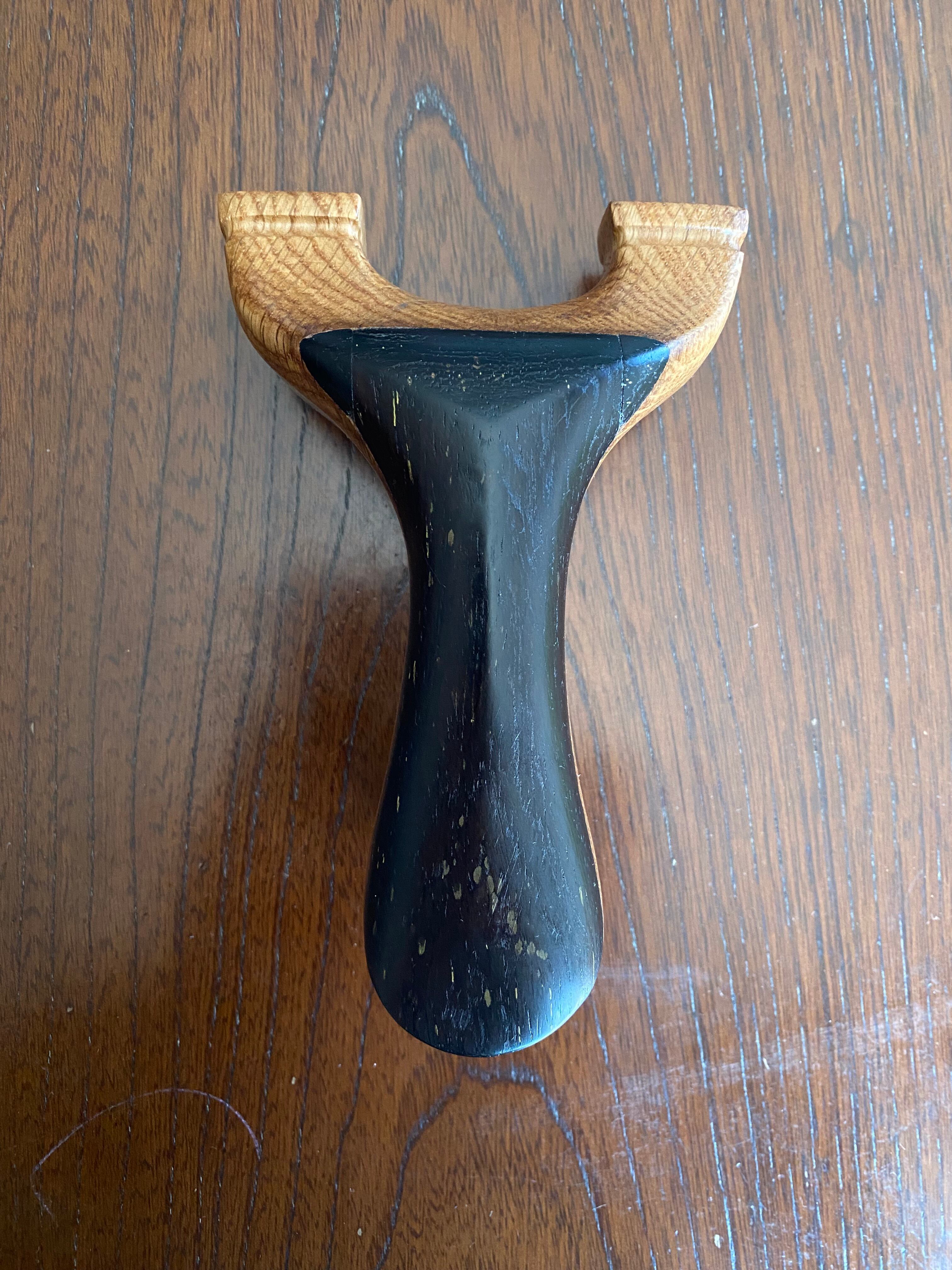 ■ No.896 New Wave Unknown Style(鉄刀木 +白樫?)は、New Waveシリーズの中で特に庵野吽流を取り入れたスッキリとしたデザインが特徴のスリングショットです。白樫と推測される硬い木材の上に鉄刀木を贅沢に使用し、首部分は前後に厚くしてしっかりと補強されています。その結果、軽やかでありながらも安定感を持つ最新型のスリングショットが完成しました。