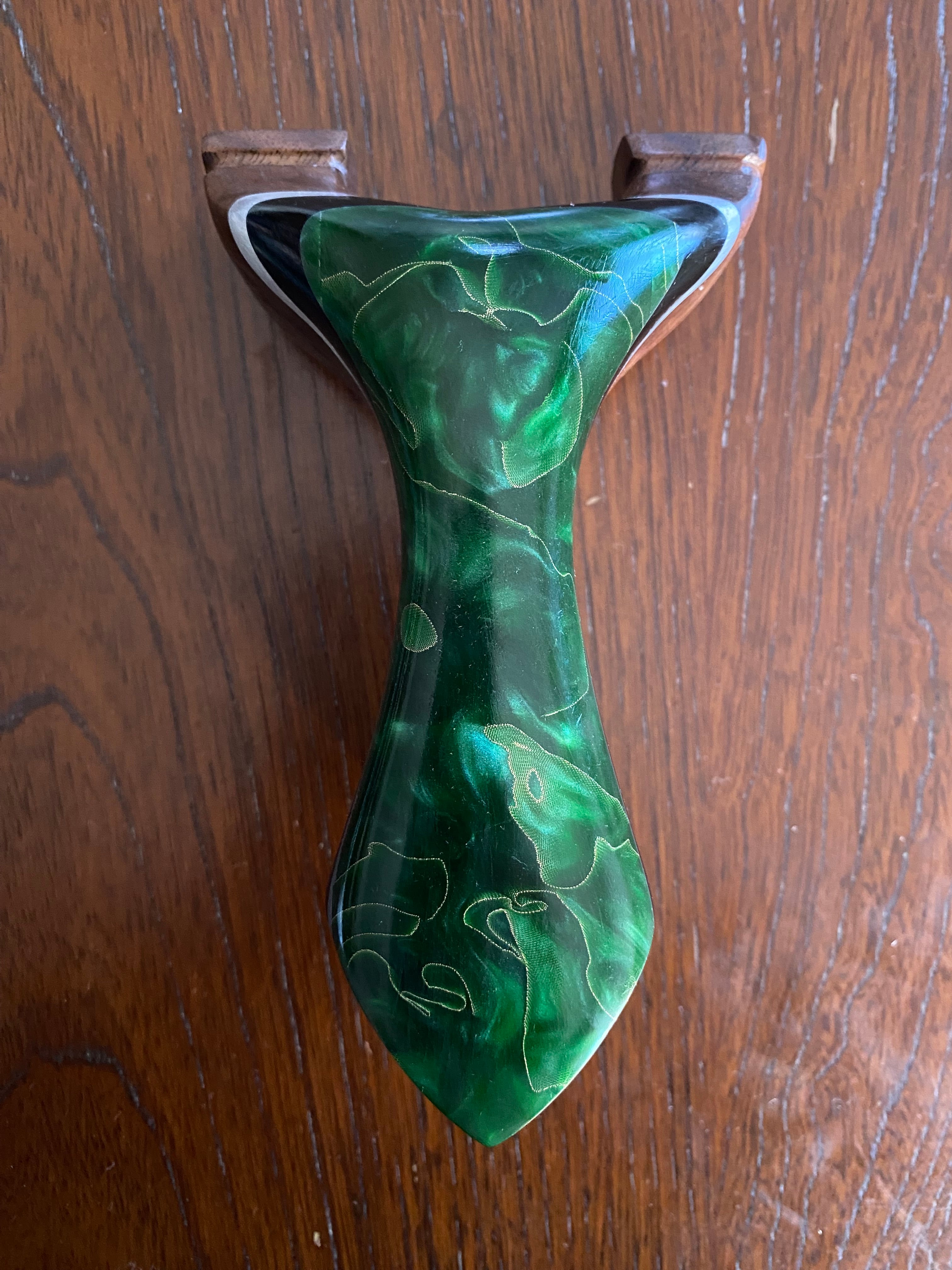 ■ No.898 New Wave Unknown Style Special(複合樹脂緑+アクリル黒+アルミ+ウォールナット) は、New Waveシリーズの中で特に庵野吽流を取り入れたスッキリとしたデザインが特徴のスリングショットです。ウォールナットという硬い木材の上にアルミニウム板をコアとし、黒のアクリル板を挟み緑色の複合樹脂というナイフハンドル材を表面に贅沢に取り付けた特別仕様のスリングショットです。少し胸を張ったイメージを表現し、厚みのあるハンドルエンドが大きな安定感をもたらします。見るからに贅沢で軽やかでありながらも凛とした安定感を持つ最新型の特別仕様のスリングショットが完成しました。