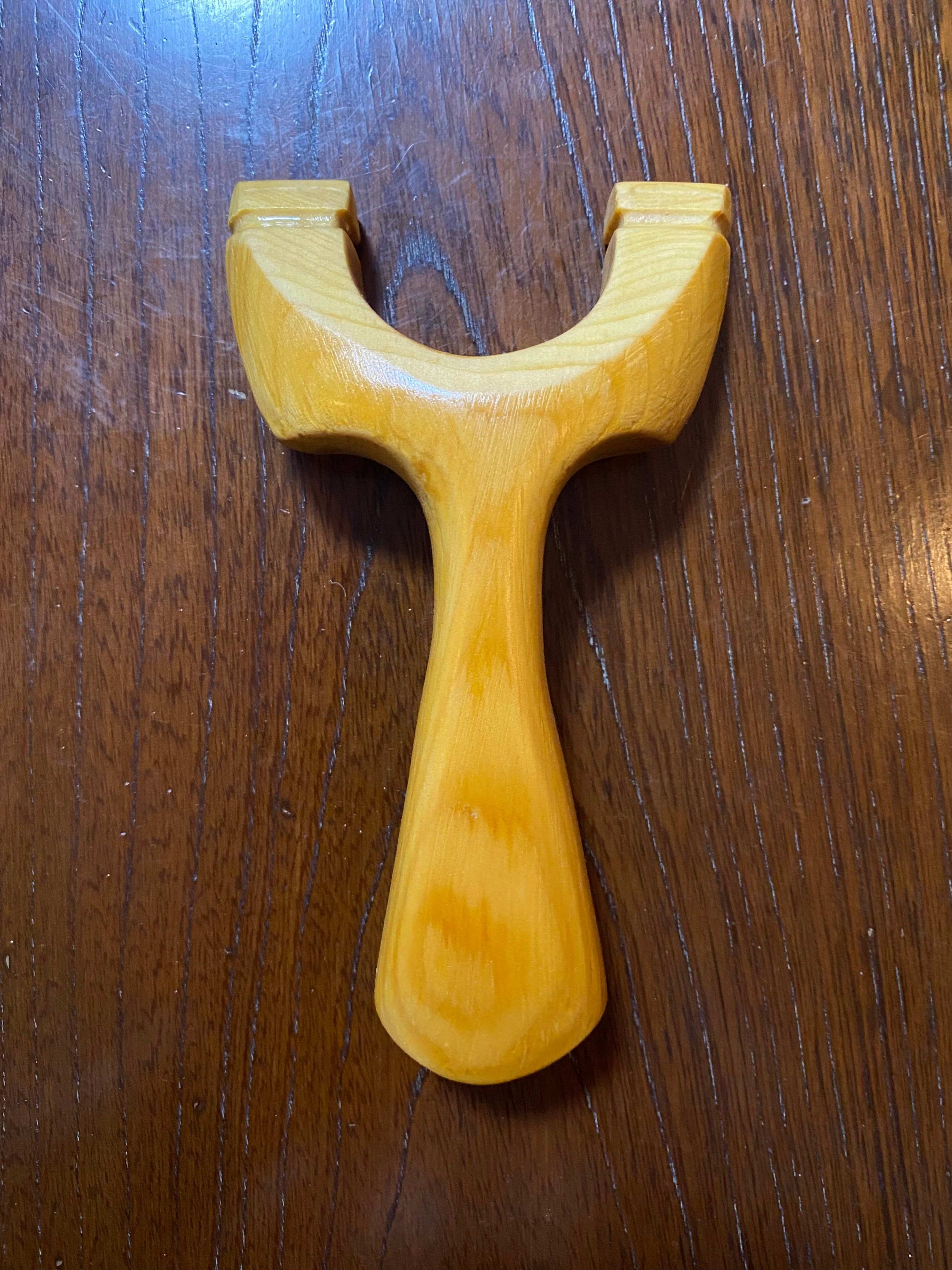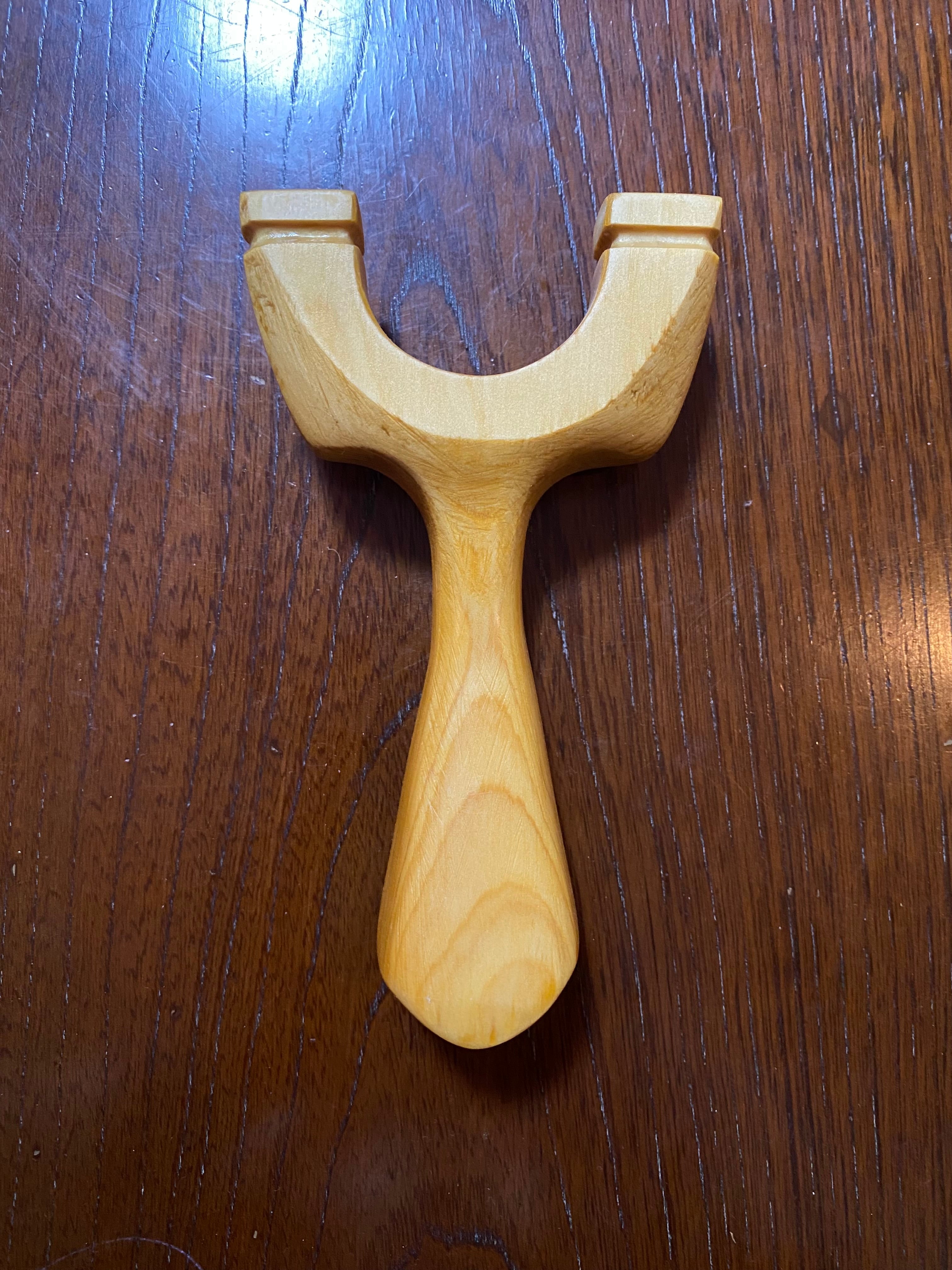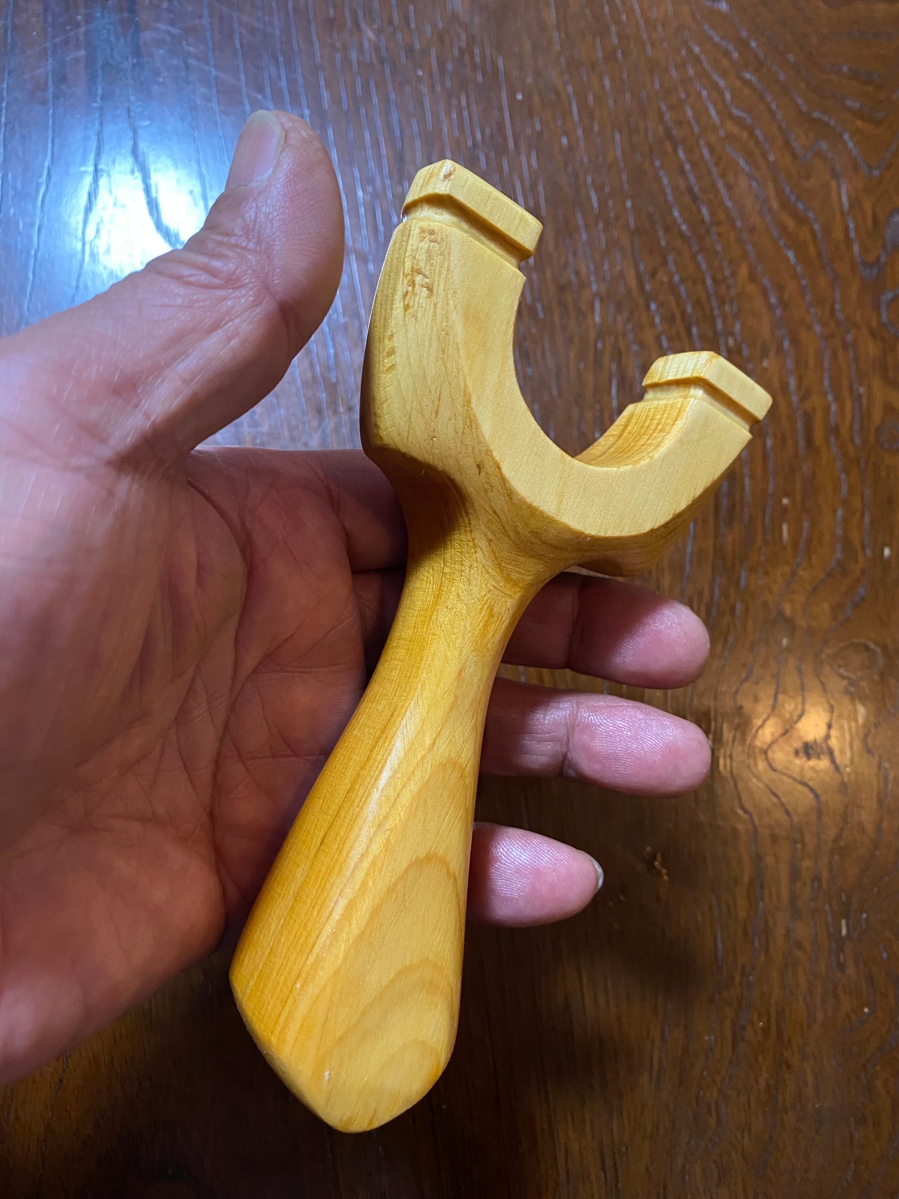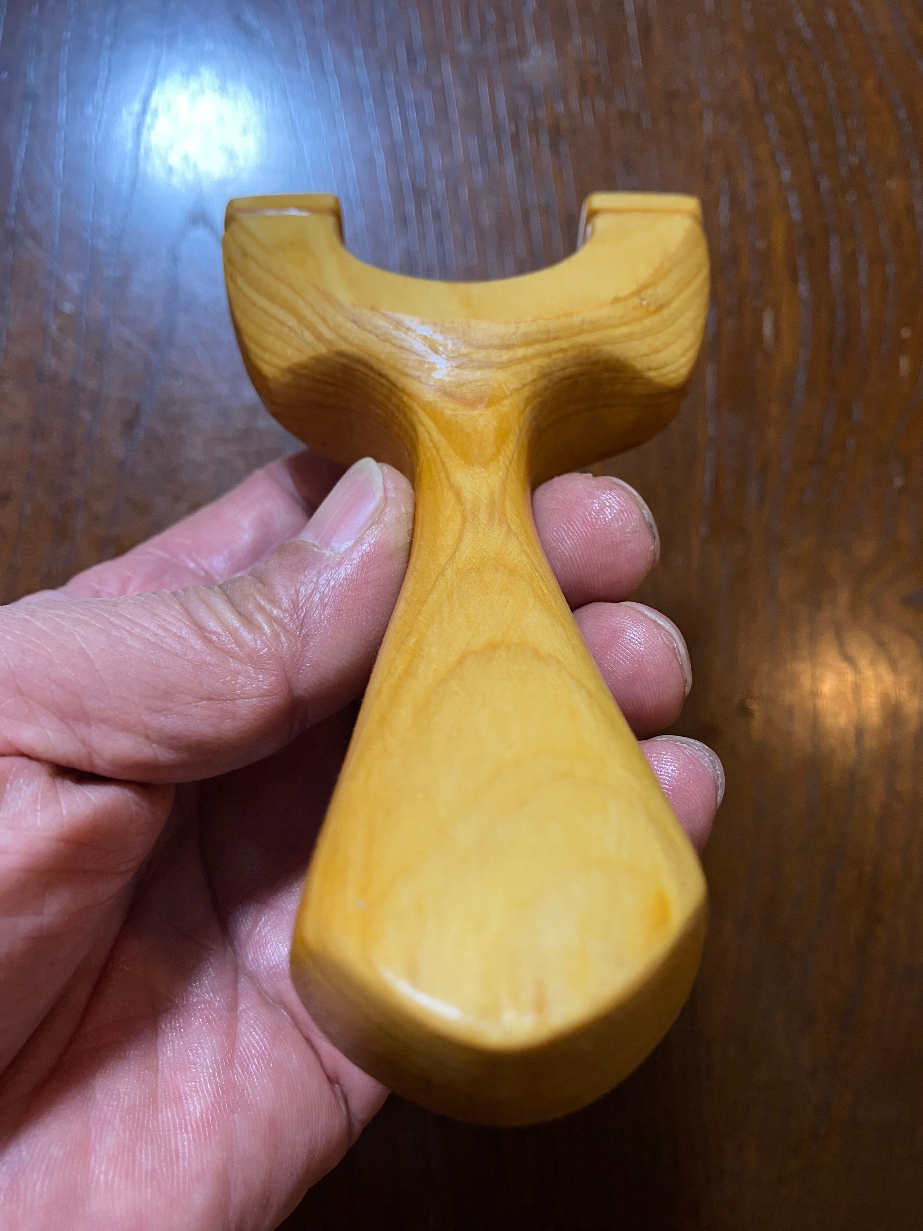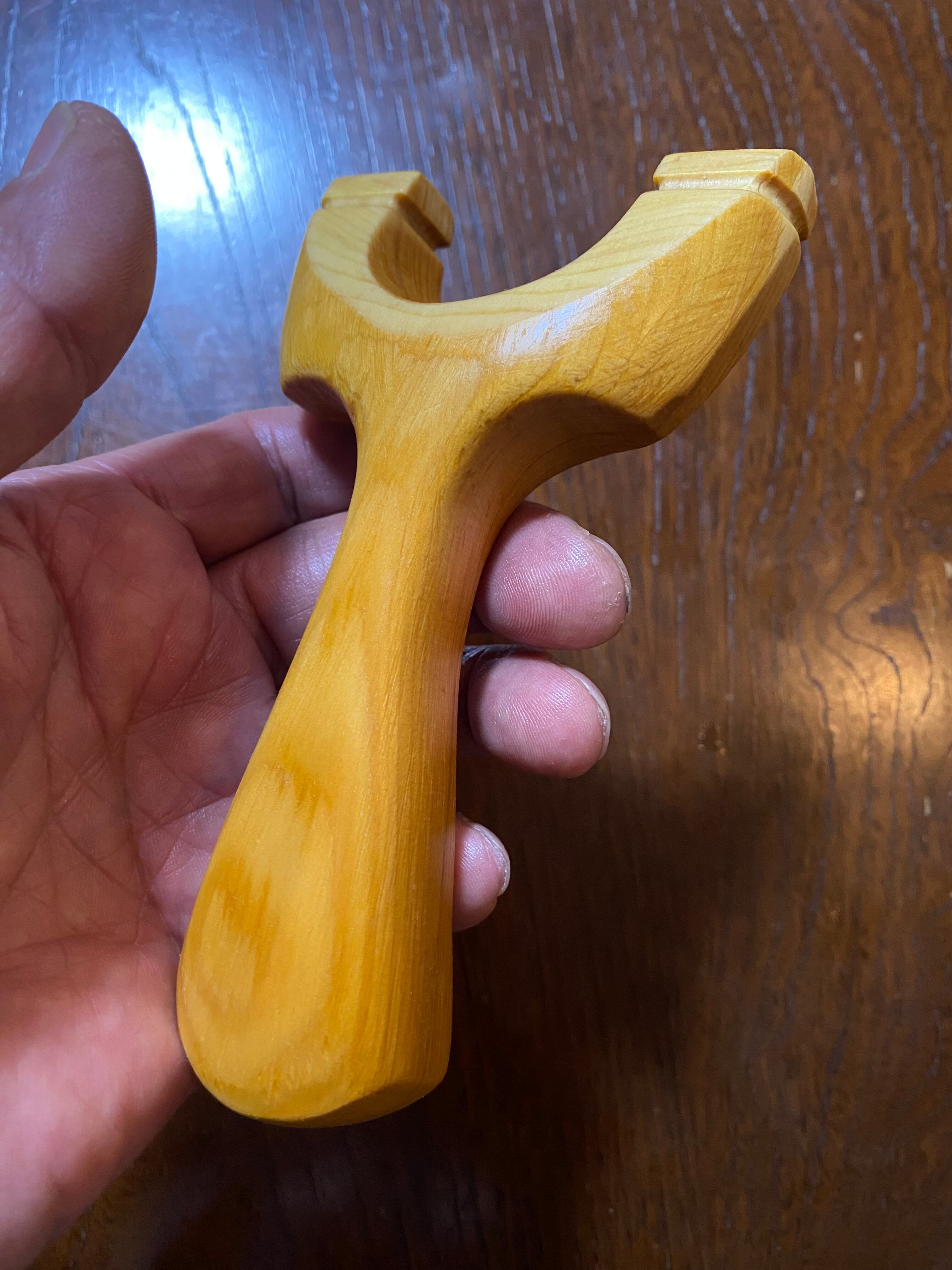 このスリングショットの特筆すべき点は、脇の奥まで指が入る独自のハンドルデザインです。これにより、しっかりとしたグリップ感が得られ、安定した射撃が可能になります。ハンドルは少し長めなので小指も安定に貢献できます。仕上げには、細かい#1500の研磨と亜麻仁油+蜜蝋を合わせた天然素材を用いており、心地よい手触りが特徴です。見た目だけでなく、持つ楽しさも実感できる一品です。