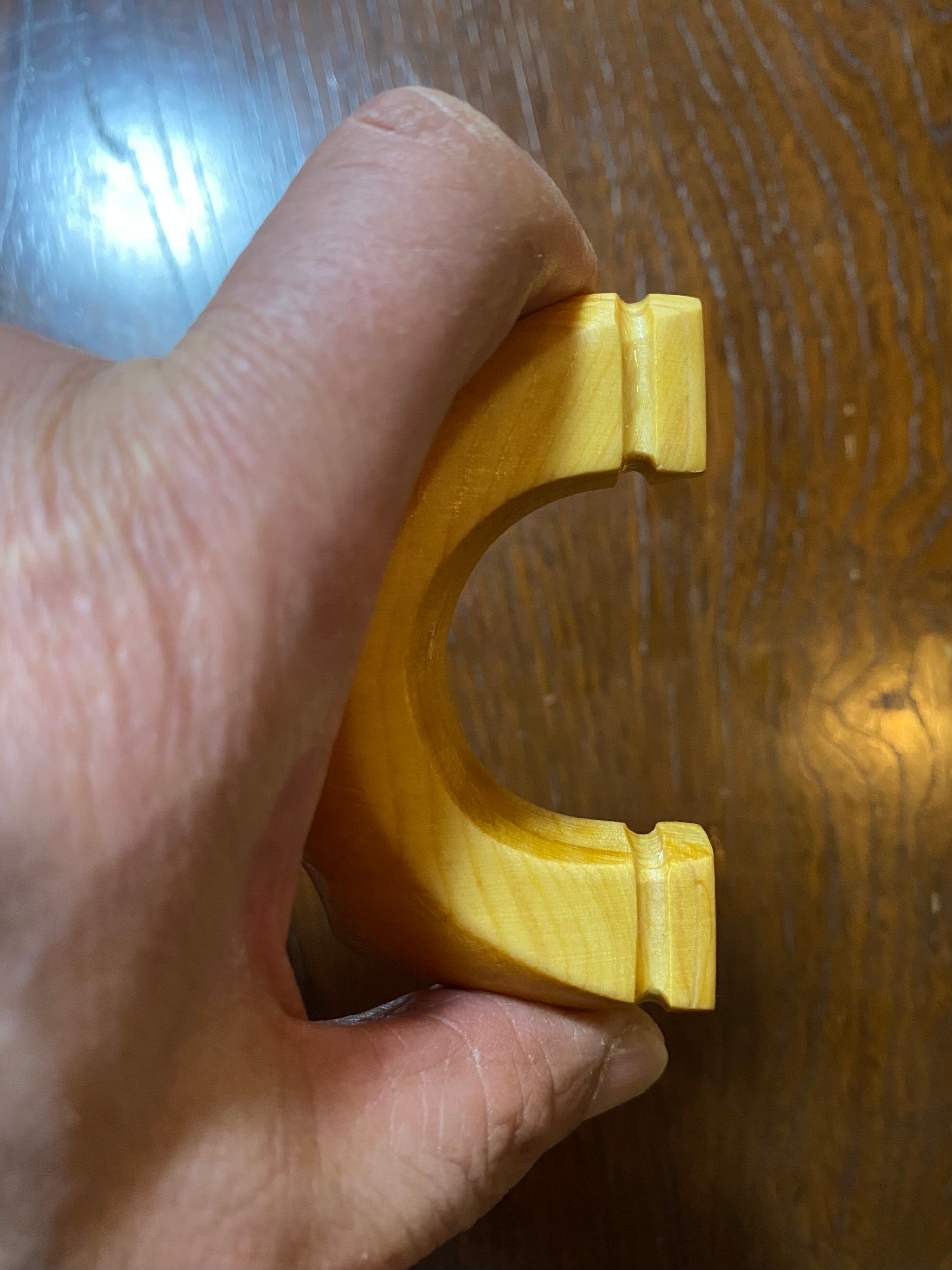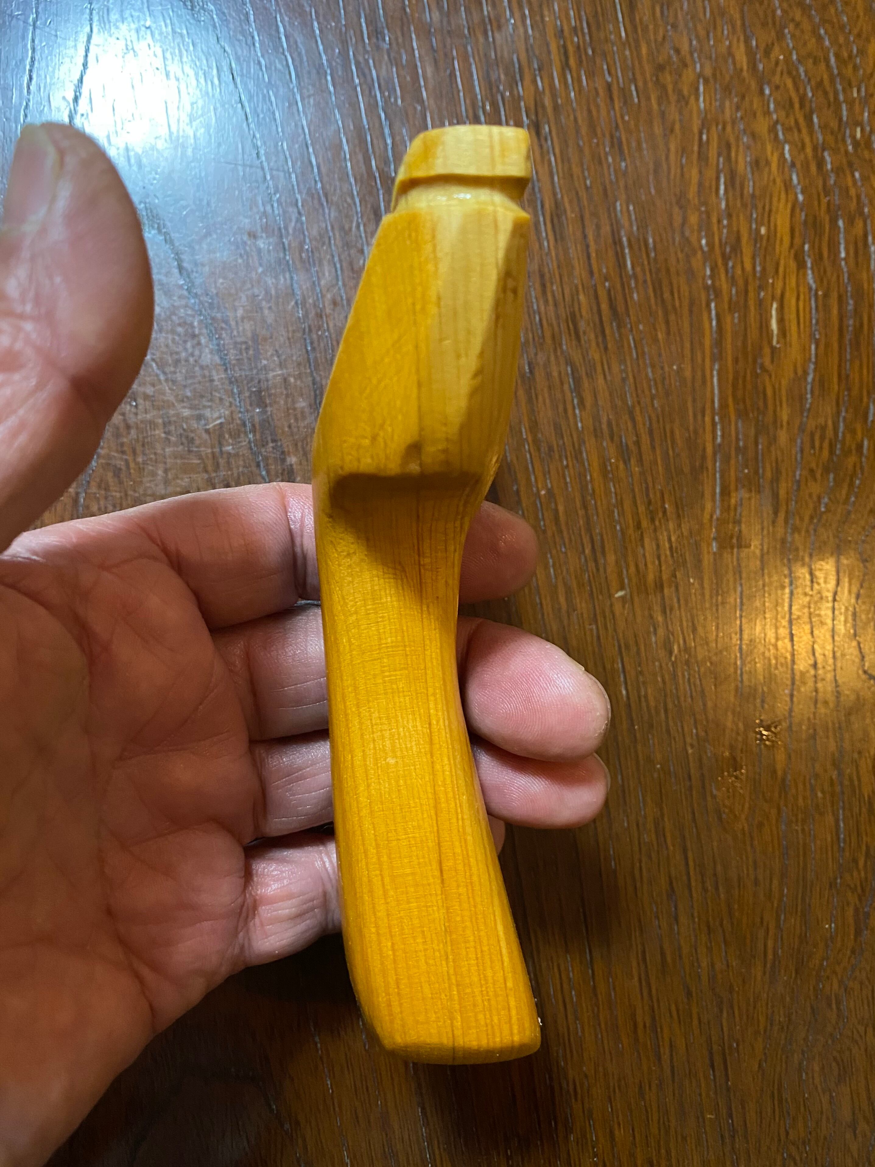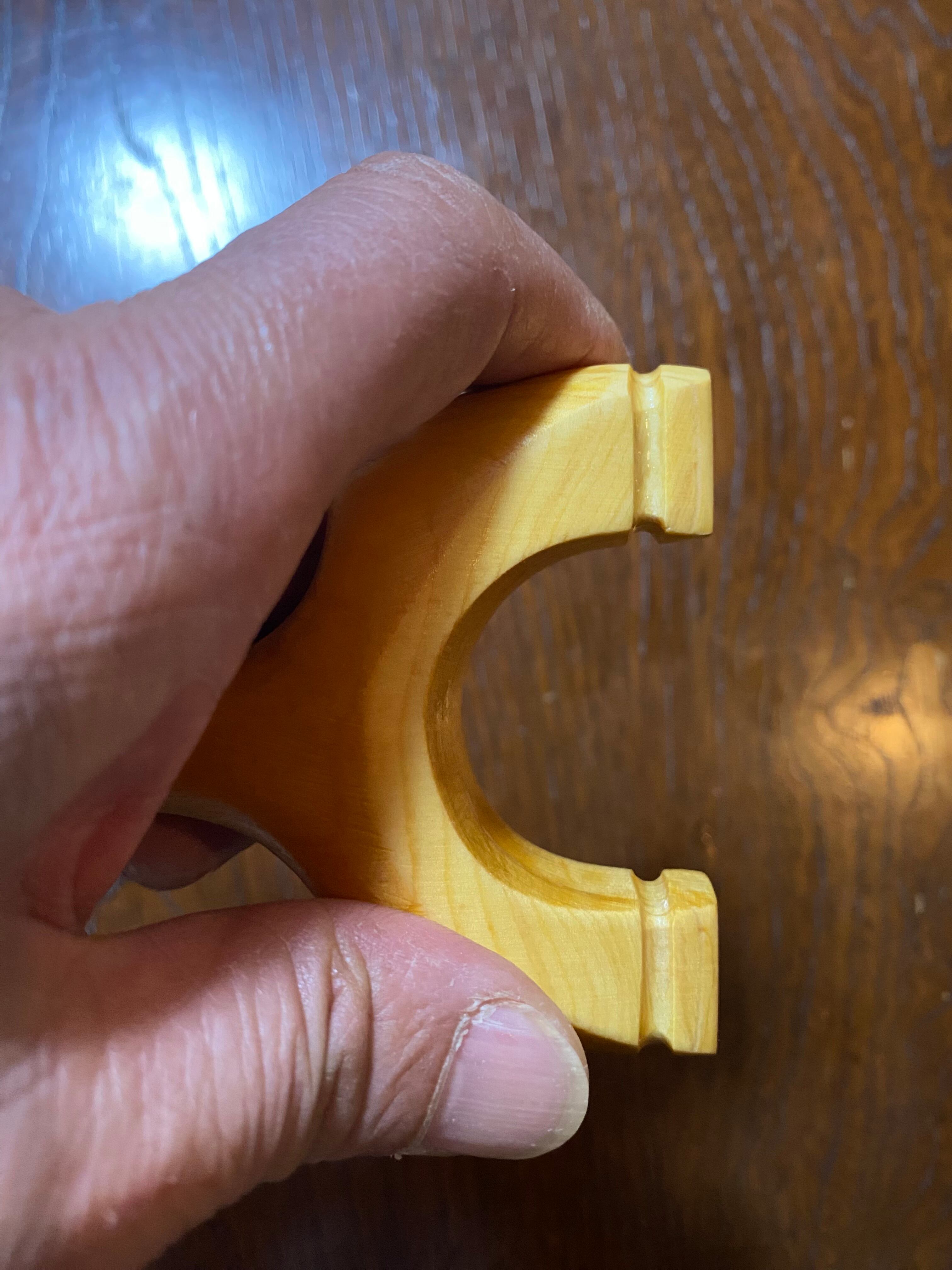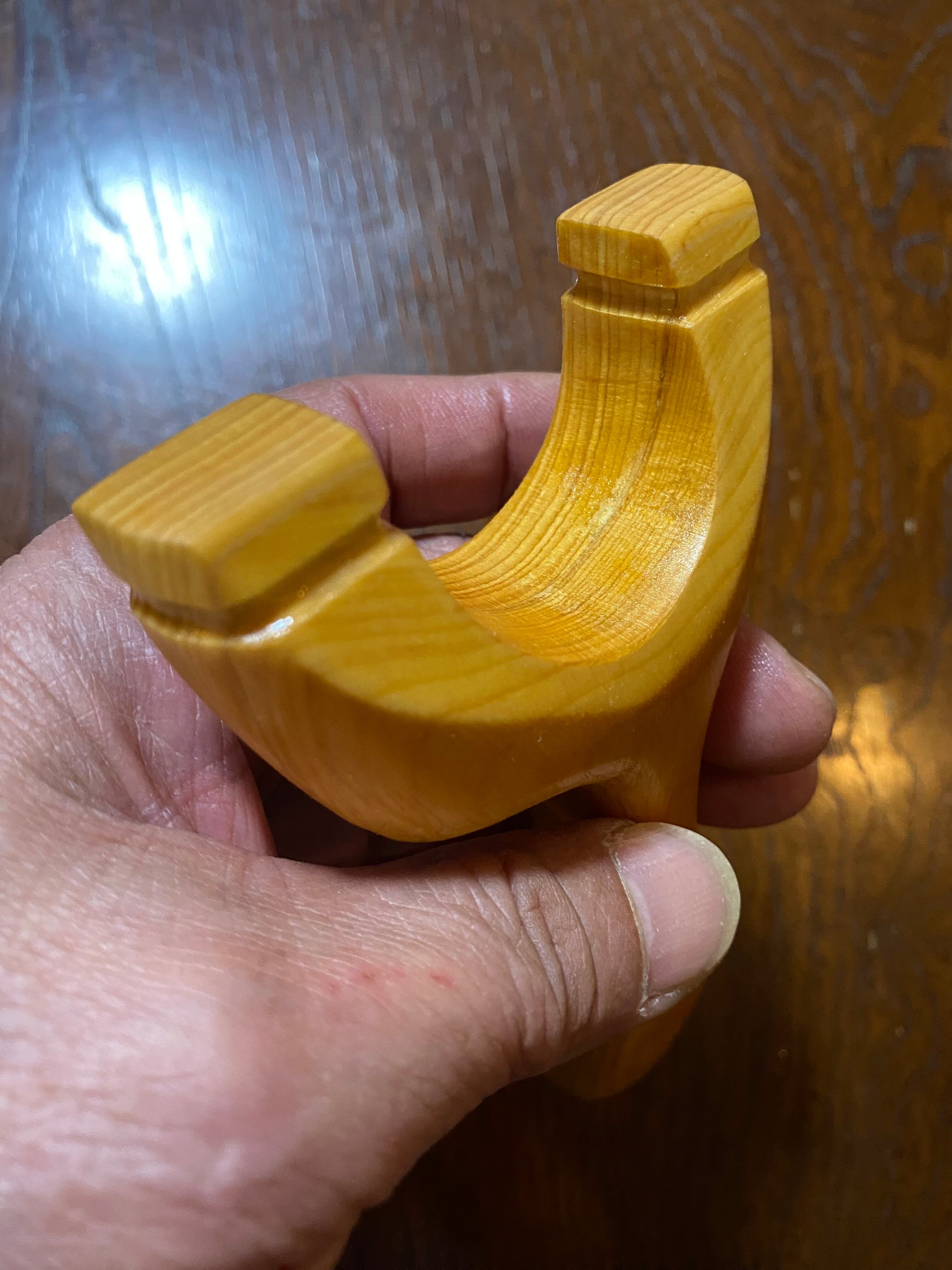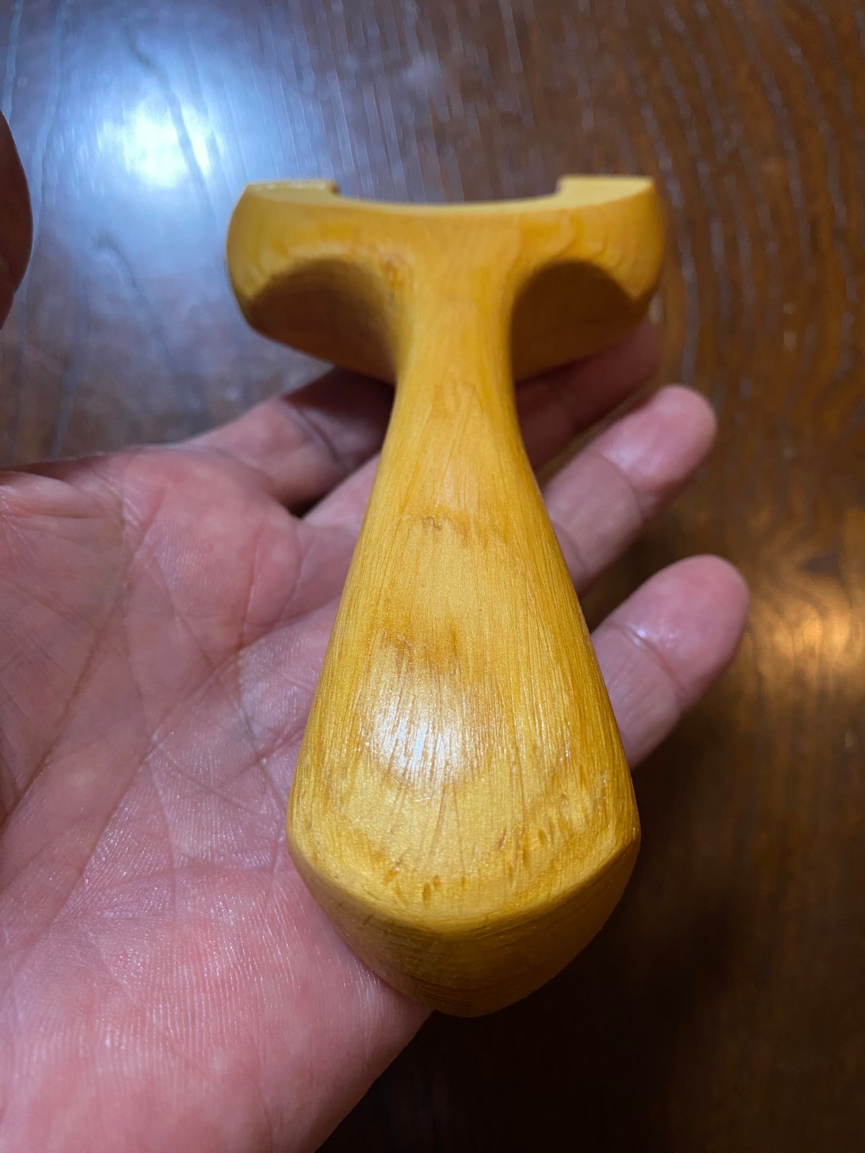 このスリングショットの特筆すべき点は、脇の奥まで指が入る独自のハンドルデザインです。これにより、しっかりとしたグリップ感が得られ、安定した射撃が可能になります。ハンドルは少し長めなので小指も安定に貢献できます。仕上げには、細かい#1500の研磨と亜麻仁油+蜜蝋を合わせた天然素材を用いており、心地よい手触りが特徴です。見た目だけでなく、持つ楽しさも実感できる一品です。