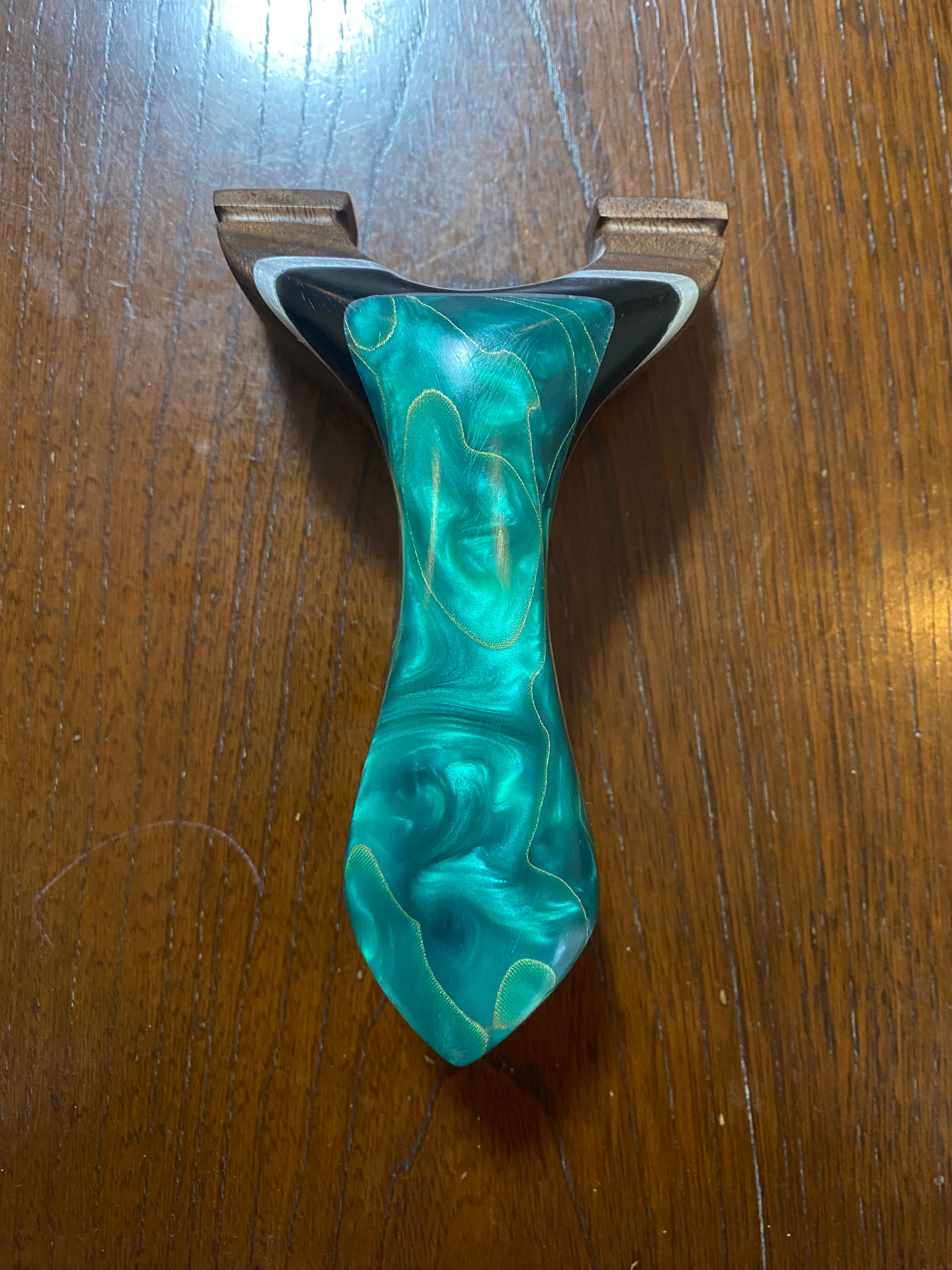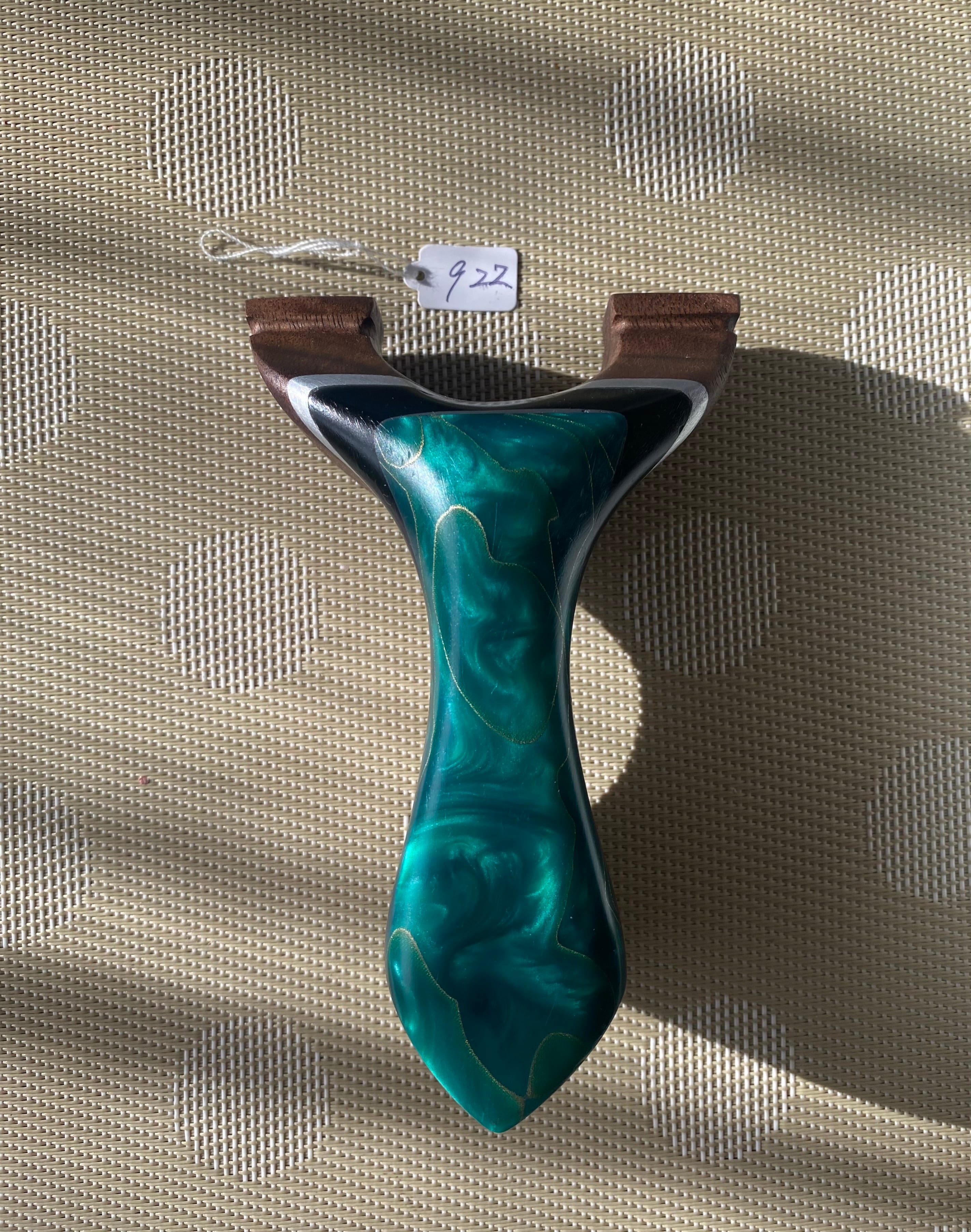 ■ No.922 New Wave Unknown Style Special(複合樹脂緑+アクリル黒+アルミ+ウォールナット) は、New Waveシリーズの中で特に庵野吽流を取り入れたスッキリとしたデザインが特徴のスリングショットです。ウォールナットという硬い木材の上にアルミニウム板をコアとし、黒のアクリル板を挟み緑色の複合樹脂というナイフハンドル材を表面に贅沢に取り付けた特別仕様のスリングショットです。少し胸を張ったイメージを表現し、厚みのあるハンドルエンドが大きな安定感をもたらします。見るからに贅沢で軽やかでありながらも凛とした安定感を持つ最新型の特別仕様のスリングショットが完成しました。