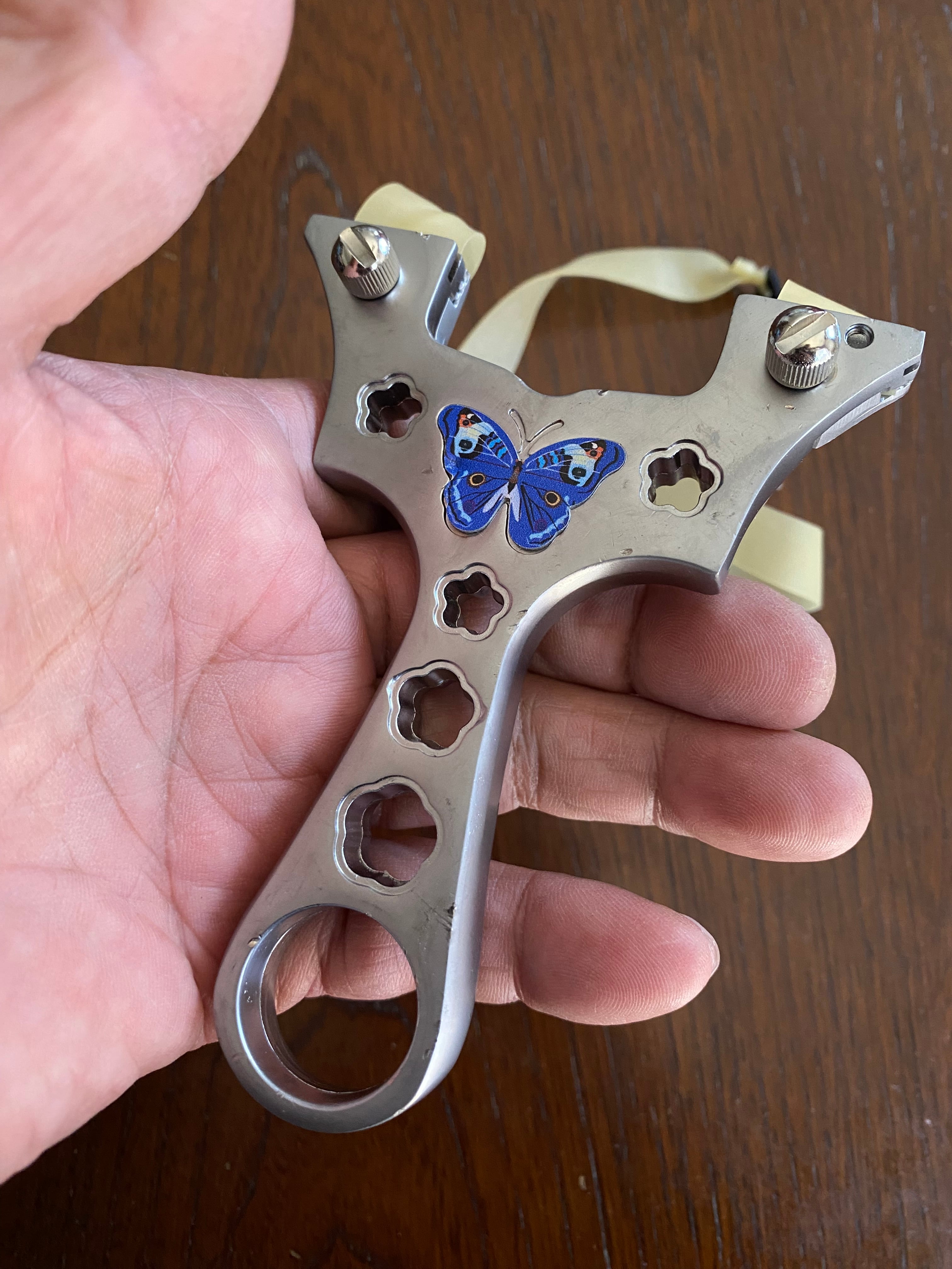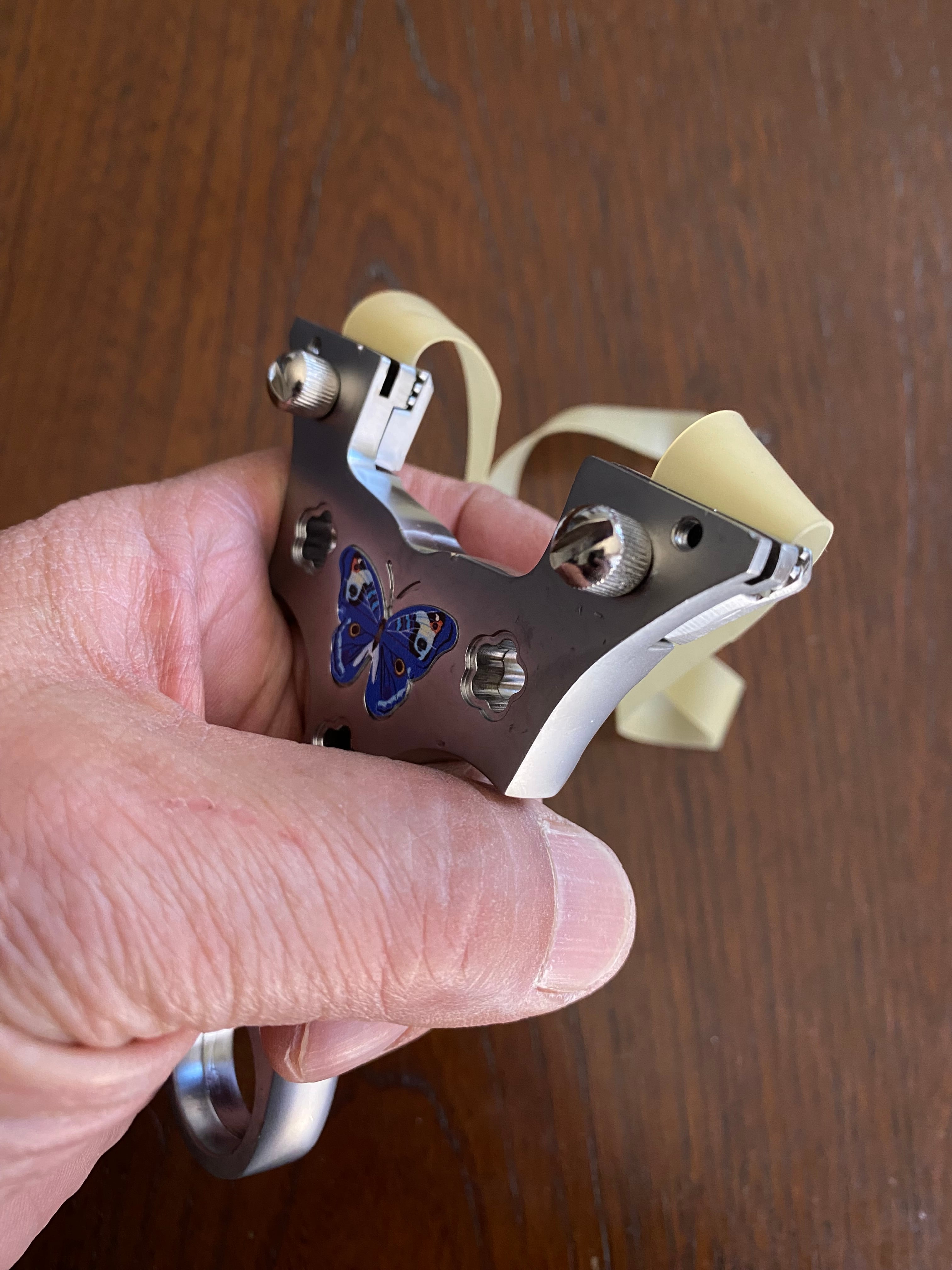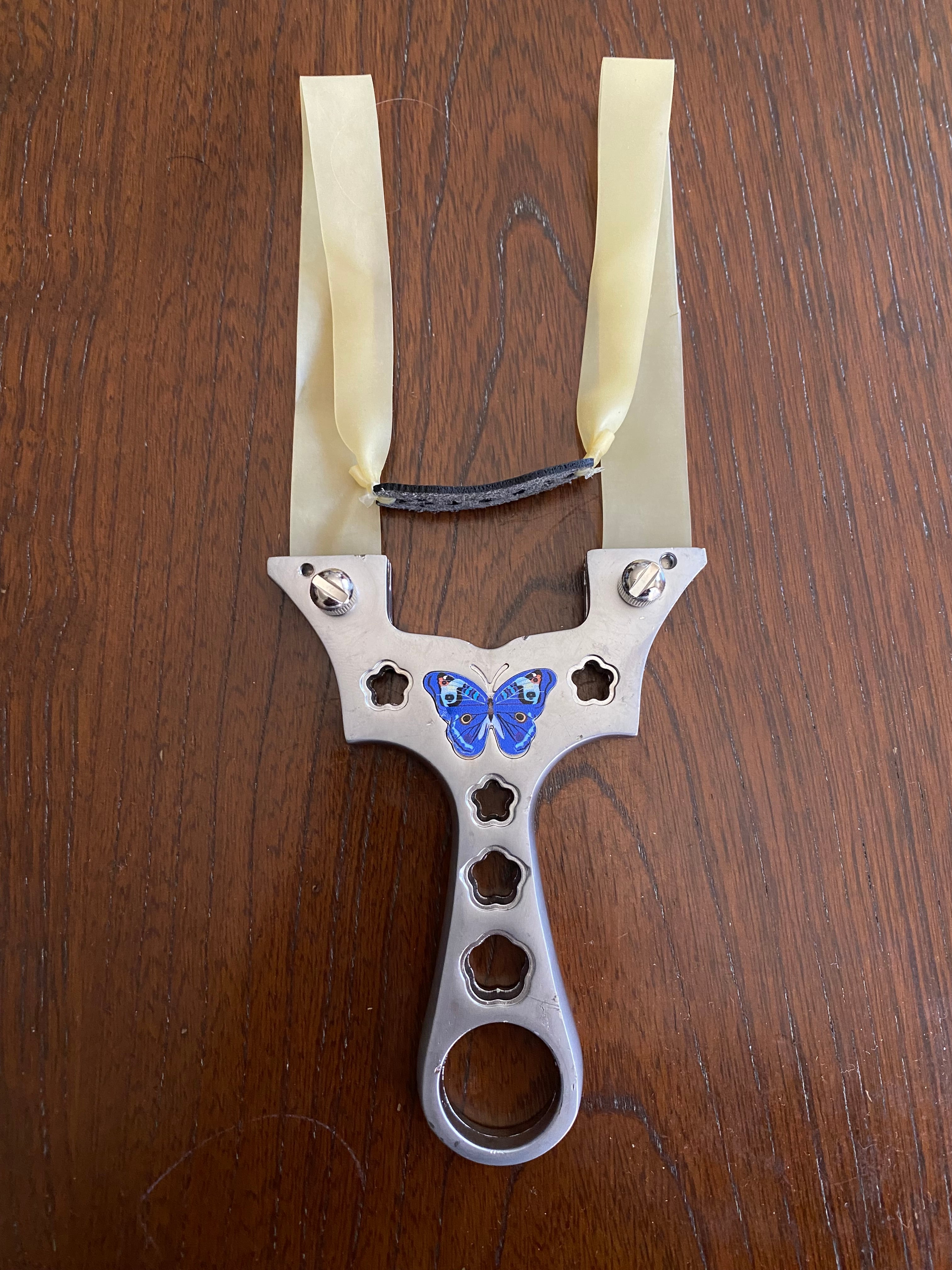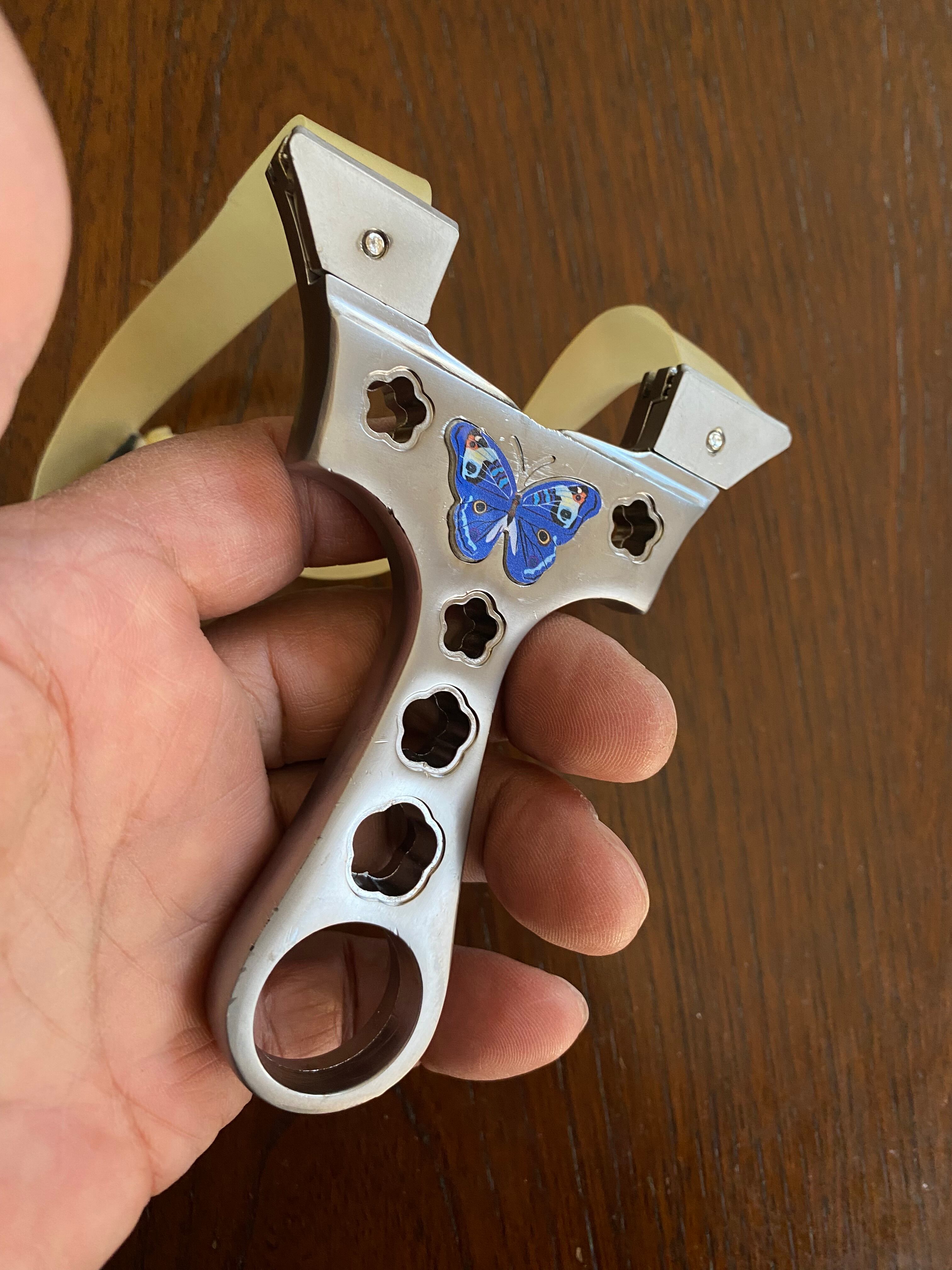 ■ No._25 可愛いデザインの入門用スリングショットは、初心者の方でも安心して楽しむことができるスリングショットです。蝶々や花をモチーフにした可愛らしいデザインが特徴で、シューティングの楽しさを引き立てます。海外から輸入した物なので、細かな傷が複数見受けられます。射撃にはまったく支障はありませんが、そのために価格を低く設定しました。あくまで練習用と割り切ってノークレームノーリターンでお願いします。