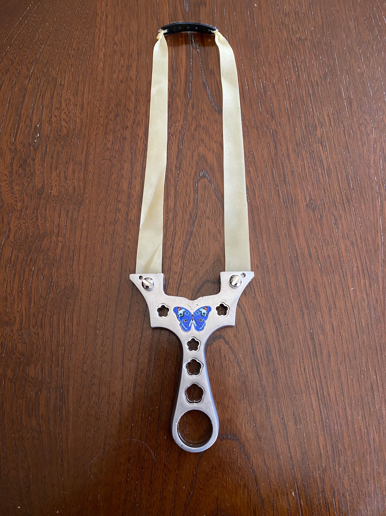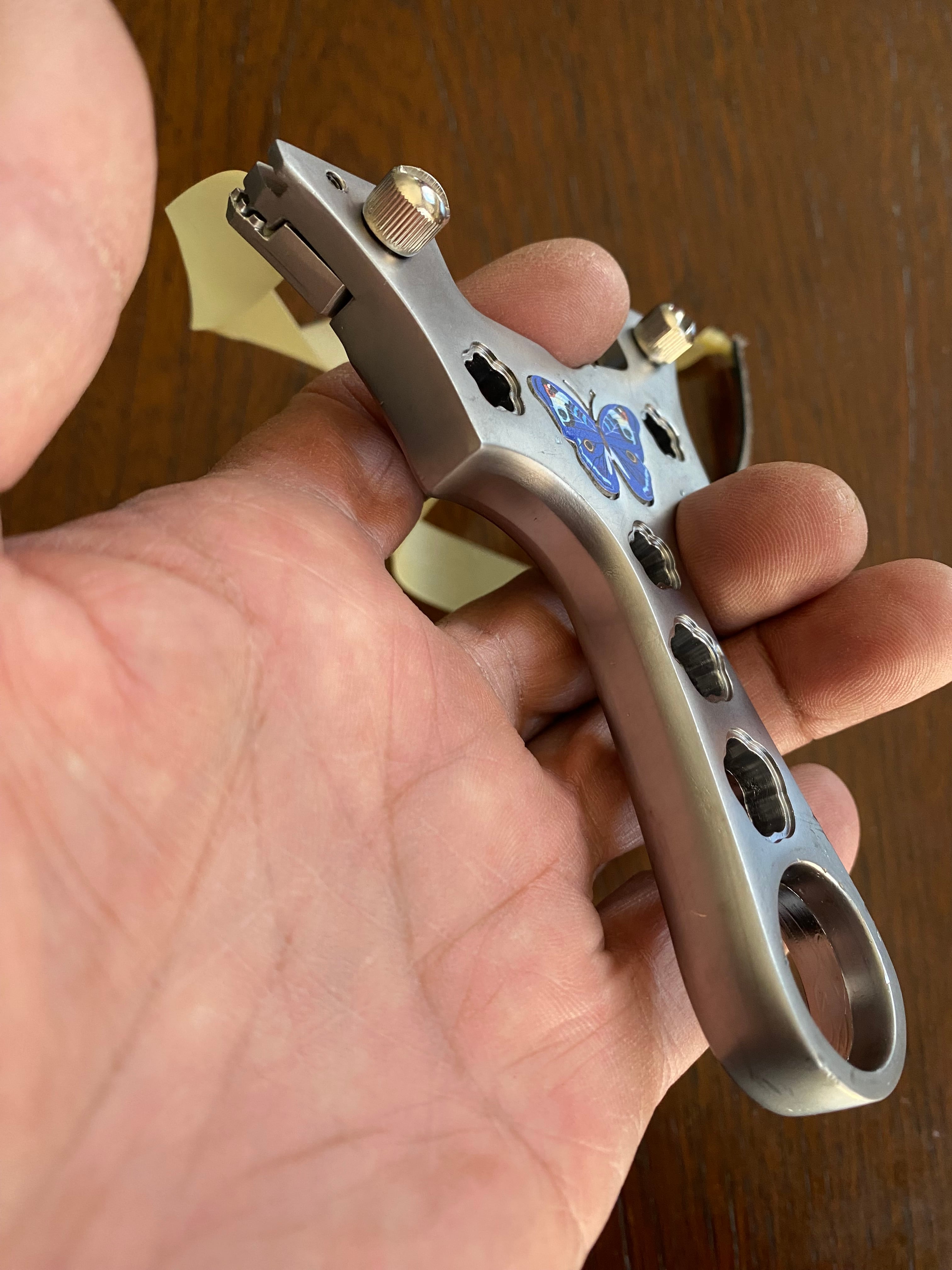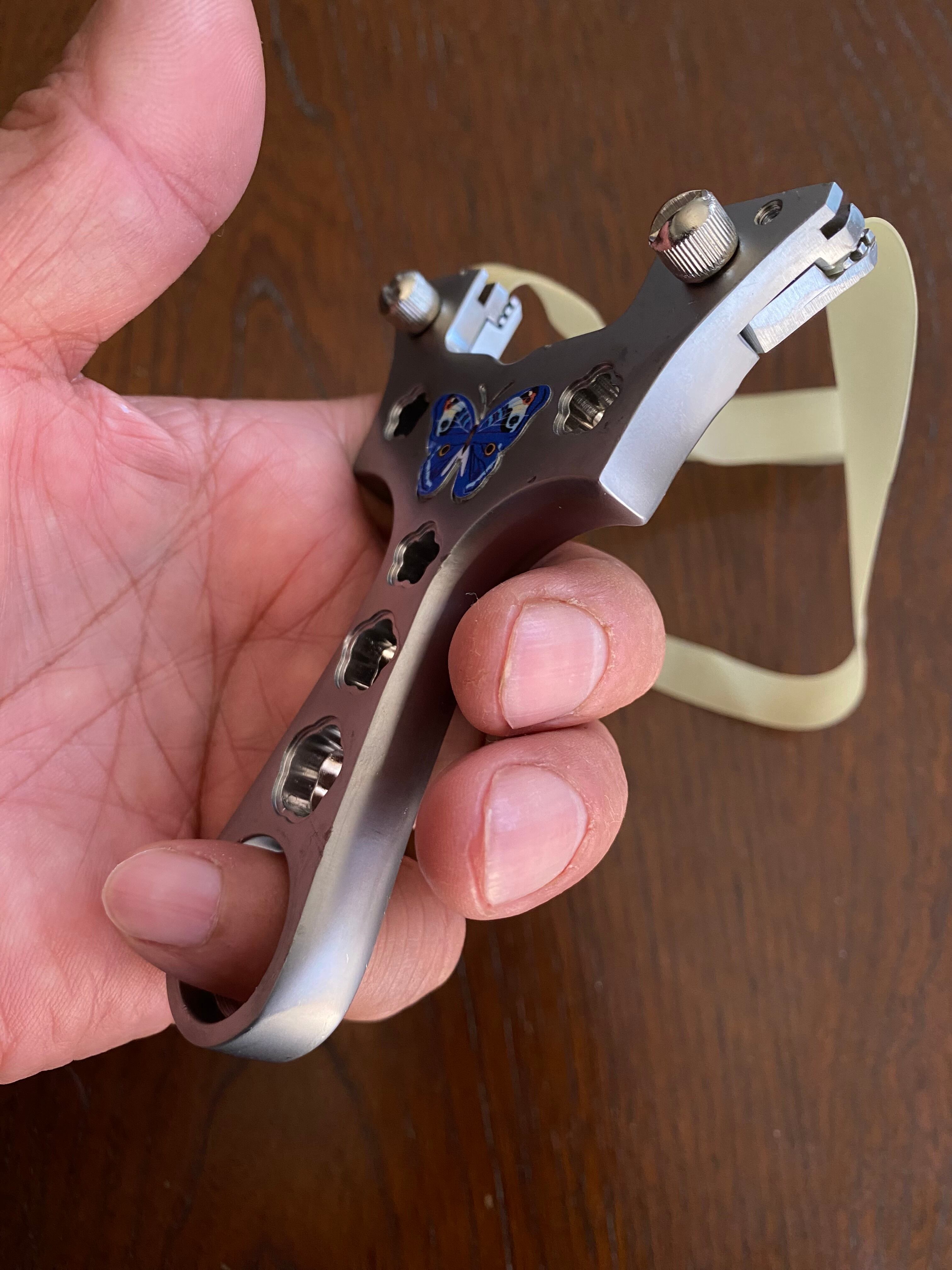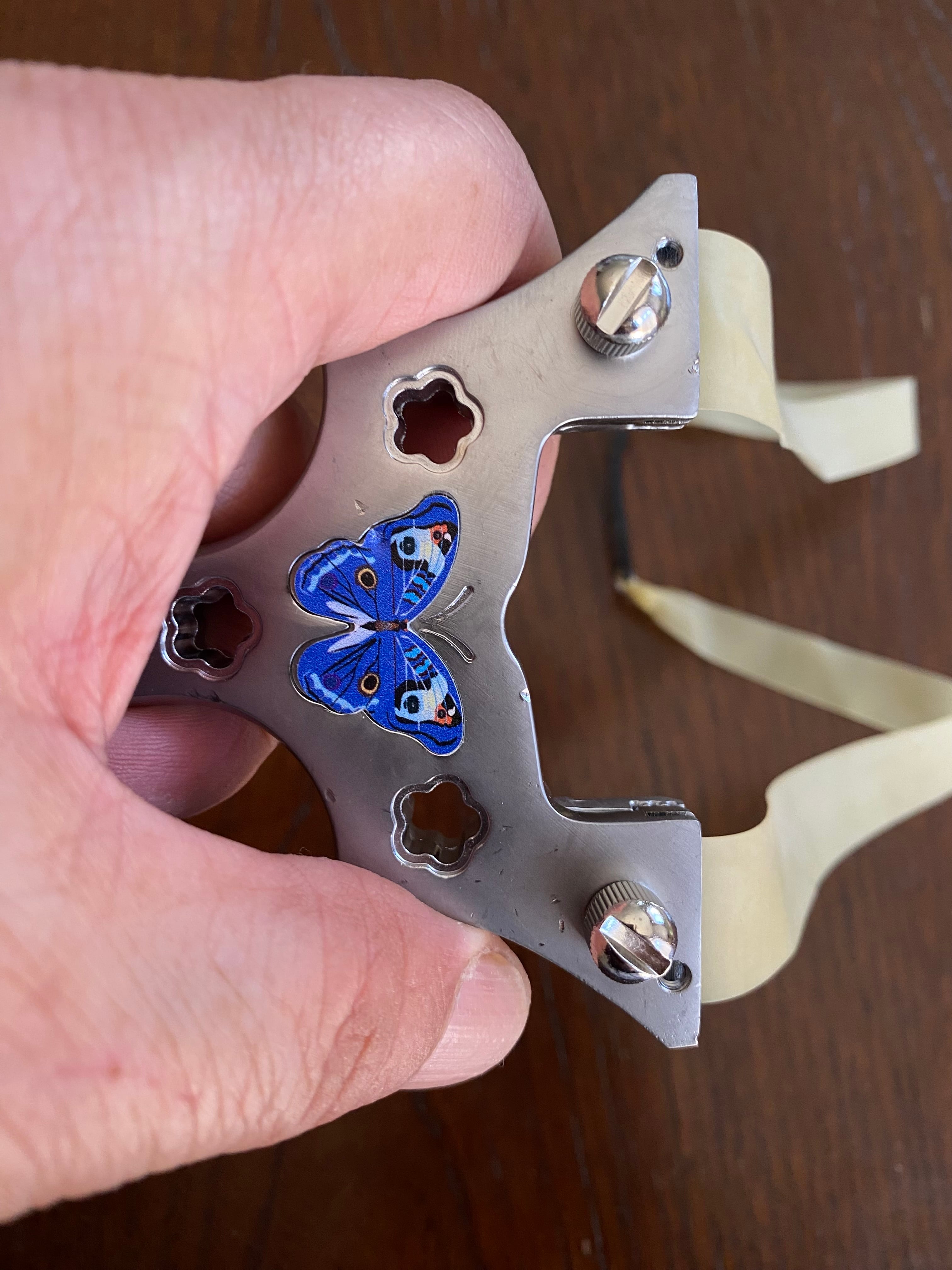 ■ No._25 可愛いデザインの入門用スリングショットは、初心者の方でも安心して楽しむことができるスリングショットです。蝶々や花をモチーフにした可愛らしいデザインが特徴で、シューティングの楽しさを引き立てます。海外から輸入した物なので、細かな傷が複数見受けられます。射撃にはまったく支障はありませんが、そのために価格を低く設定しました。あくまで練習用と割り切ってノークレームノーリターンでお願いします。