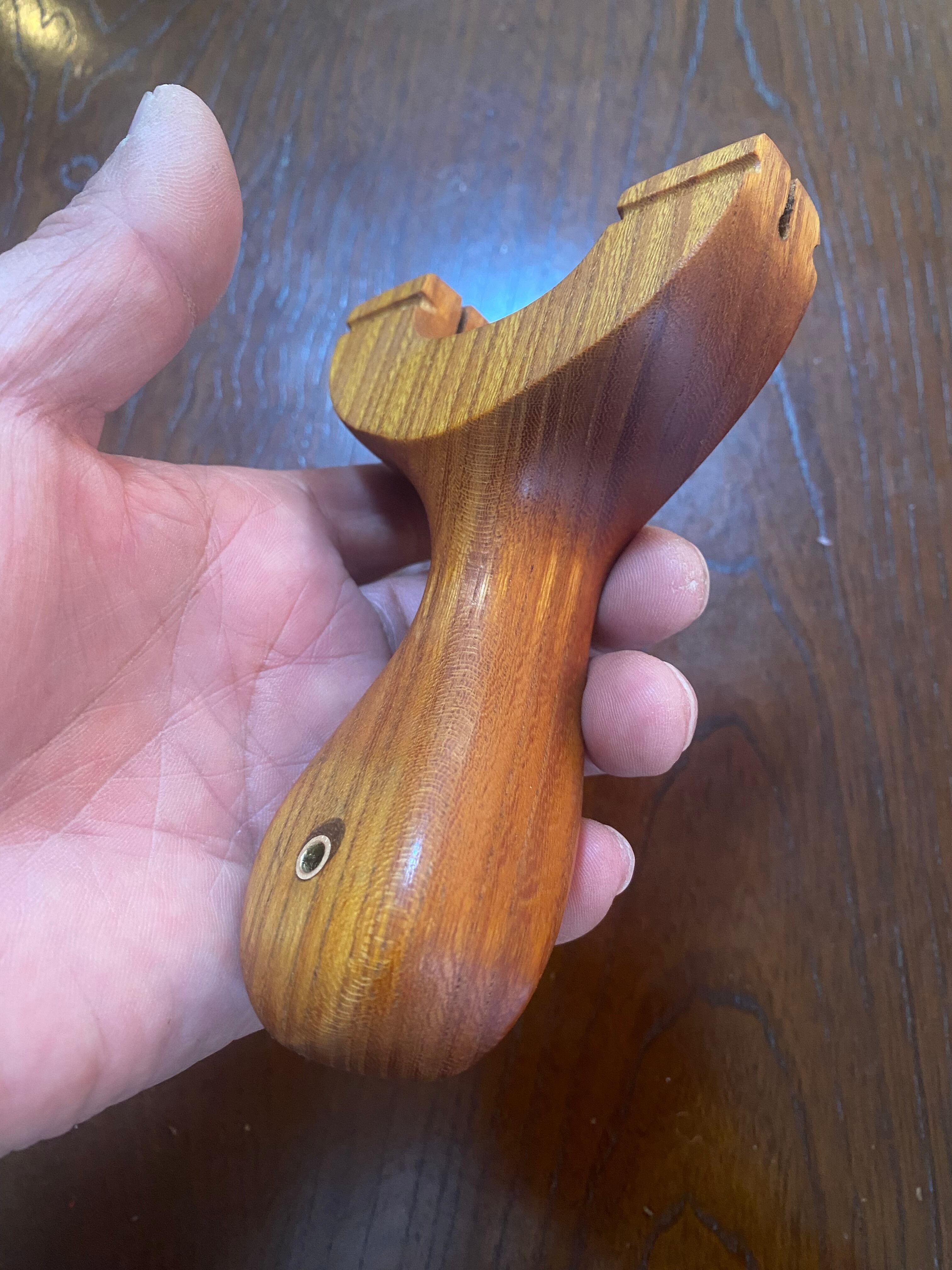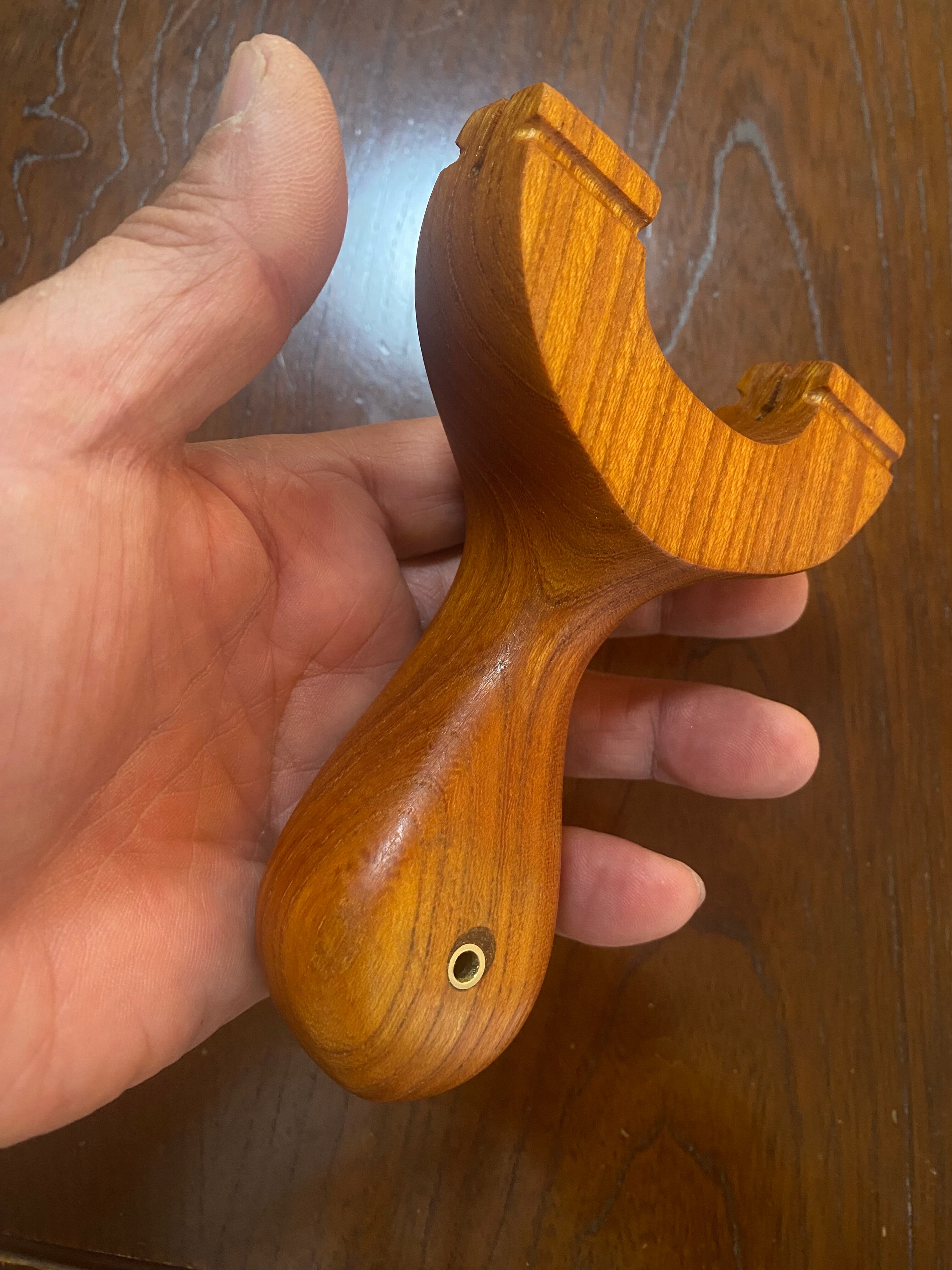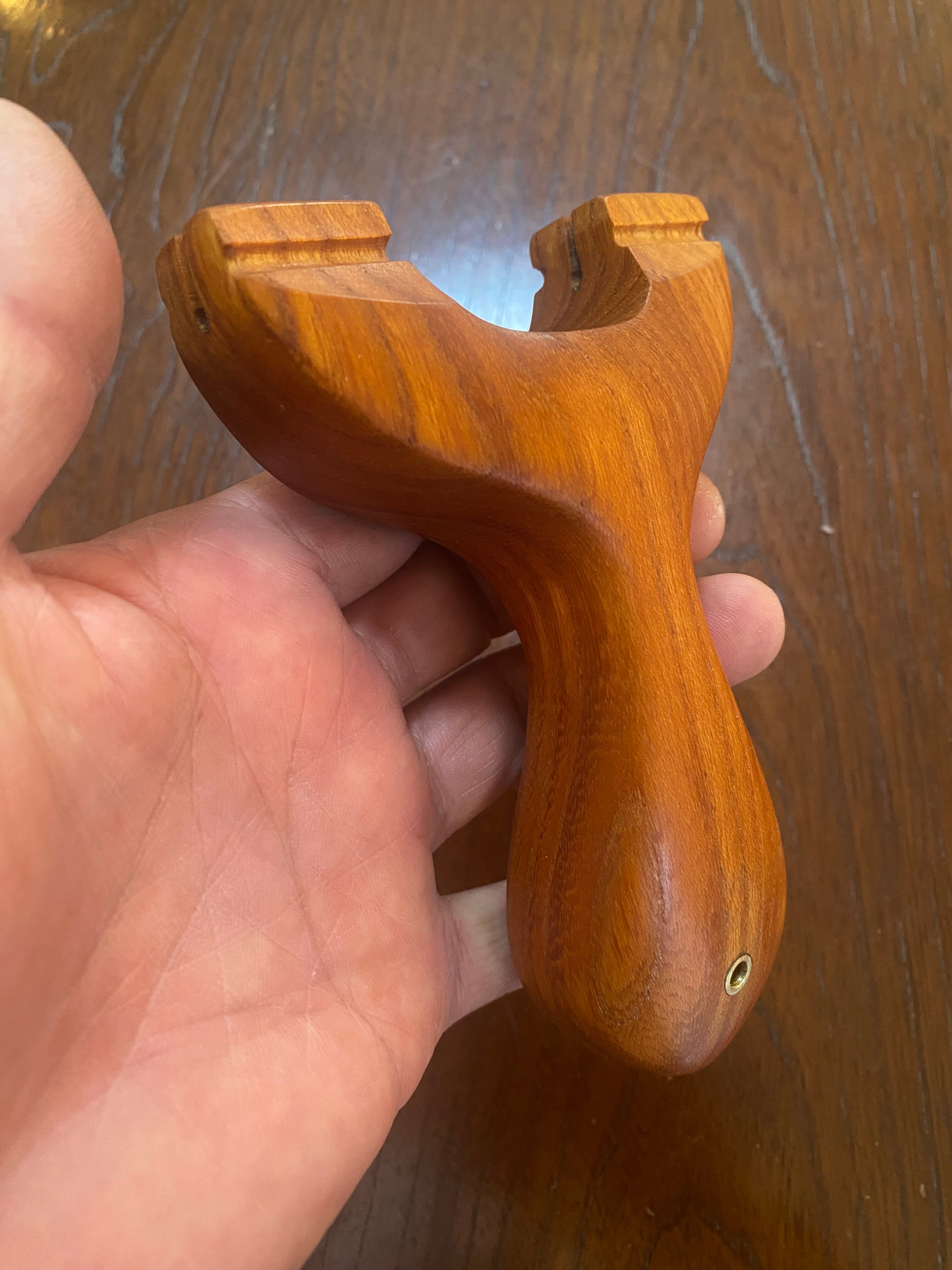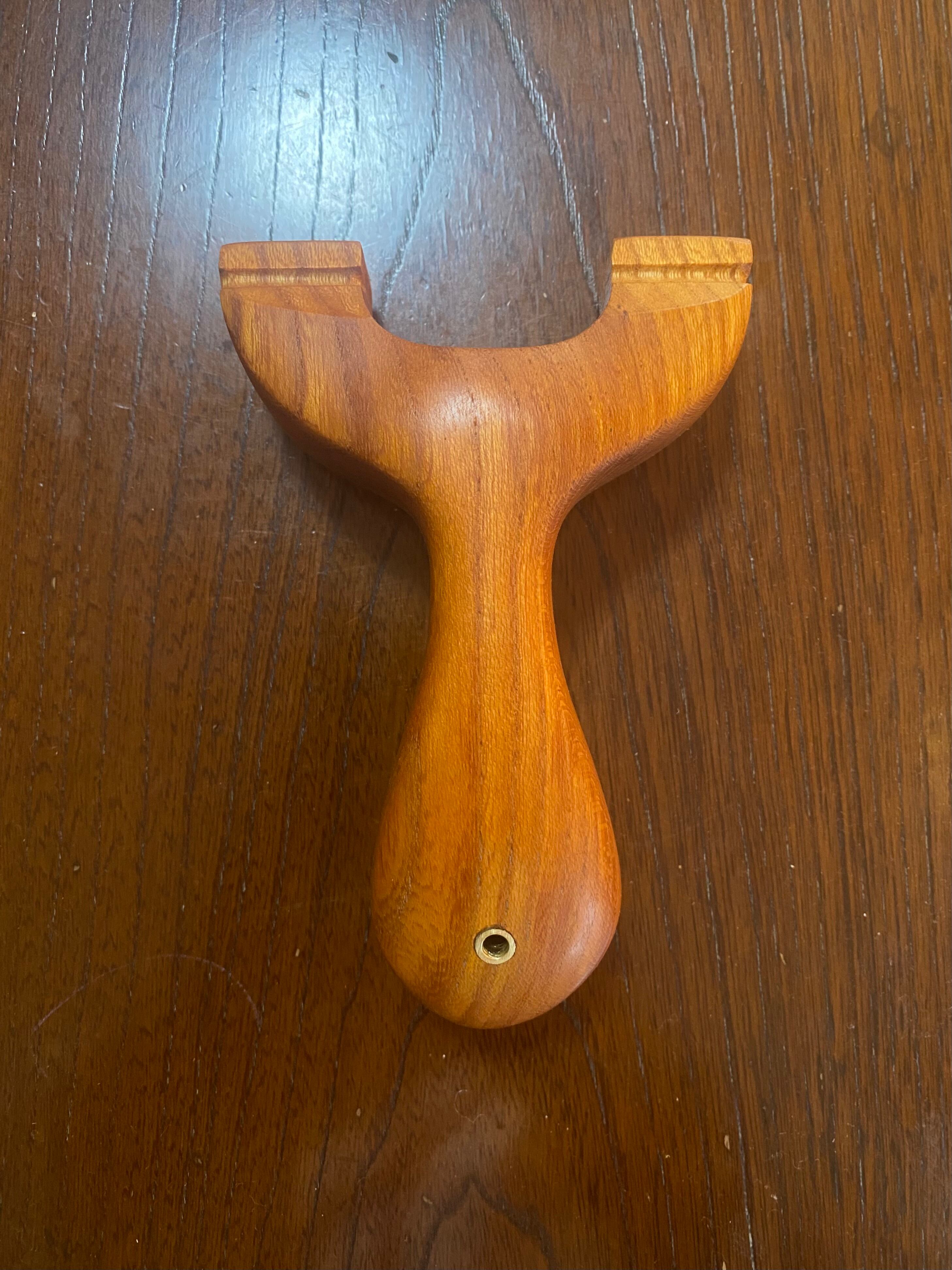 ■ No.933 Fatman(Top slot)Thong holeは、丸みを帯びたふっくらとしたデザインのスリングショットです。優しい握り心地を実現しており、安定感は抜群。丸いハンドルエンドが手のひらにしっかりとフィットし、長時間の使用でも疲れにくいよう設計されています。また、Top slotを備えているため、ゴムの装着も比較的簡単に行えます。美しい欅の木目が、見た目にも楽しさを加えています。ハンドルエンドには落下防止用の細い革紐を通すソング・ホールを備えています。