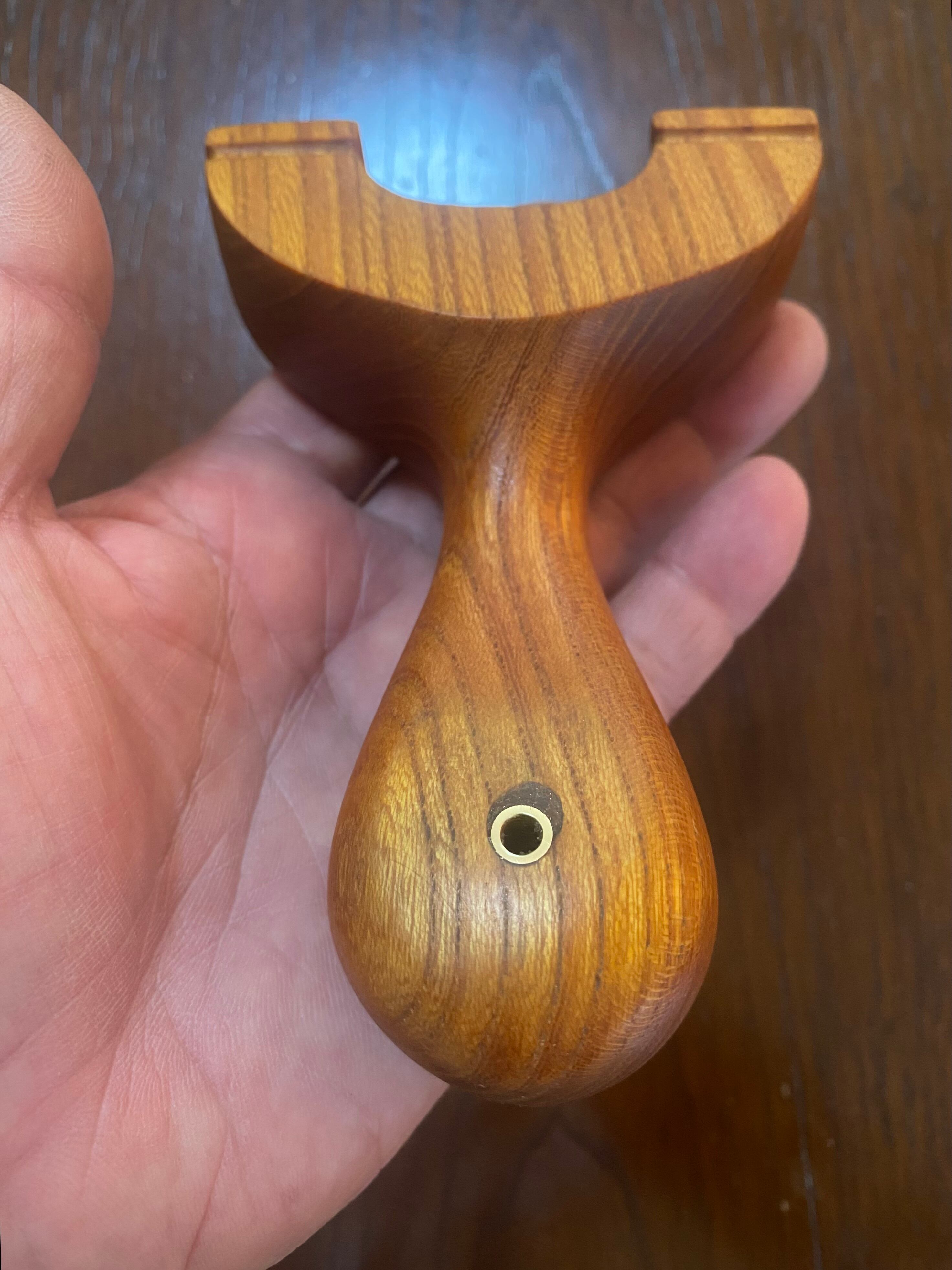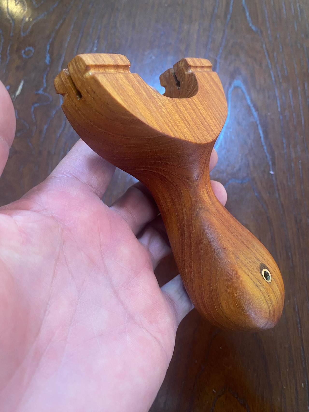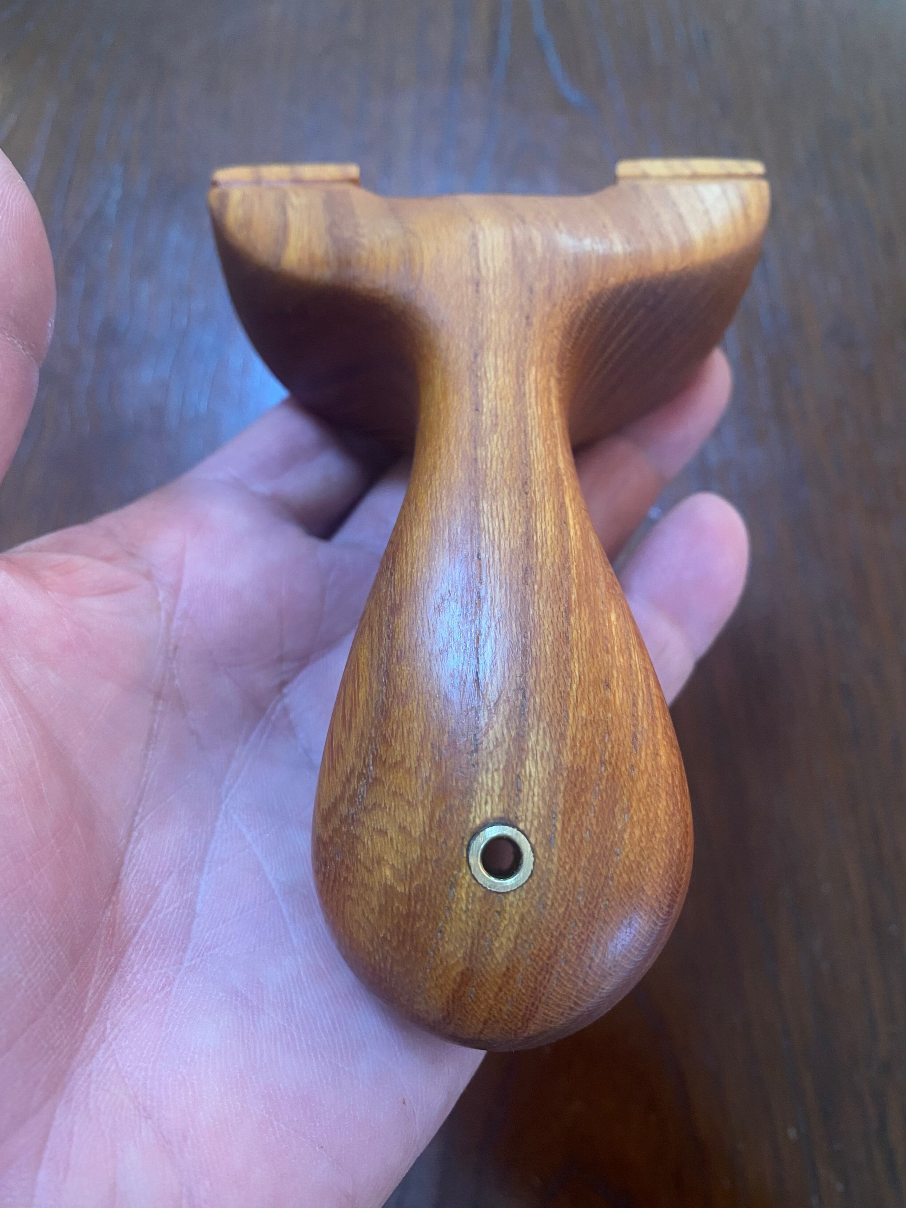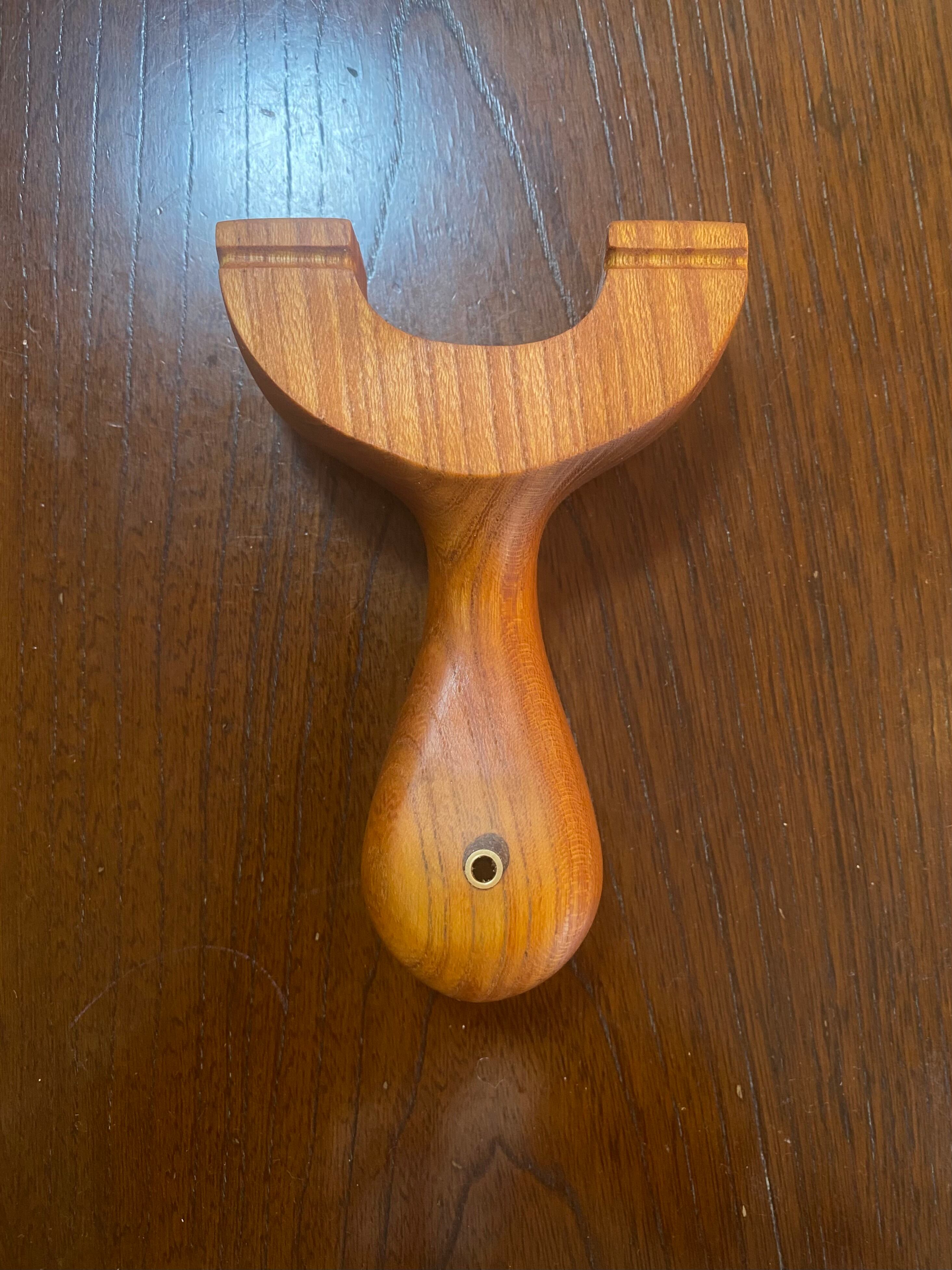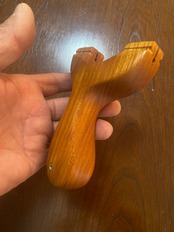 ■ No.933 Fatman(Top slot)Thong holeは、丸みを帯びたふっくらとしたデザインのスリングショットです。優しい握り心地を実現しており、安定感は抜群。丸いハンドルエンドが手のひらにしっかりとフィットし、長時間の使用でも疲れにくいよう設計されています。また、Top slotを備えているため、ゴムの装着も比較的簡単に行えます。美しい欅の木目が、見た目にも楽しさを加えています。ハンドルエンドには落下防止用の細い革紐を通すソング・ホールを備えています。