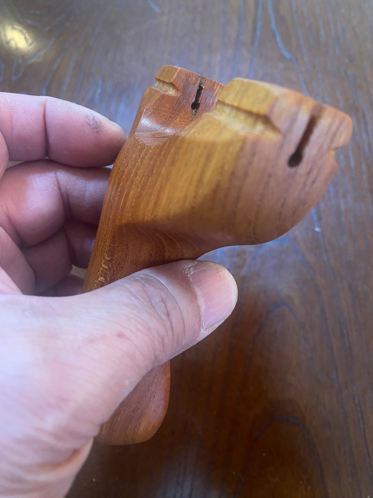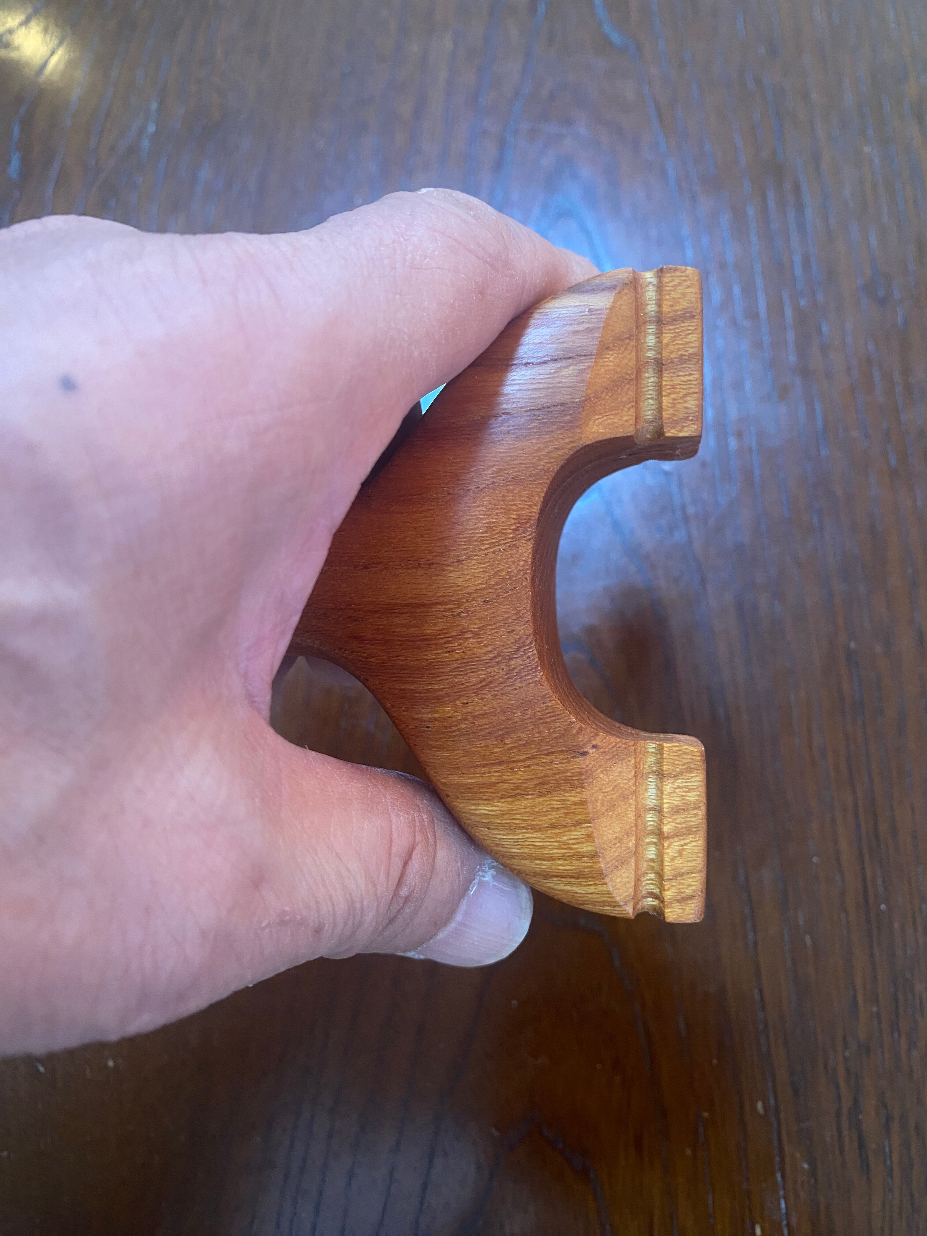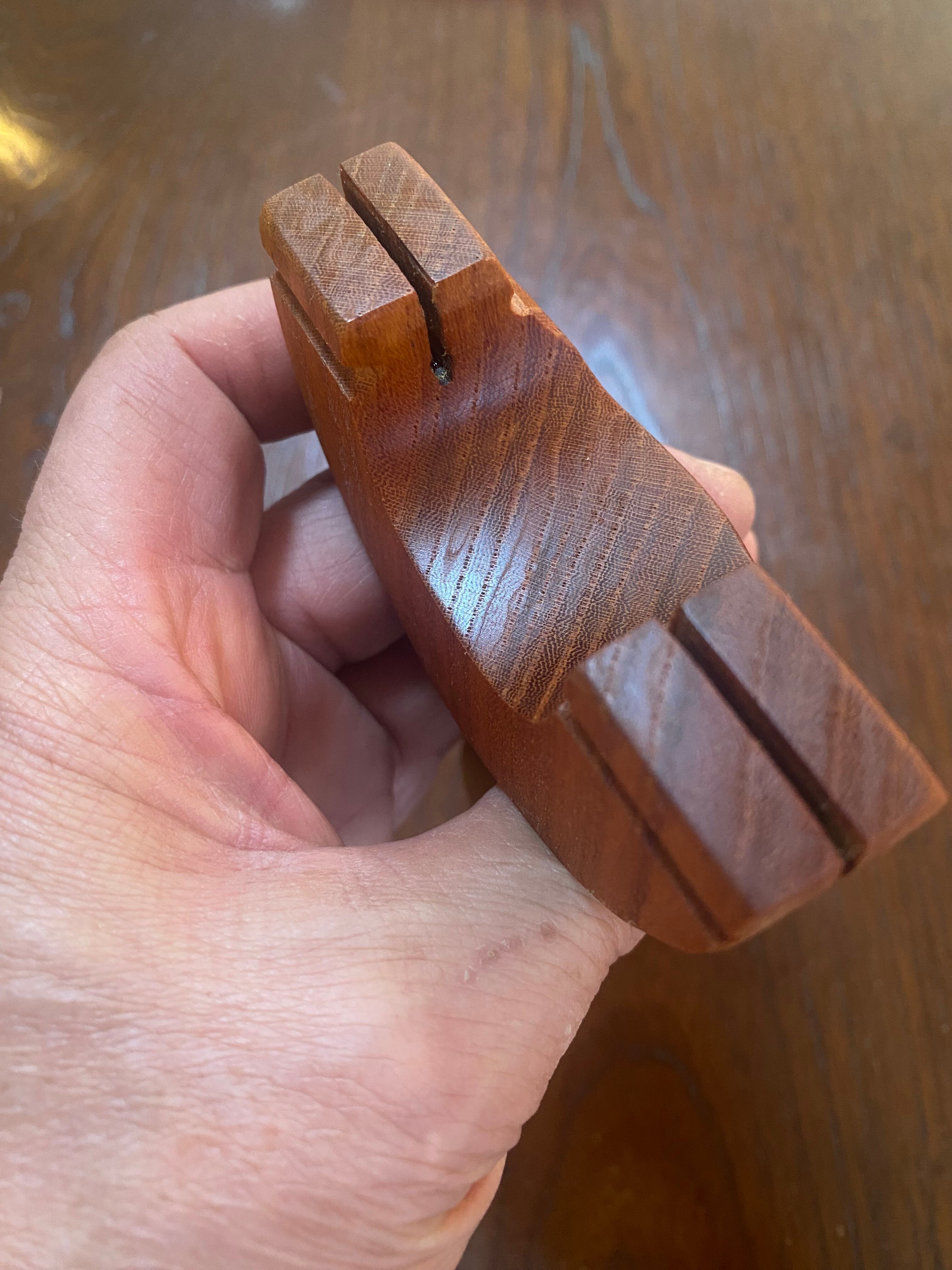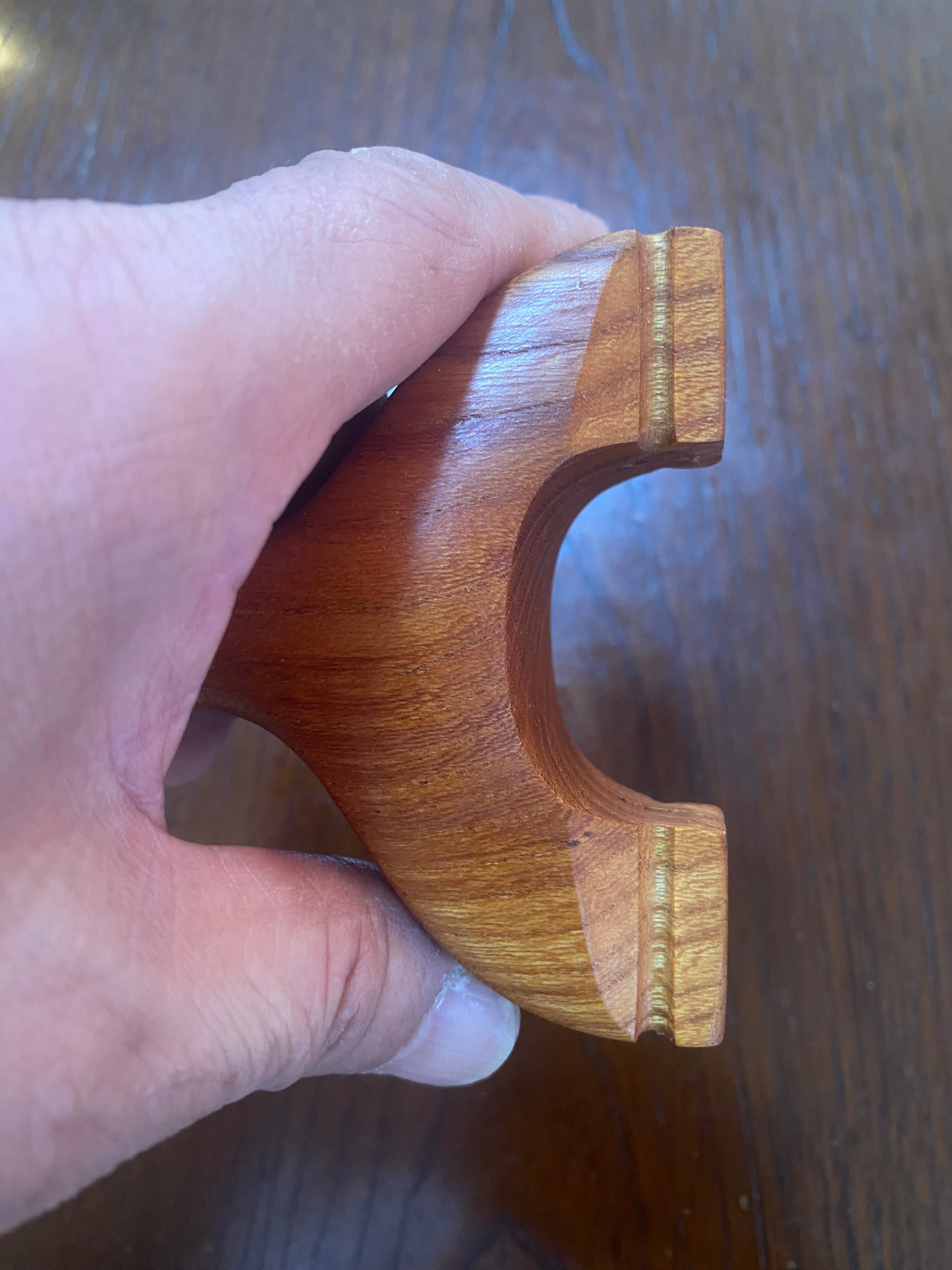 ■ No.933 Fatman(Top slot)Thong holeは、丸みを帯びたふっくらとしたデザインのスリングショットです。優しい握り心地を実現しており、安定感は抜群。丸いハンドルエンドが手のひらにしっかりとフィットし、長時間の使用でも疲れにくいよう設計されています。また、Top slotを備えているため、ゴムの装着も比較的簡単に行えます。美しい欅の木目が、見た目にも楽しさを加えています。ハンドルエンドには落下防止用の細い革紐を通すソング・ホールを備えています。