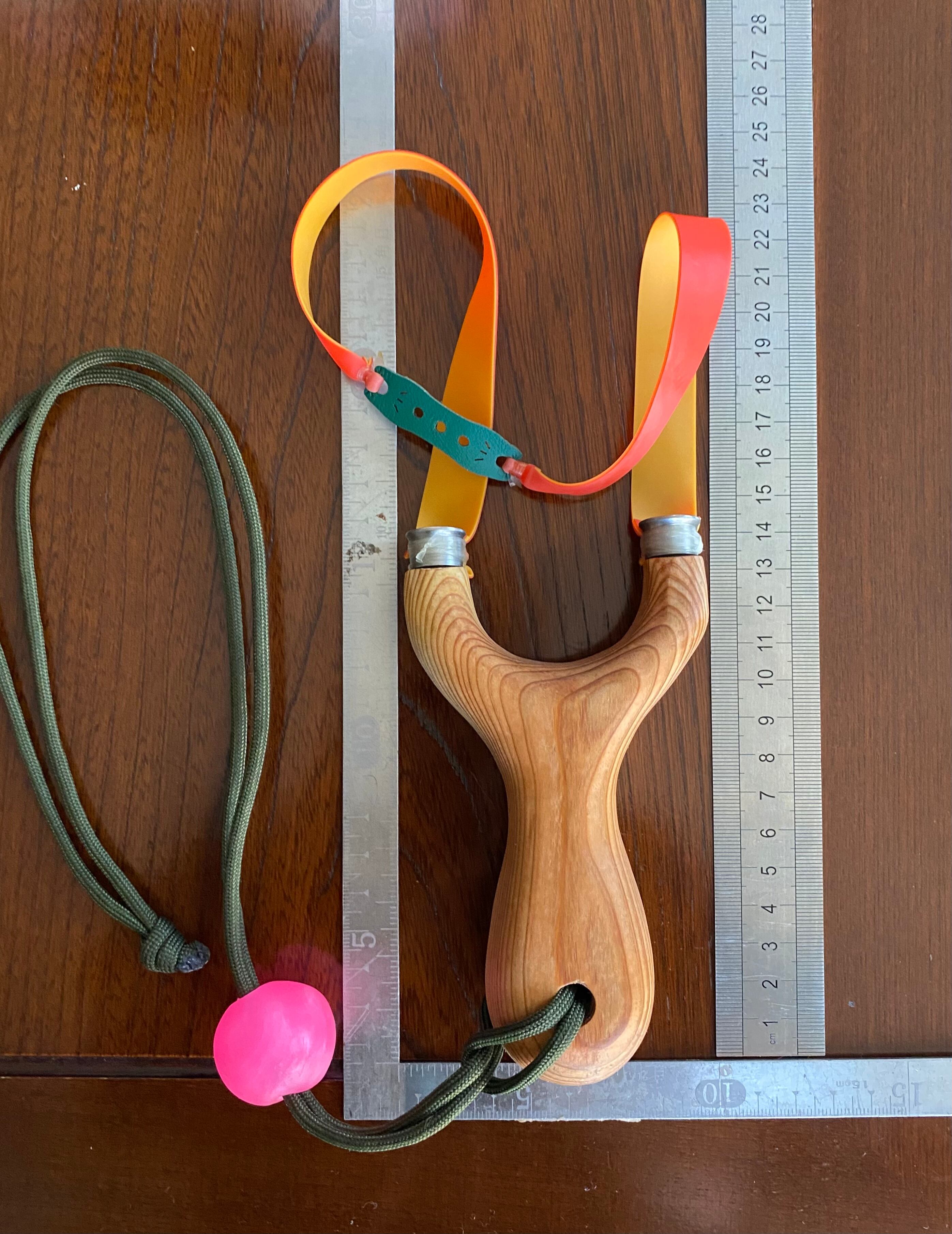 中国風のスタイルのものを小型軽量化した作品です。5つ作った中で一番良くできた物に中国から輸入した金属ヘッド(1000円以上します)を装着し、パラコードとプラ粘土で作った根付を付けたスペシャルバージョンです。平ゴムバンドは1.0mmを装着済みです。
