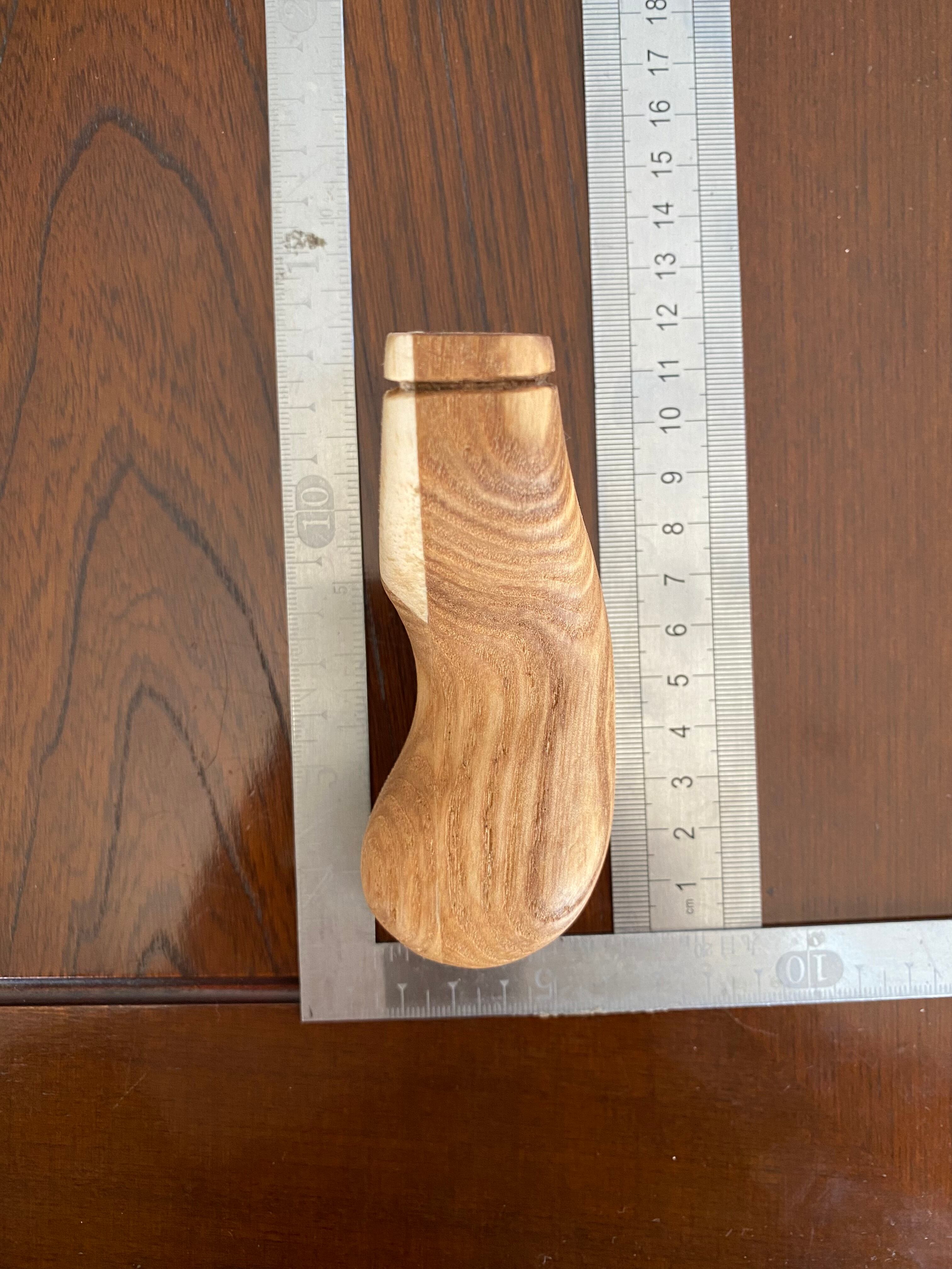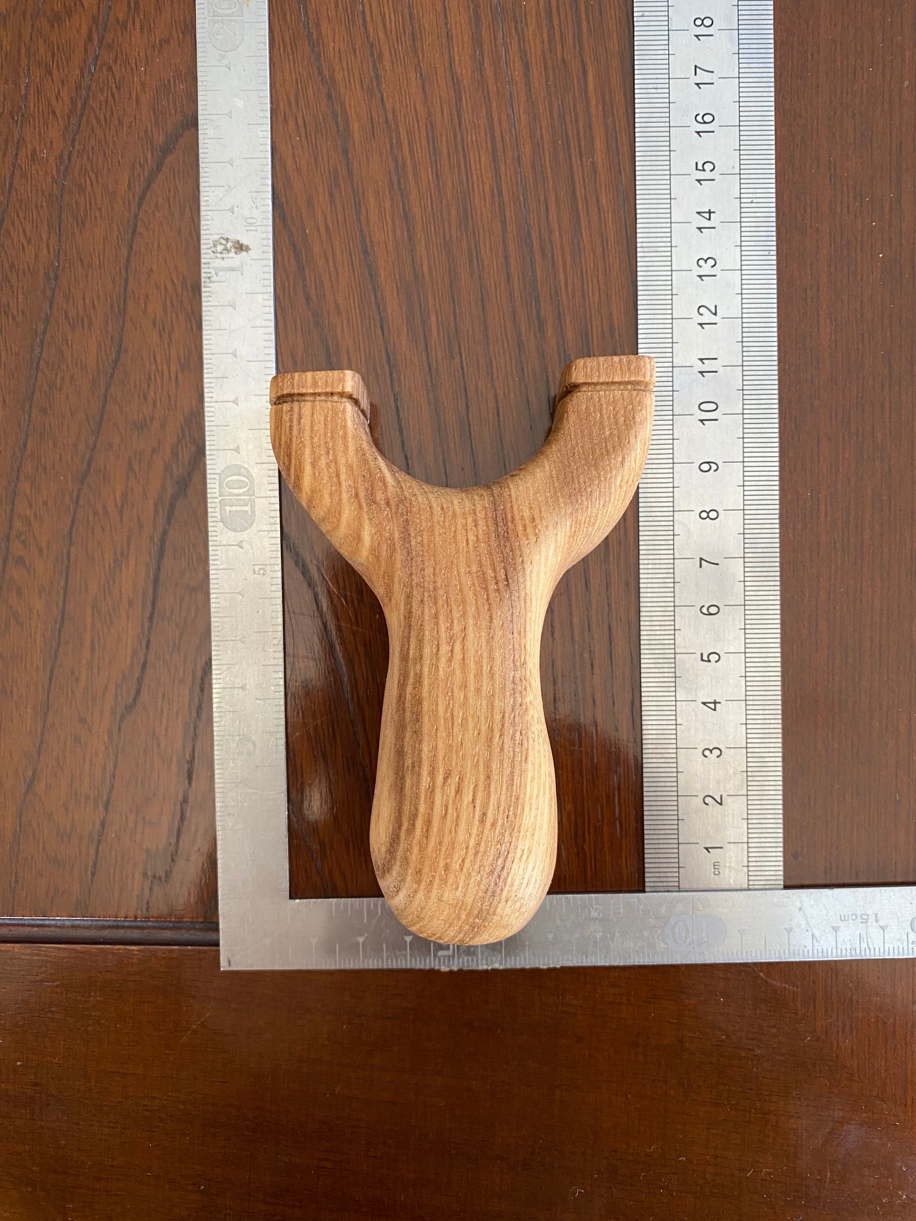 正面から見るとスッキリ。横から見ると後ろに滑り止めの反りがある小型のスリング ショットです。タモ材を使用しています。