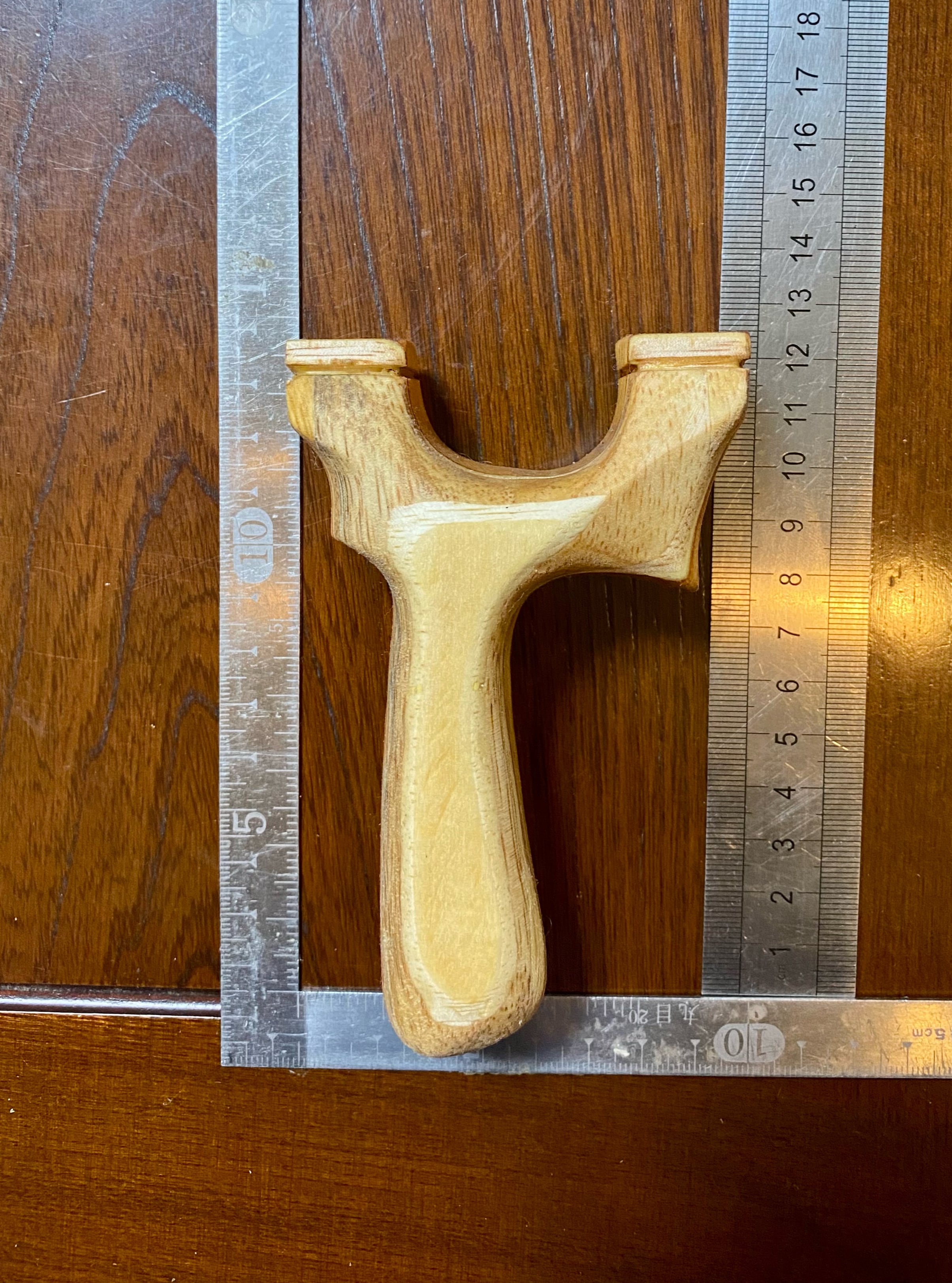 親指で抑えやすくするために非対称型にしたスリングショットです。これは左利き用です。