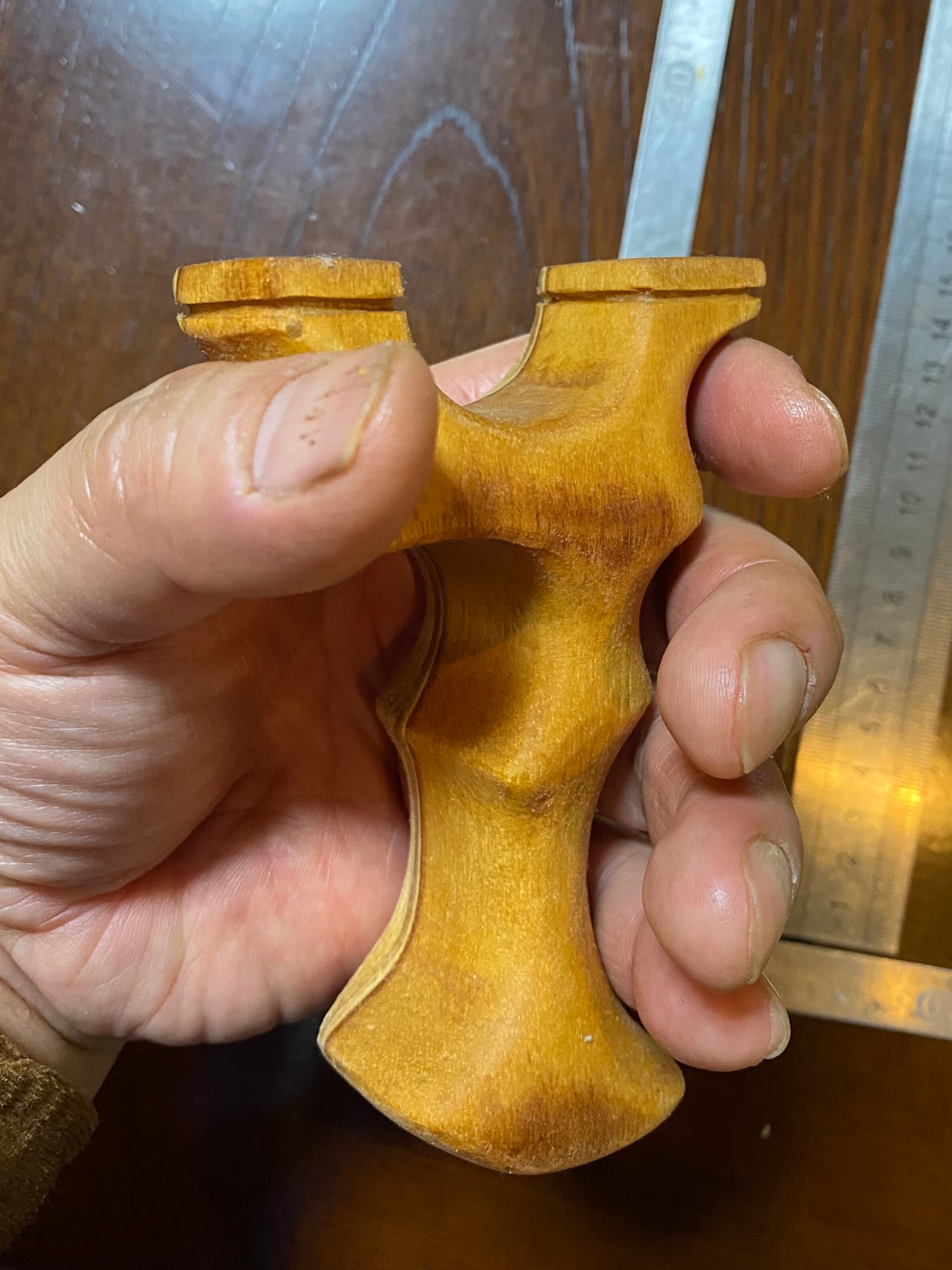 見た目インパクトのある面白い形のスリングショットです。手にスッポリと収まり、すっぽ抜けることはまずありません。蜜蝋仕上げ。