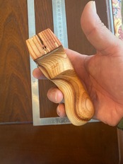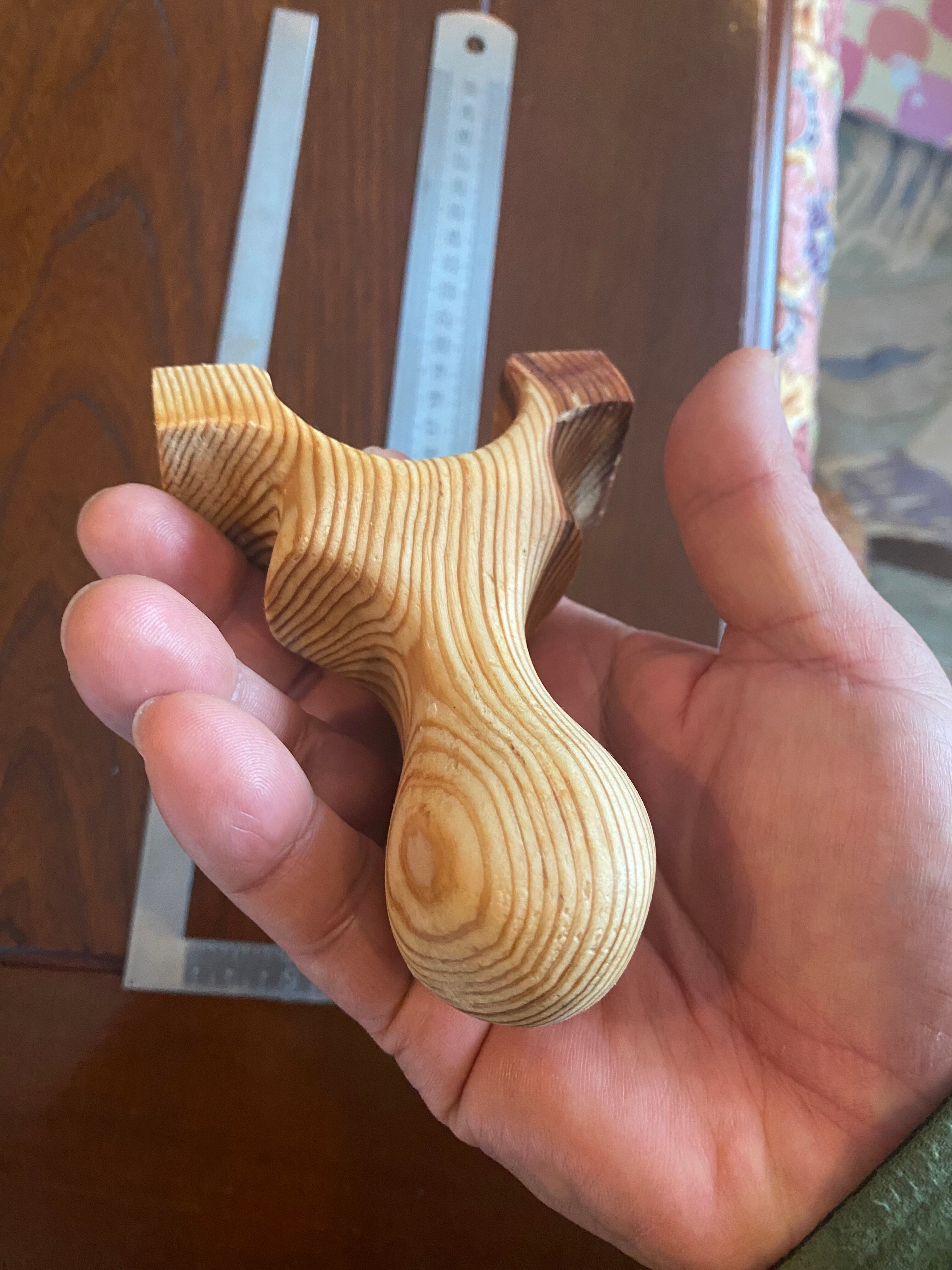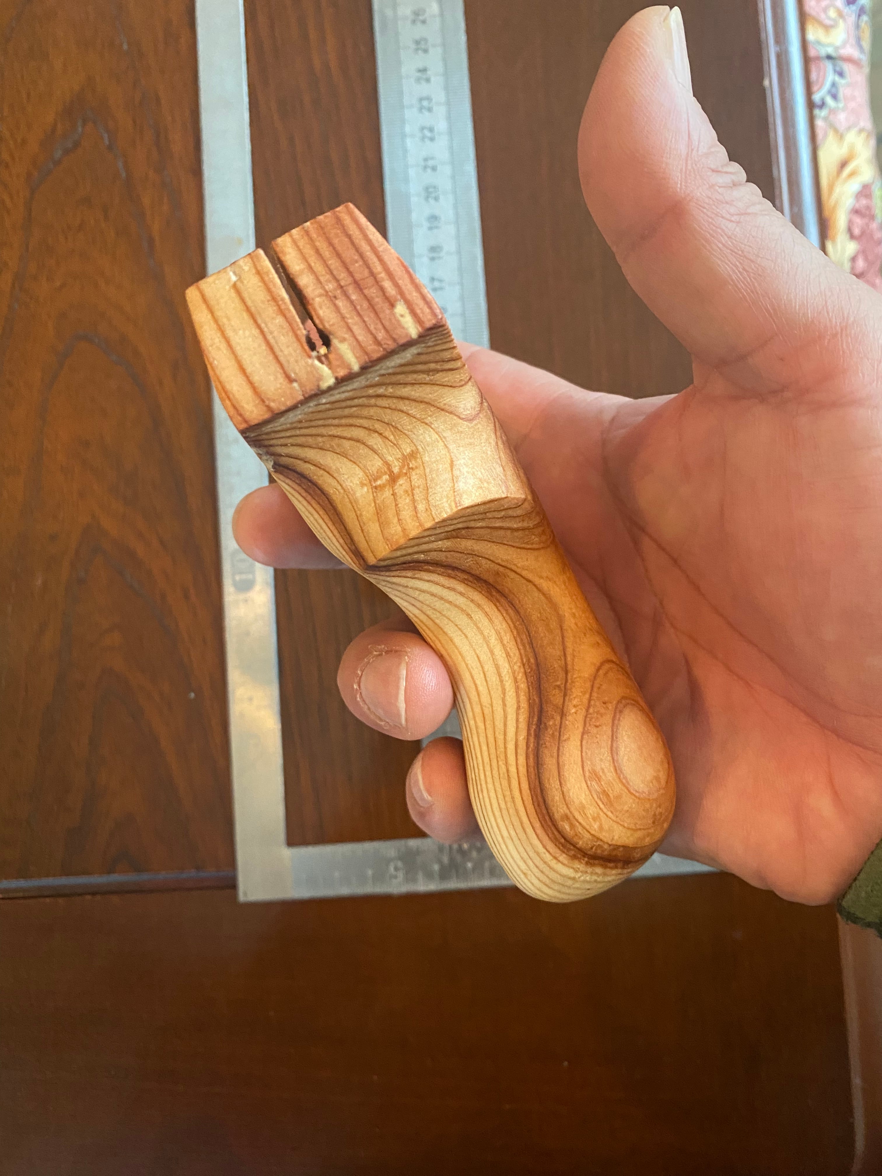 杉の一枚板を使った木目の綺麗なスリングショットです。作成時に少し逆剥けが発生し(写真⑦参考)、穴埋め修理を行いましたので、価格を安くします。使用にあたってはまったく問題ないと思います。