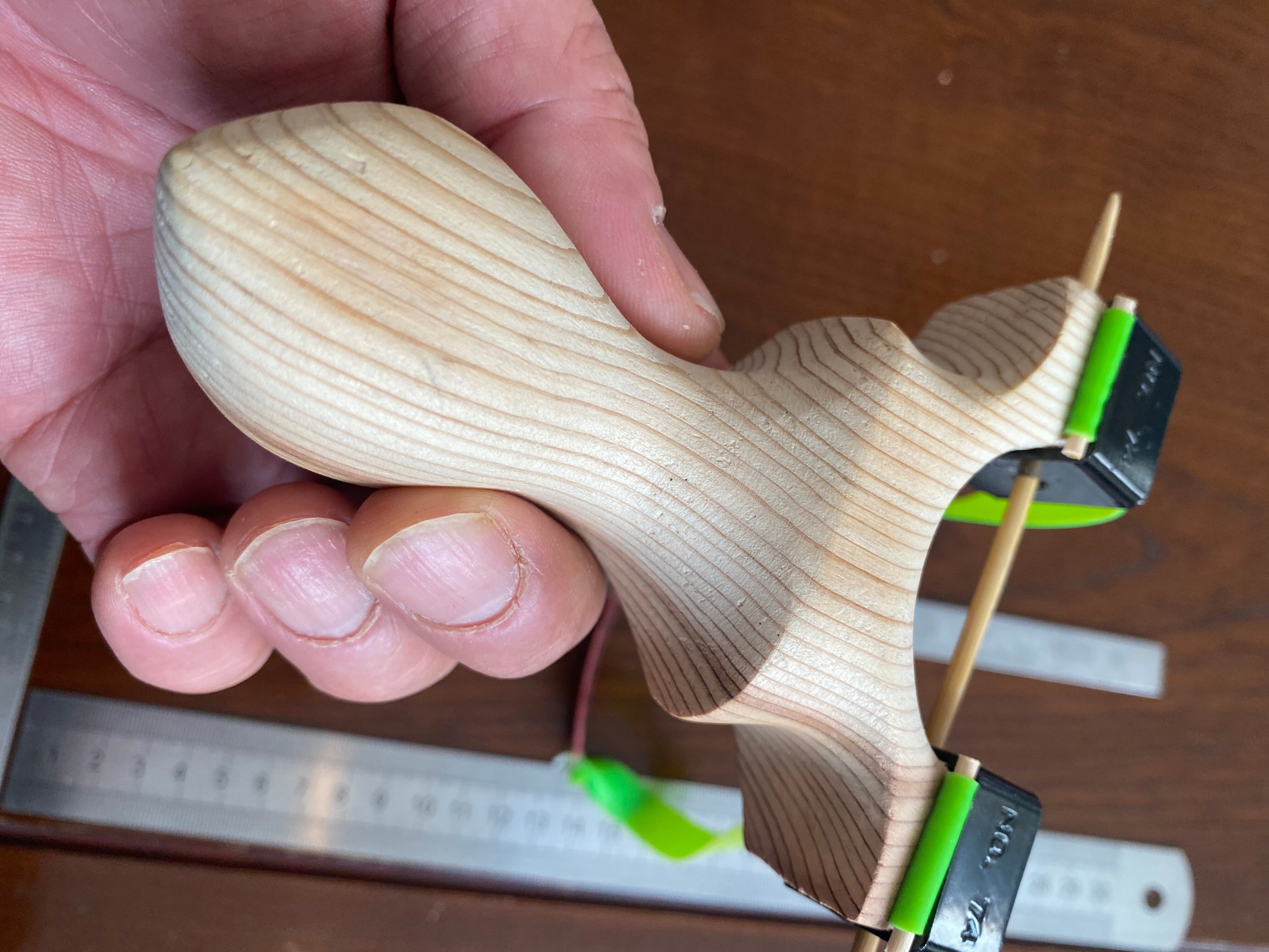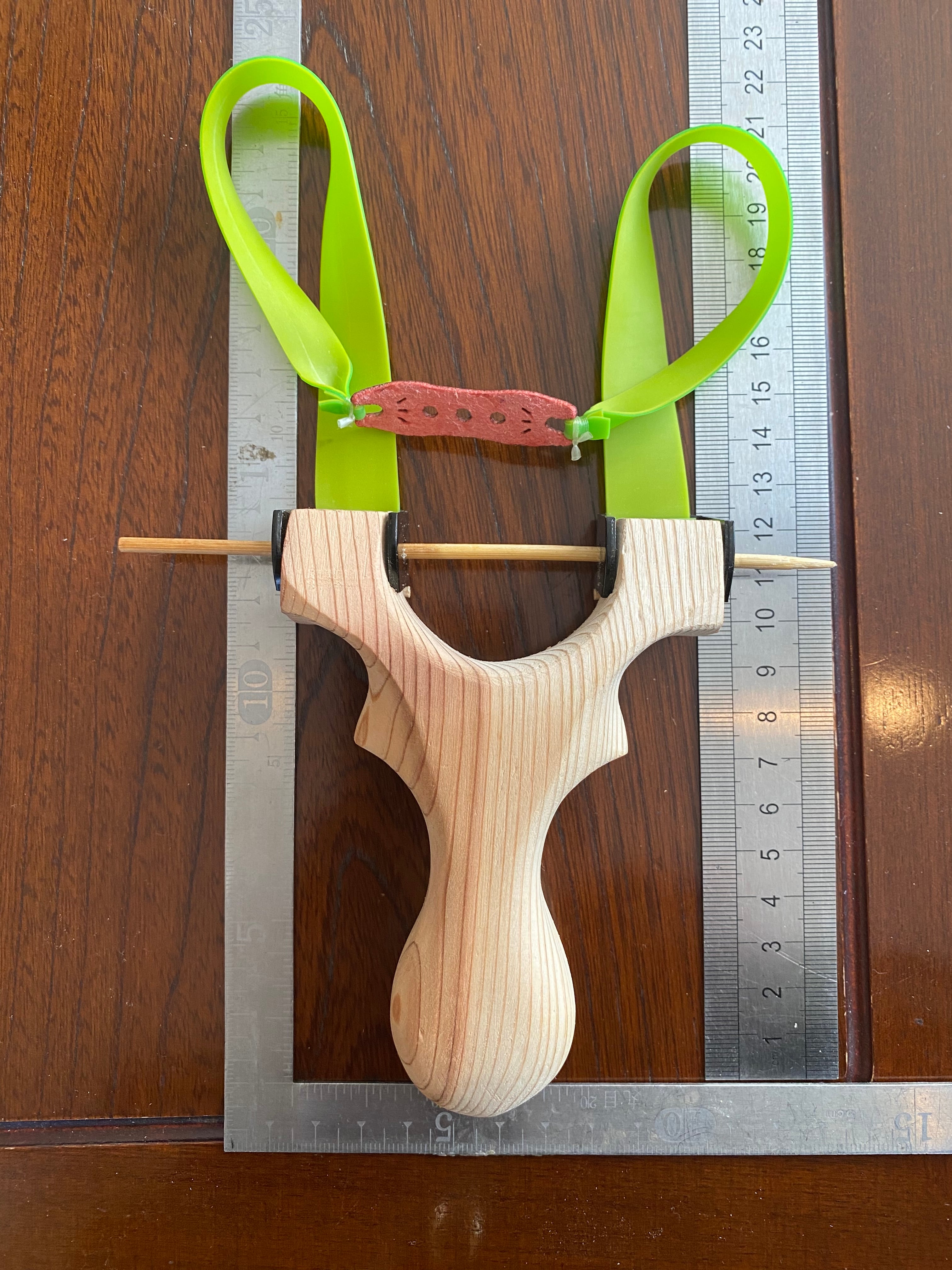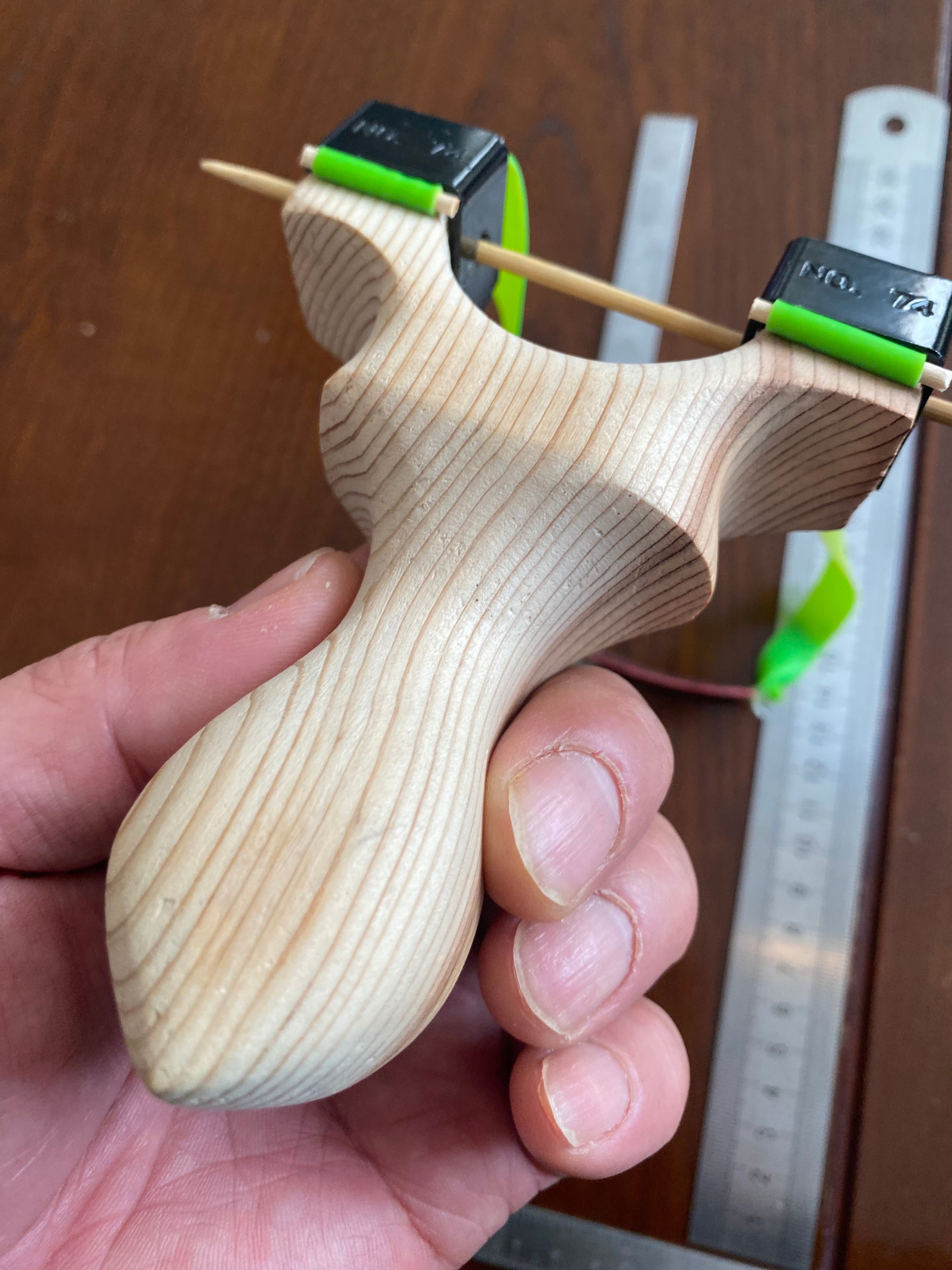 平ゴムの取り付けが苦手な方のために考えた金具で固定できるように作ったスリングショットです。金具を一旦外し折り曲げたゴムを挟み金具を仮止め。ゴムの折り曲げ部に楊枝を差し込んでからゴムを引っ張り金具をしっかりと固定(横棒を差し込むだけ)すれば完了です。横棒はボルトにも交換可能です。