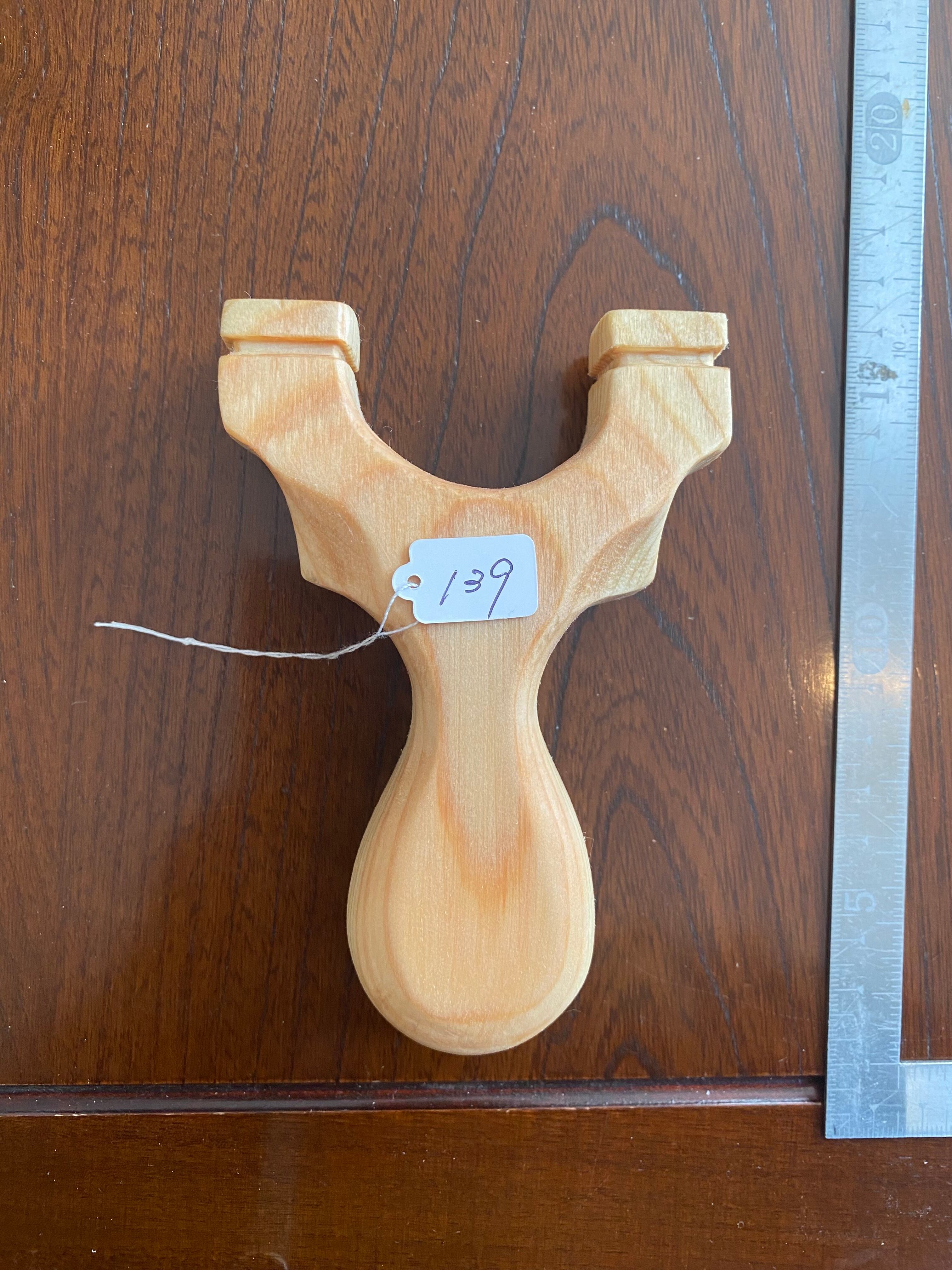 杉材で作った木目の綺麗なスリングショットです。平ゴムを取り付けやすい四角のヘッド。本体の角度を固定しやすいエラ付き。握りやすくすっぽ抜けの無い丸エンドハンドル。全体的に握りやすいアーチ構造です。