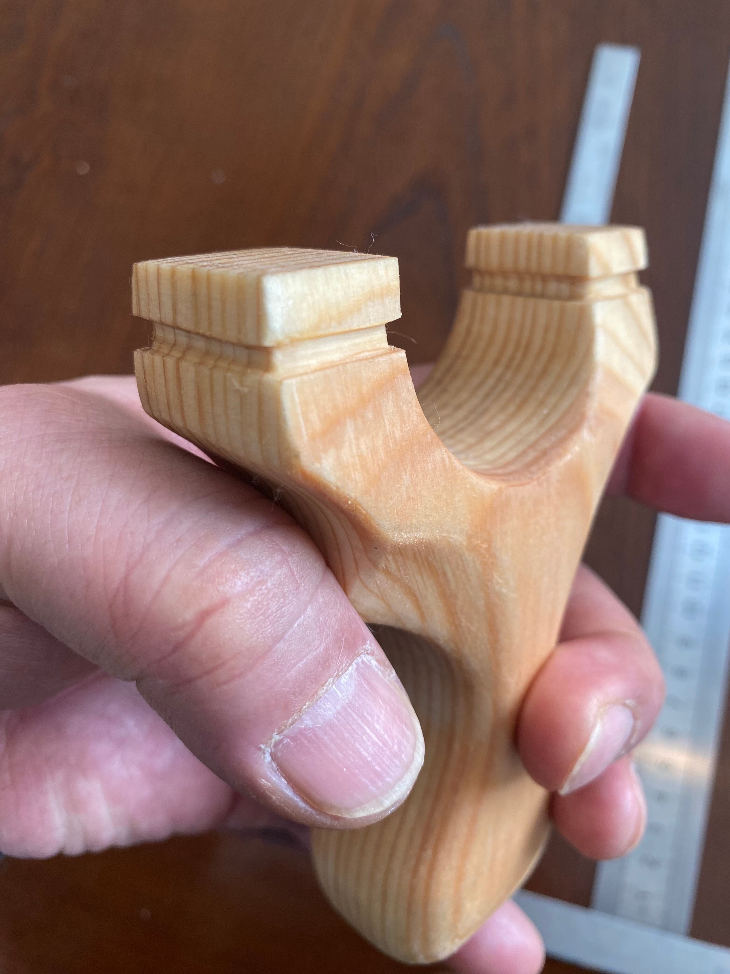 杉材で作った木目の綺麗なスリングショットです。平ゴムを取り付けやすい四角のヘッド。本体の角度を固定しやすいエラ付き。握りやすくすっぽ抜けの無い丸エンドハンドル。全体的に握りやすいアーチ構造です。