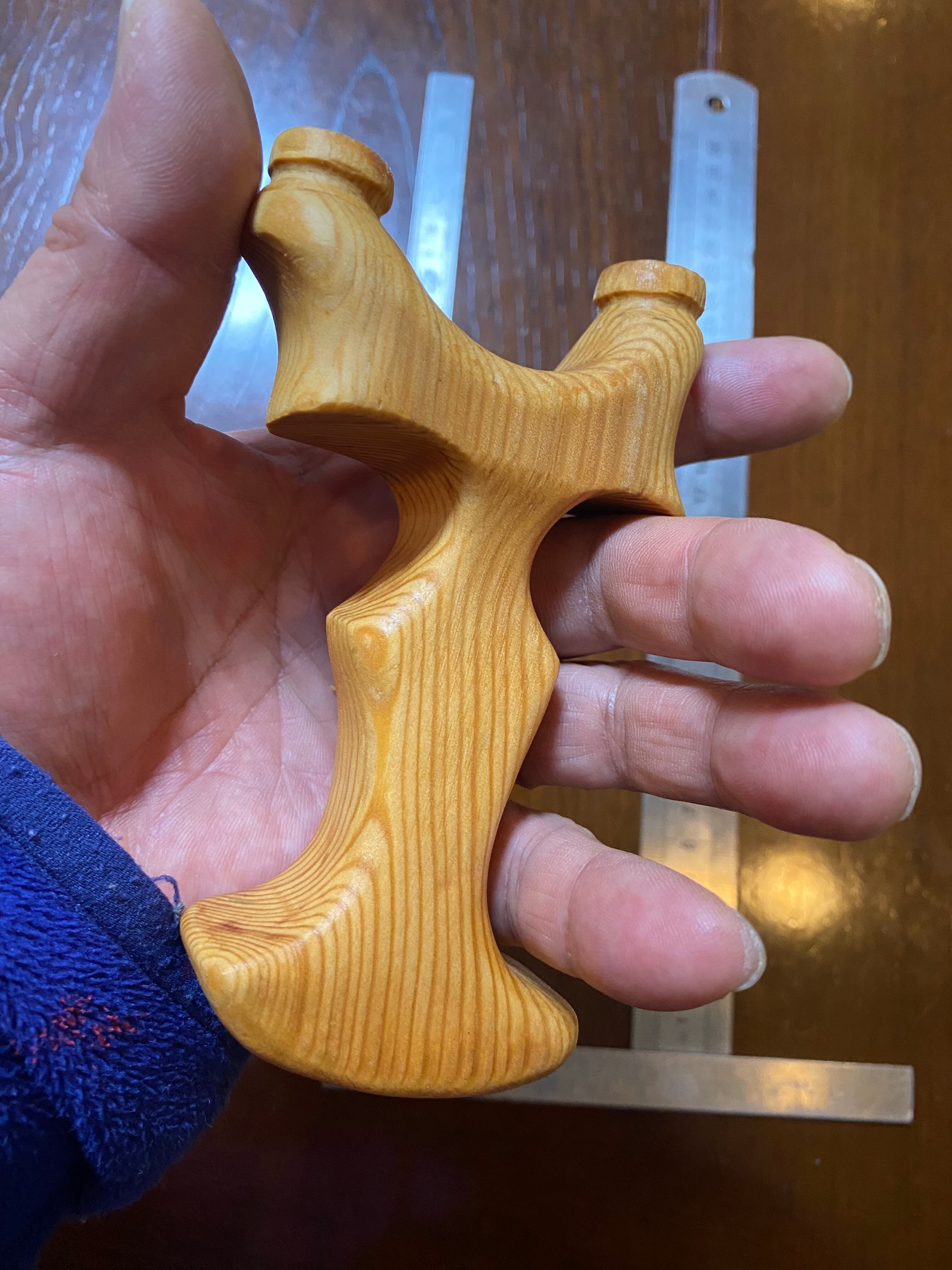 底掌側に丸みを持たせ、指先側は深く握れるようにアーチ状に変形させたスリングショットです。