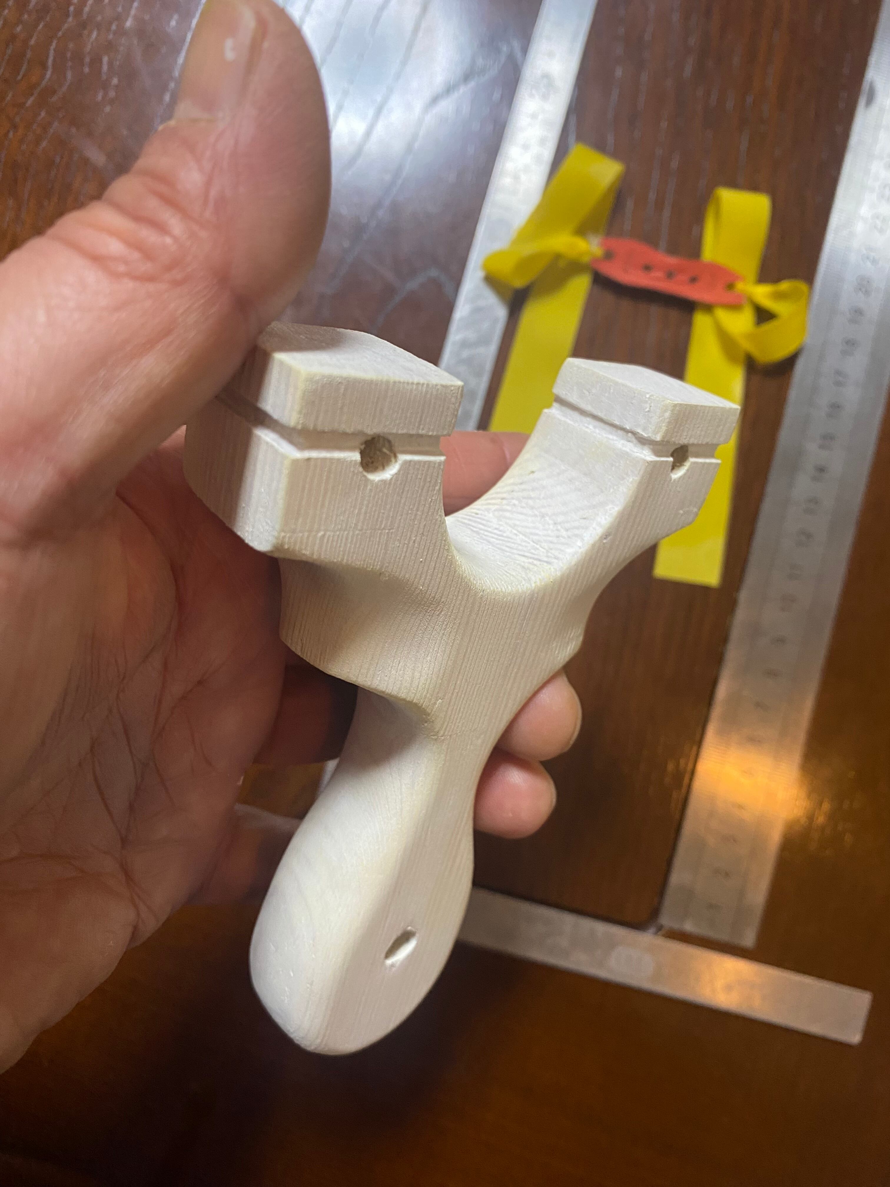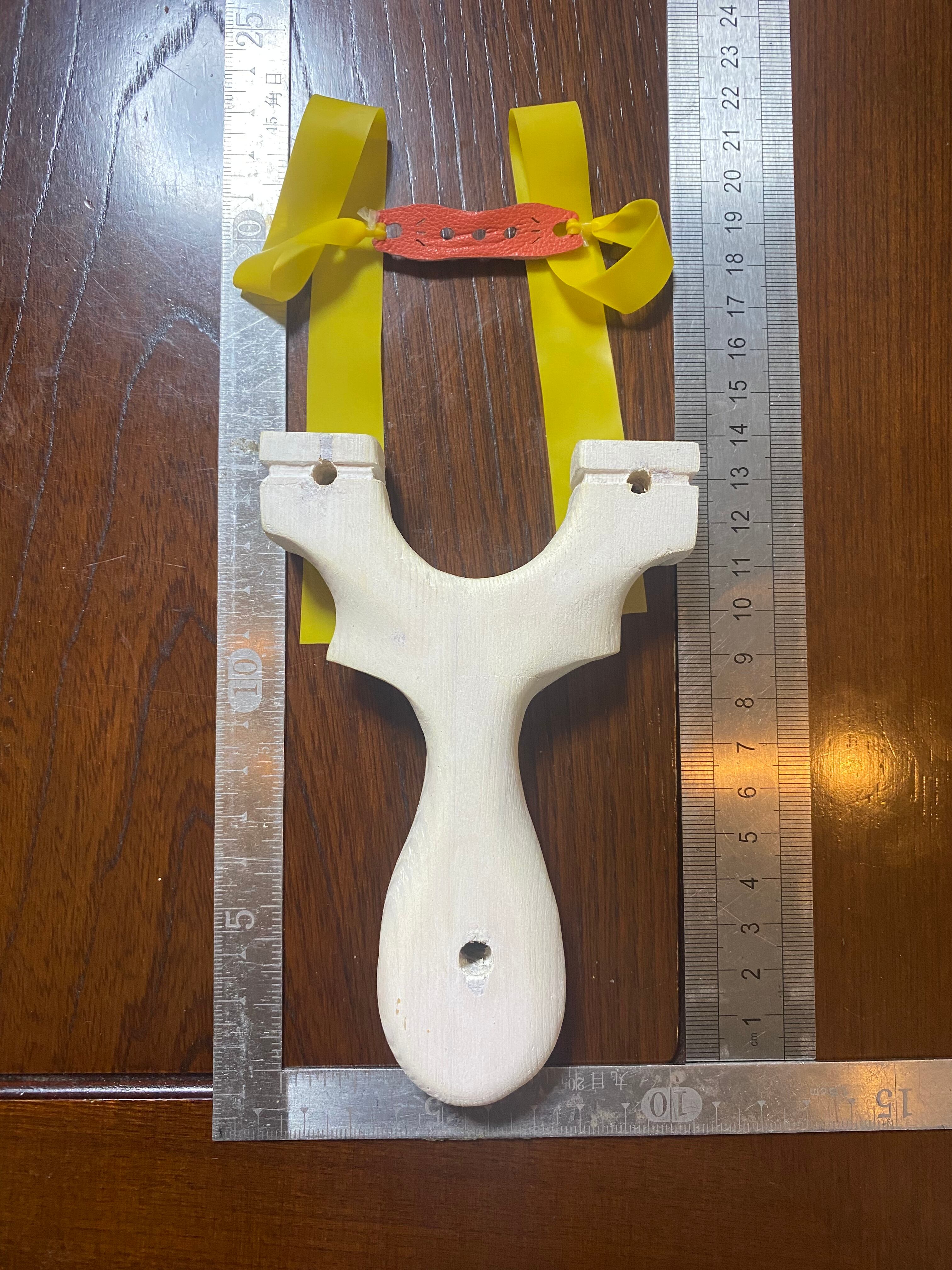 板から切り抜いて角を丸め白色を塗っただけの簡単なスリングショットです。初心者にピッタリです。裏表同じ形で想像以上に持ちやすく、的にも当てやすいです。