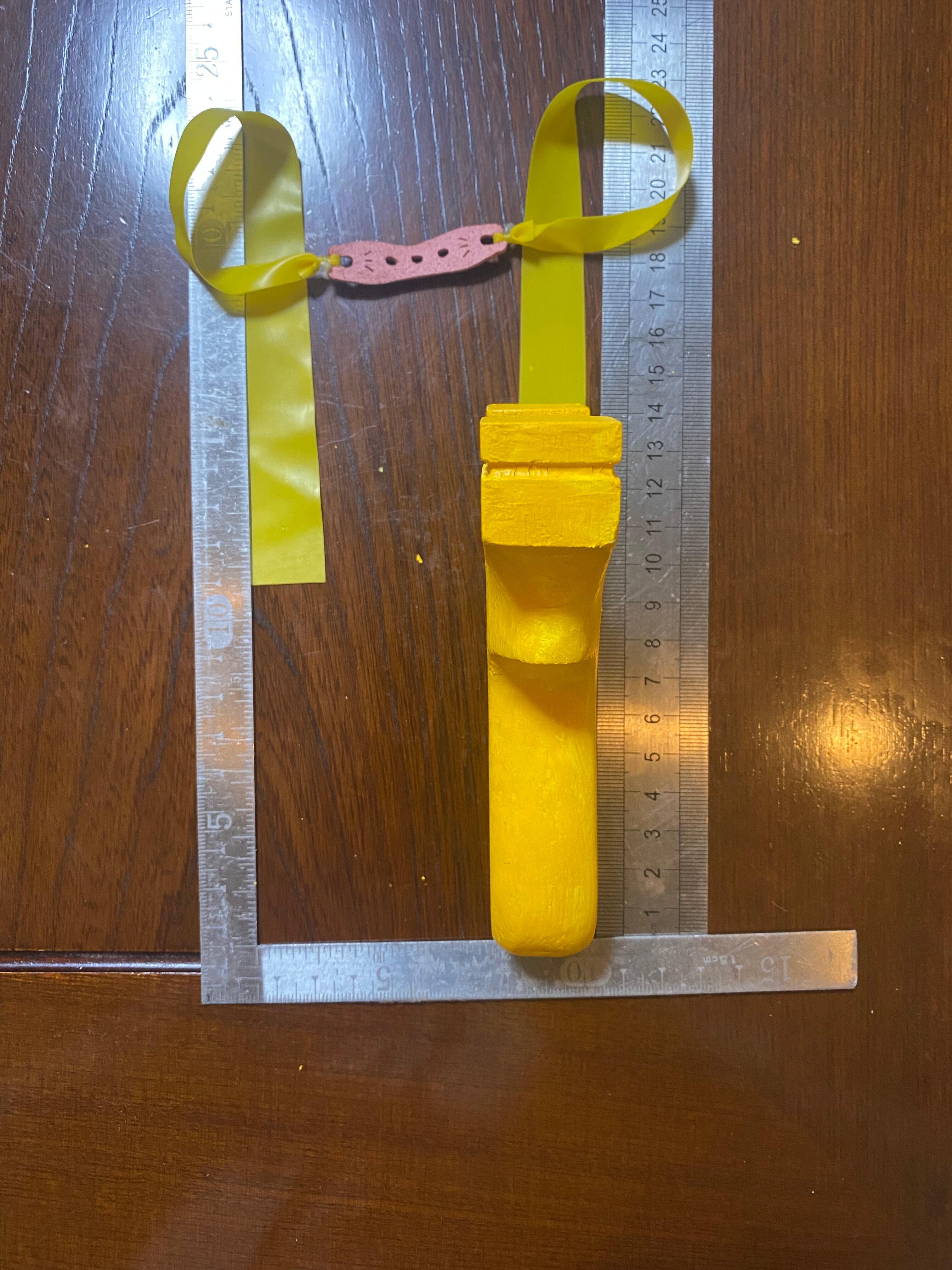 板から切り抜いて角を丸め黄色を塗っただけの簡単なスリングショットです。初心者にピッタリです。裏表同じ形で想像以上に持ちやすく、的にも当てやすいです。