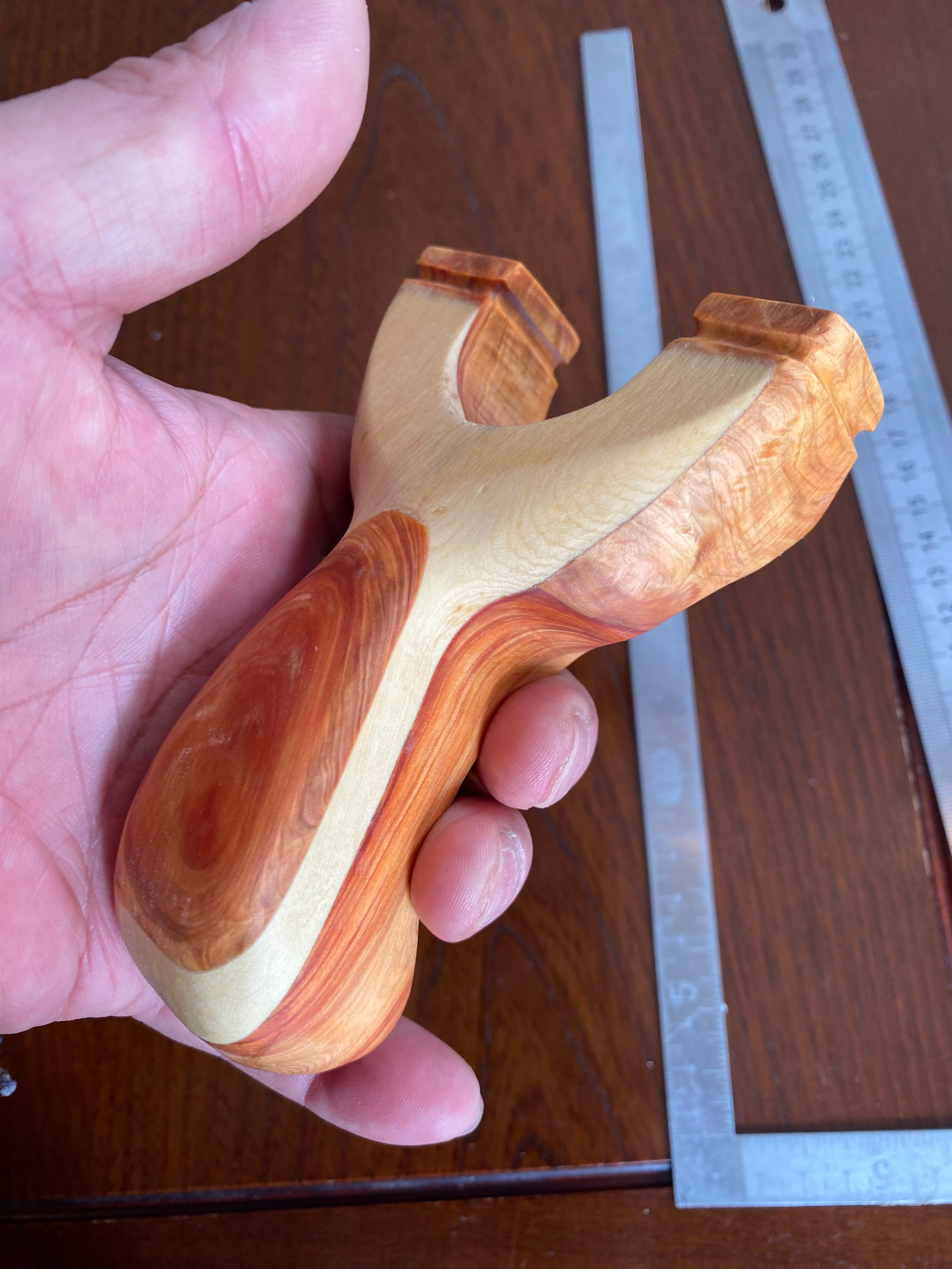 おそらく2度と手に入らないであろうファットウッドで作ったスリングショットです。深くヘッド持ちをされる方にピッタリです。微妙な色合いがよくわかるように白い木と組み合わせた積層デザインです。