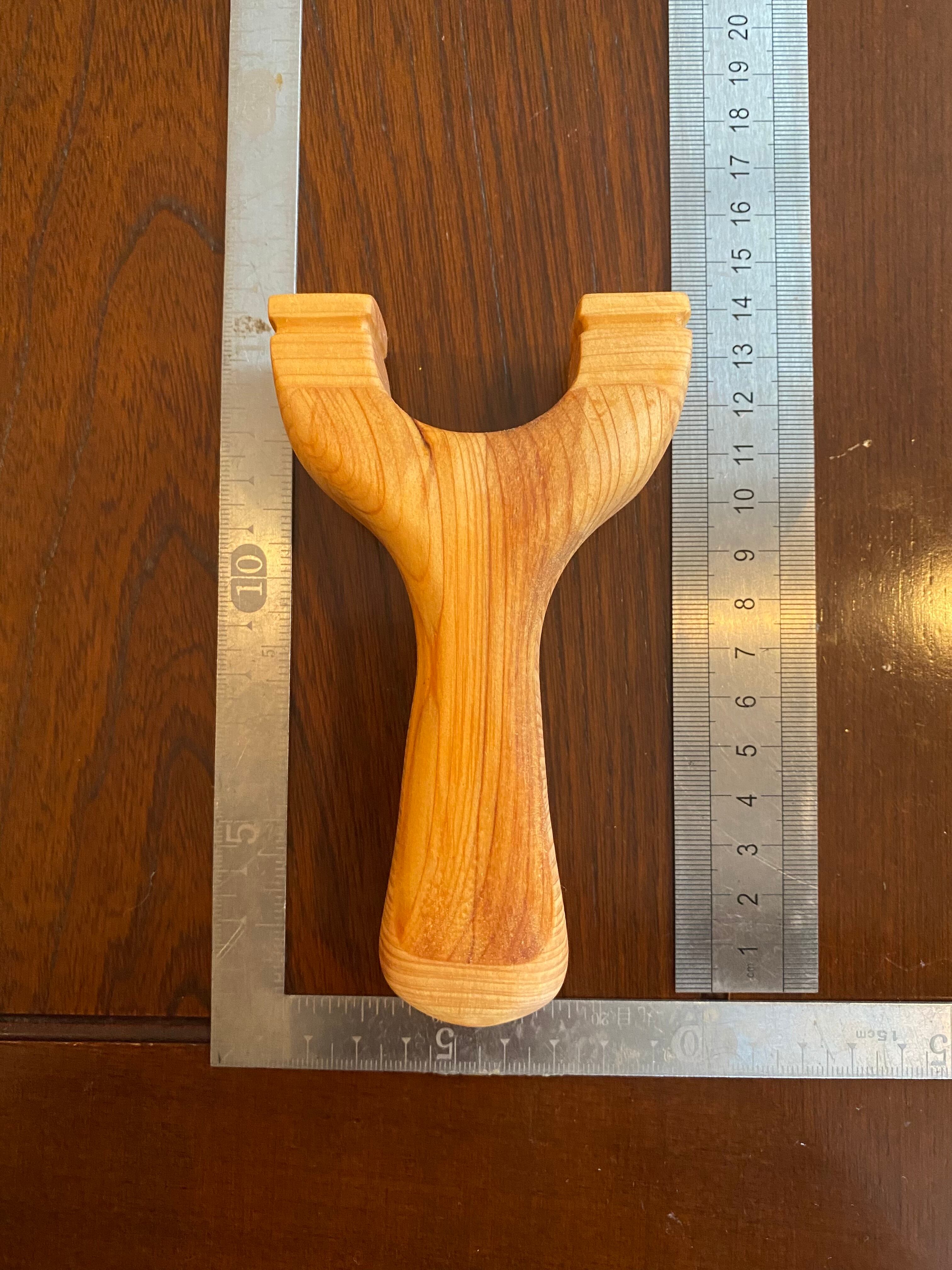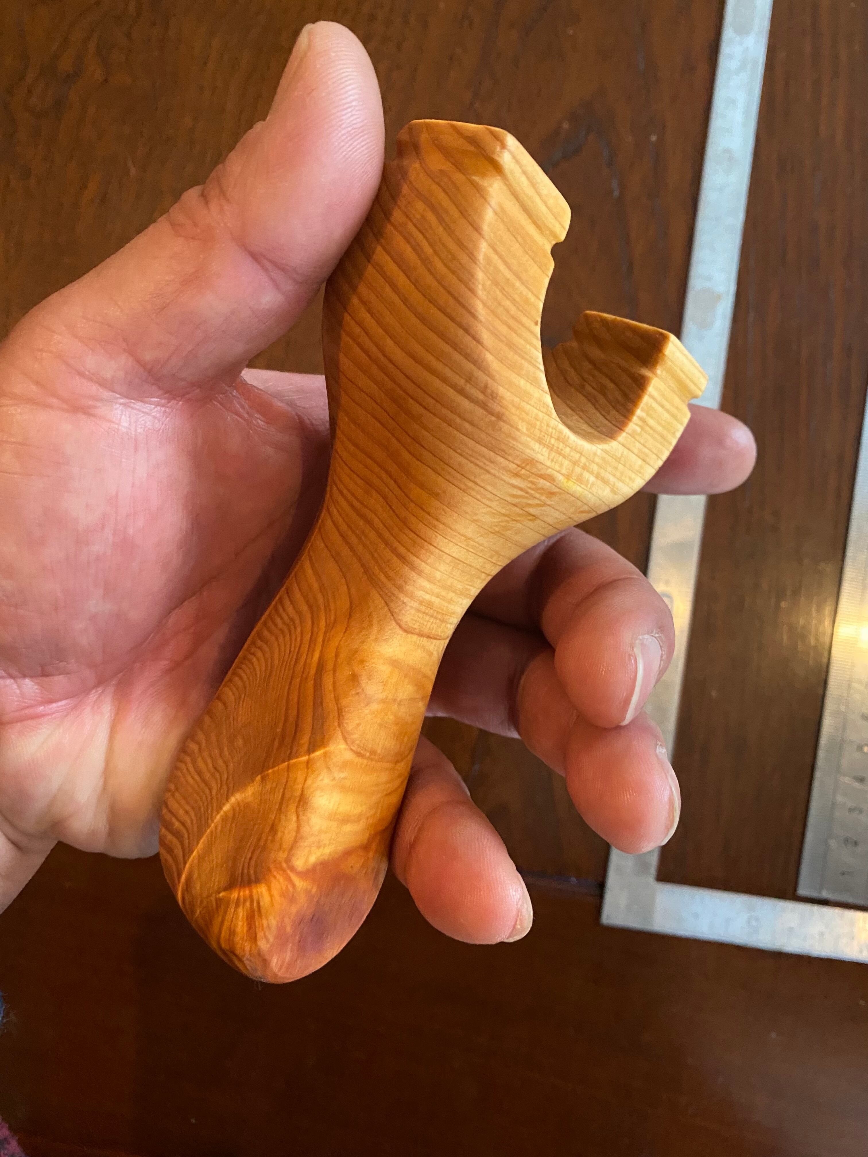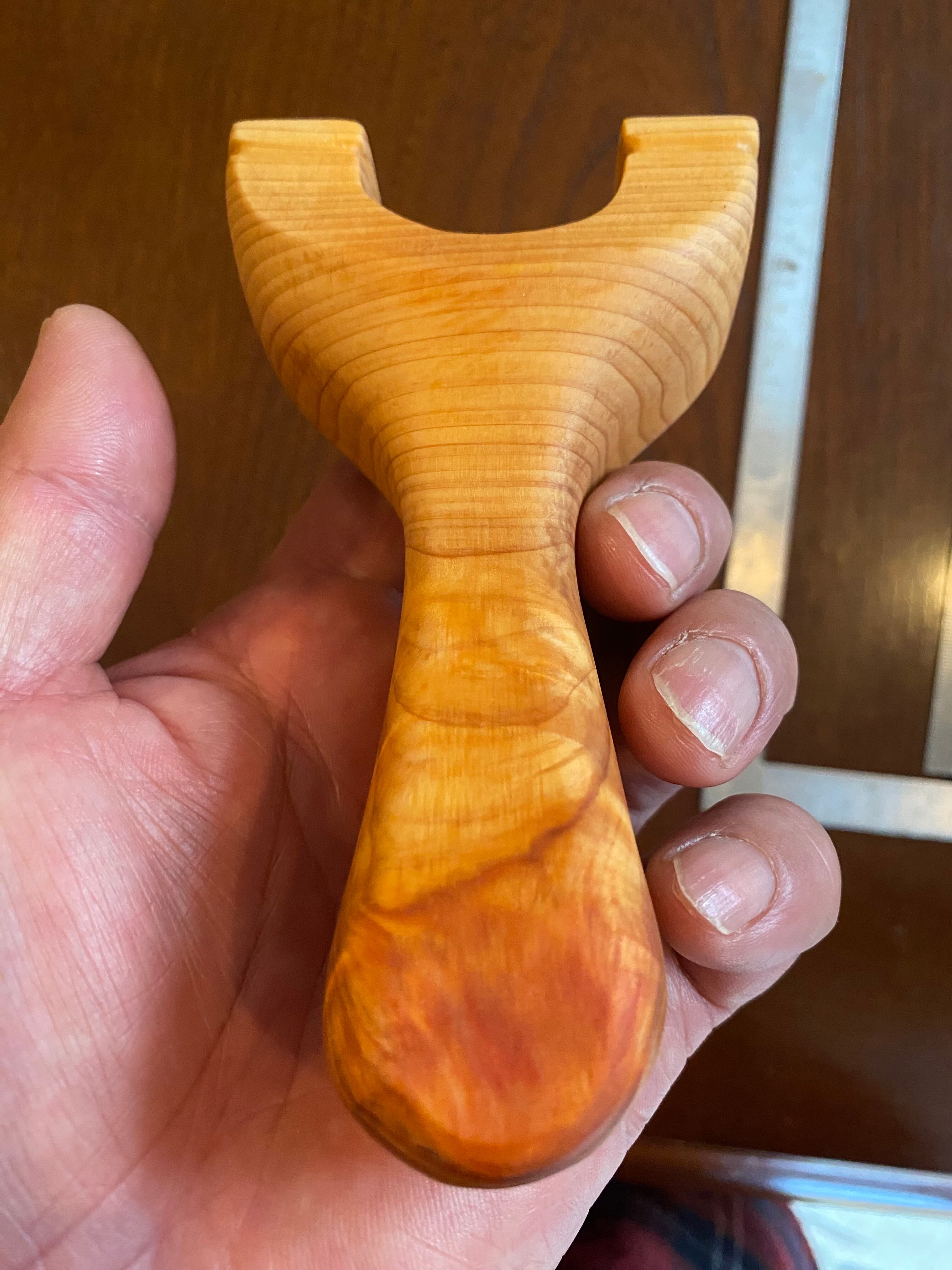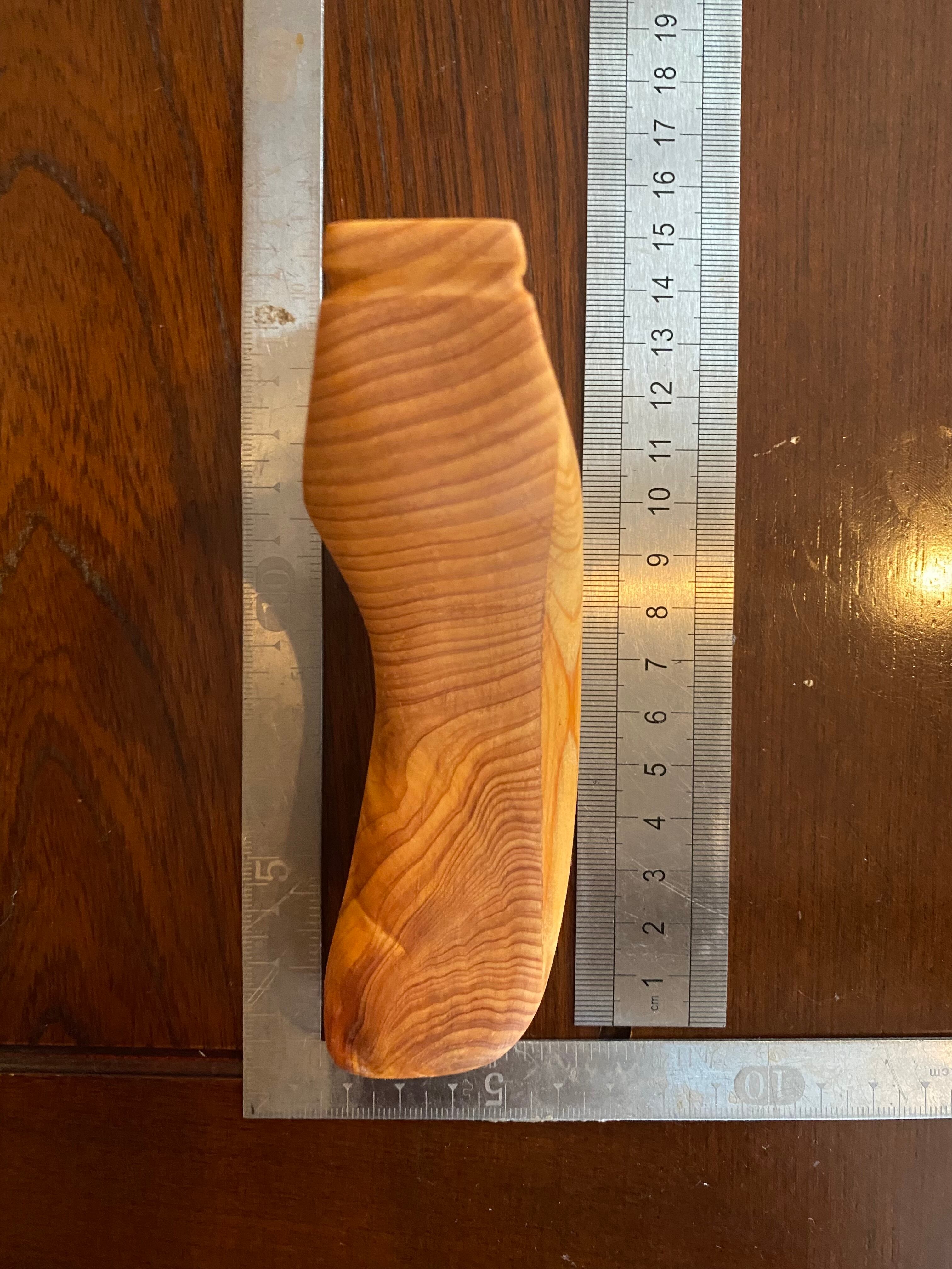 ファットウッドになりかけの木に縮み木が連続して続いている部分から切り出した希少価値の高い作品です。庵野Ⅱ型ラウンドタイプでハンドルエンドを丸めにしました。フォーク部分は光によって白だったり茶色だったりします。ハンドルエンドはファットウッドです。