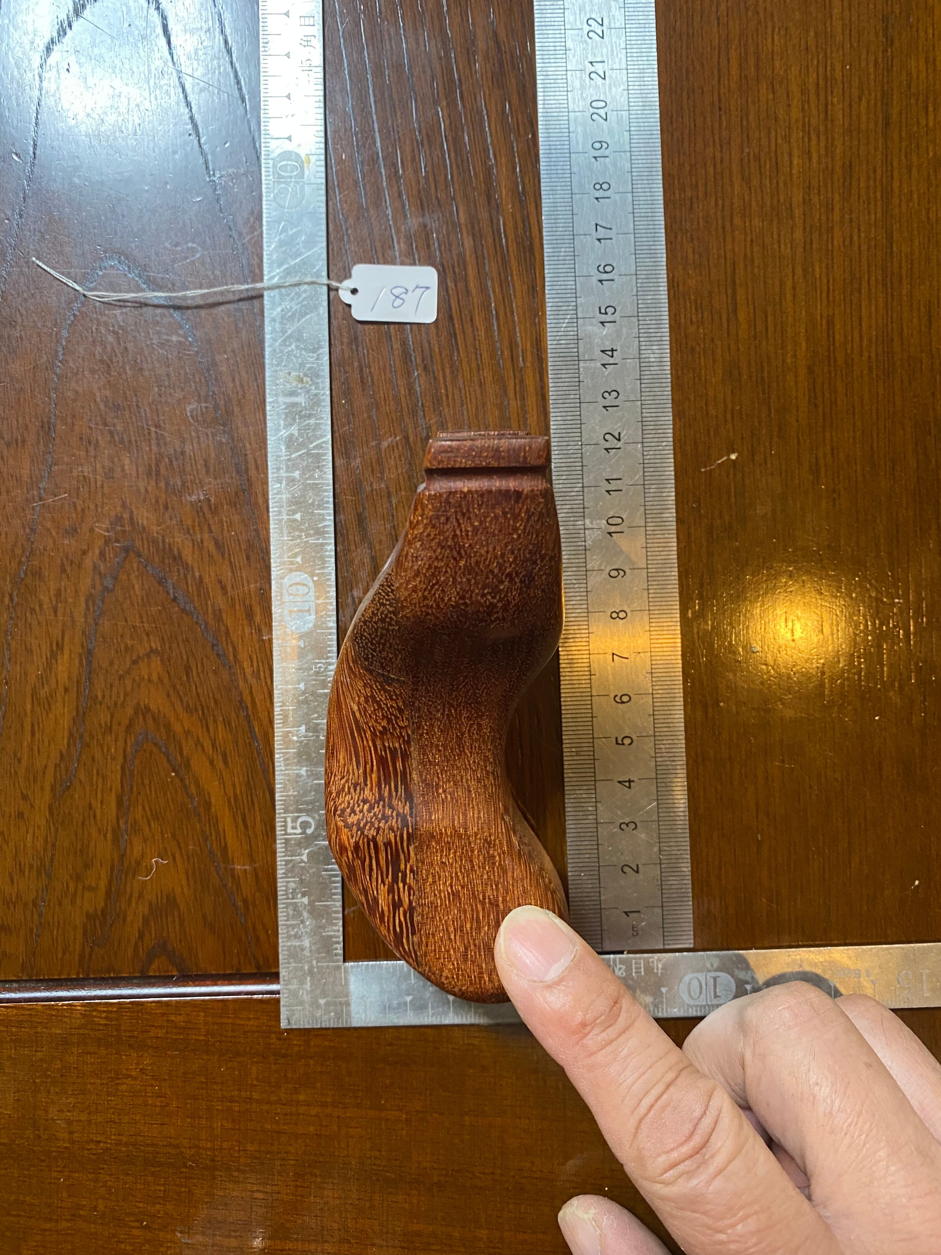 鉄刀木?と思われる焦茶色の硬い木を接着し、厚みを出して女性らしいラインの前後の厚みのある作品に仕上げました。ハンドルを二段にし滑り止めの機能を持たせています。サンドペーパーで2000番まで磨き、蜜蝋を染み込ませて仕上げてあります。どこから見ても丸みがあり愛らしい作品です。