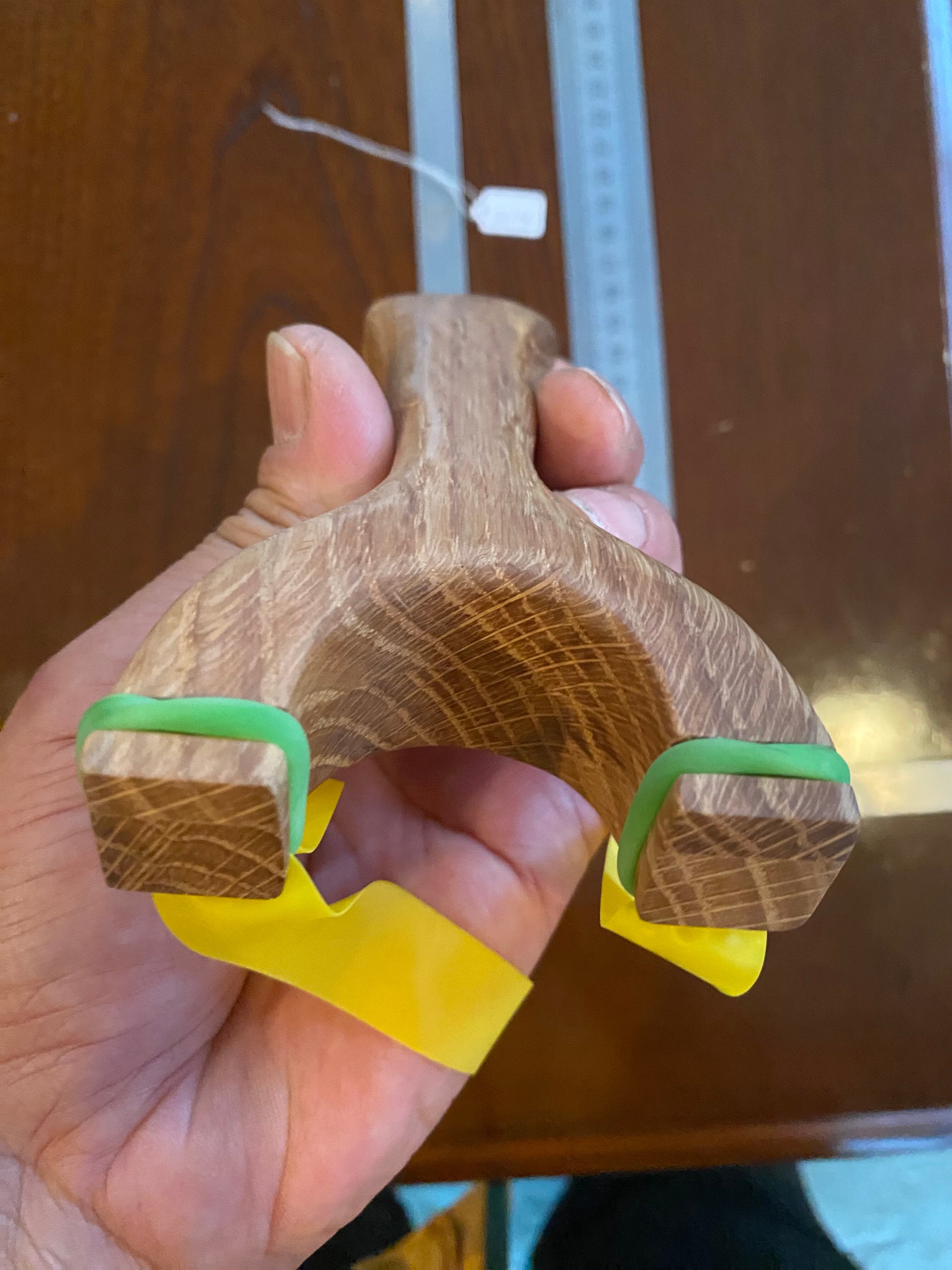 硬くて重いタモと思われる材料で作った庵野II型丸のカタパルト(発射装置)です。ハンドルは滑り止め機能のある2段ハンドルです。厚みを3分の2に抑えた軽量タイプです。