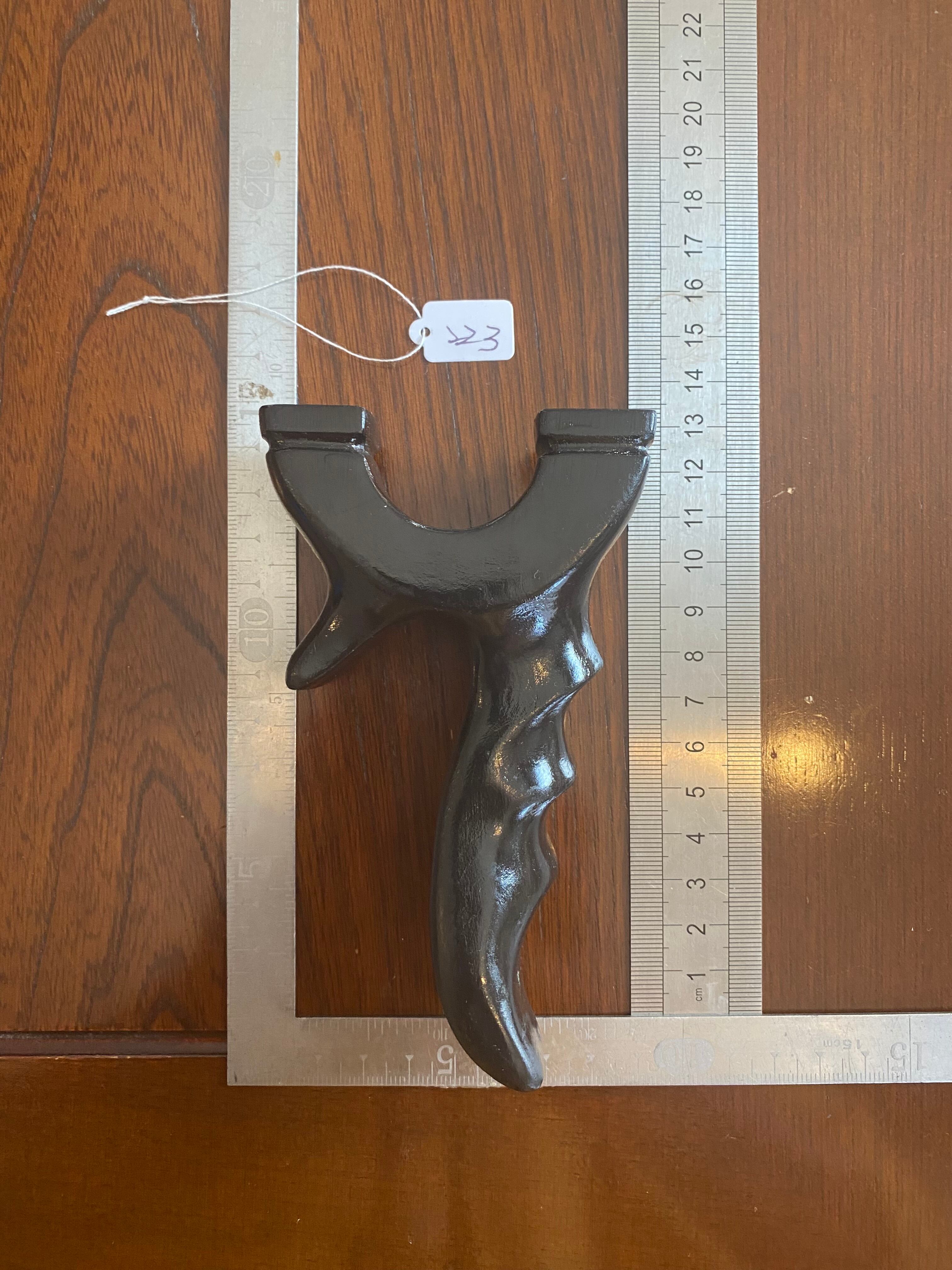 y字型の軽量 反り有り 黒のスリングショットです。黒のアクリル絵の具で塗装した後に透明のニススプレーをかけてあります。右利き用です。完璧を求められる方はご遠慮下さい。飛距離テストに使用したタイプの上級の物で、仰角40度くらいで最低約105mを肉眼で確認しています。