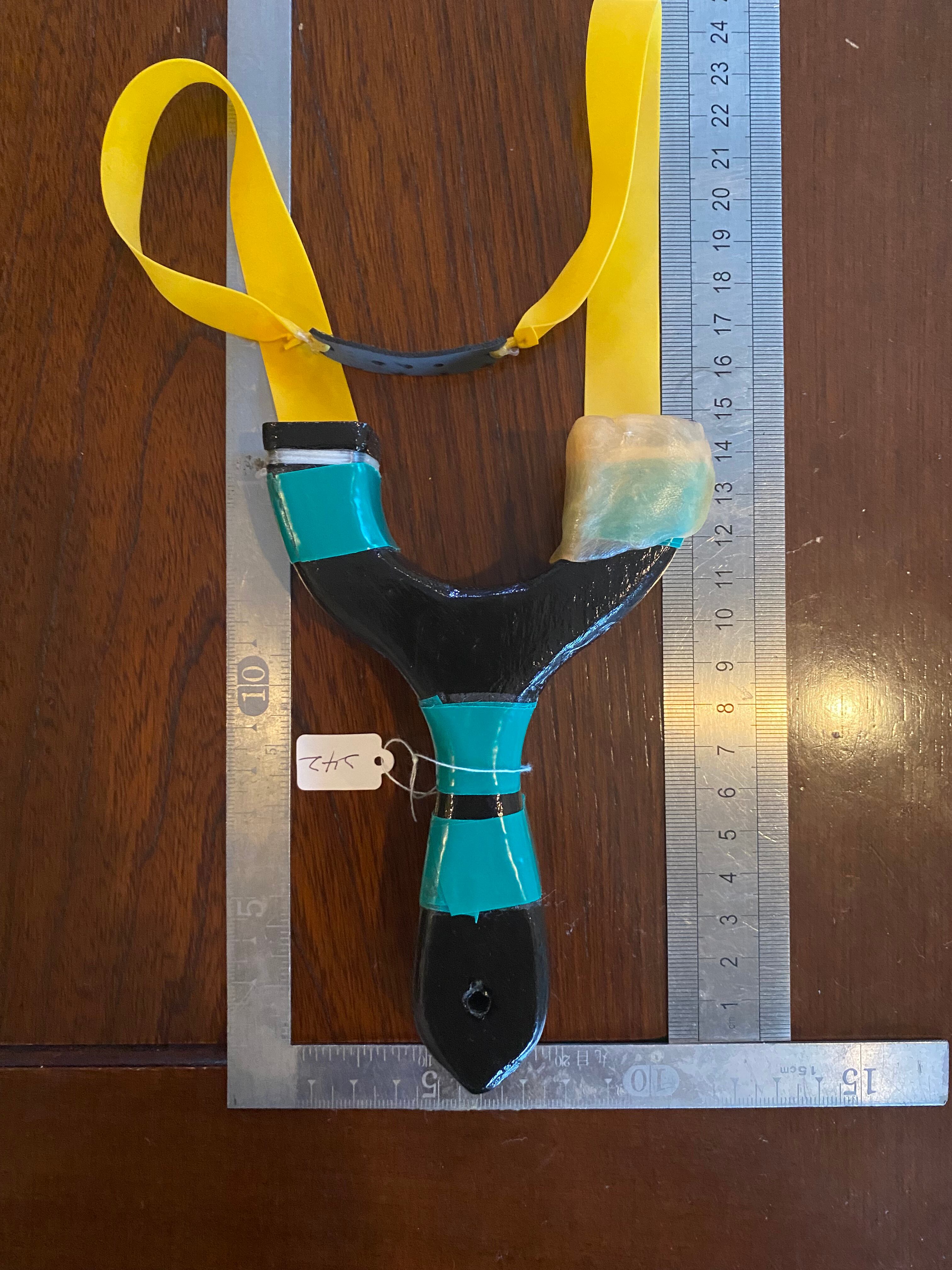 初心者用平型のアーチ(ヘッドの間)を広くし、フレームヒットしにくい形状のスリングショットです。さらに黒色塗装・緑のテープ・ヘッド保護の柔軟プラスチックを装着した物です。